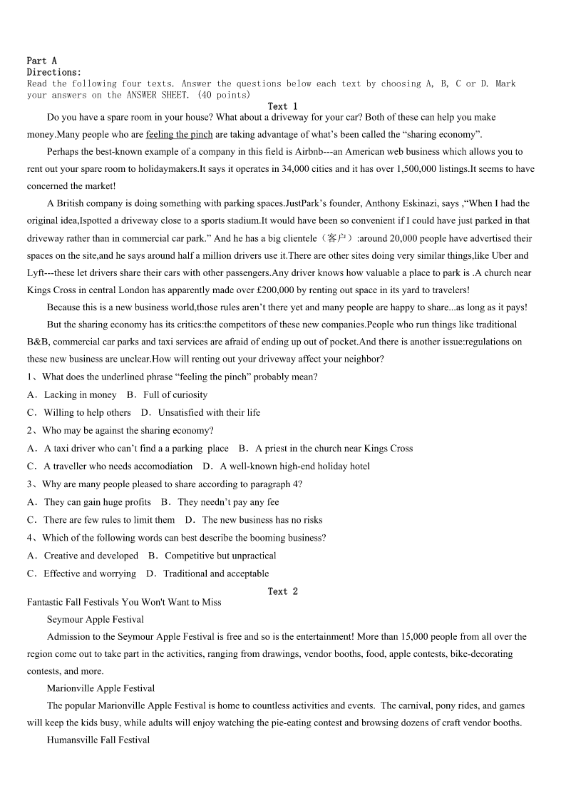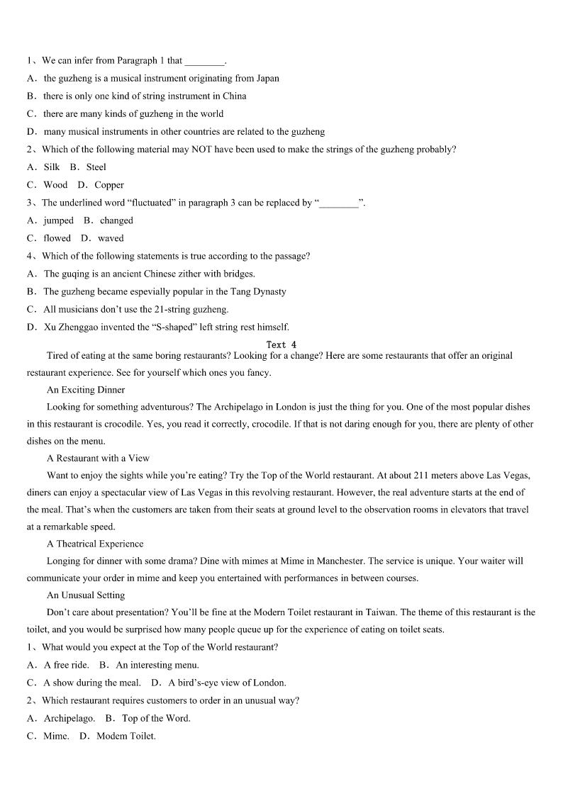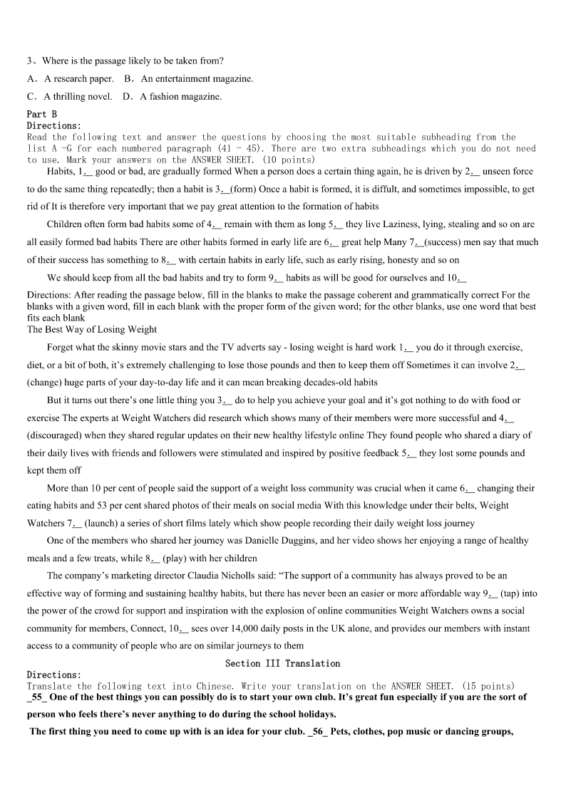 考研《英语一》余庆县2023年押题密卷 SectionIUseofEnglish Directions: Readthefollowingtext.Choosethebestword(s)foreachnumberedblankandmarkA,B,CorDonthe ANSWERSHEET.(10points) Ourfamily’sfirsthostingexperiencebeganinJanuaryof2015withourItaliandaughterVictoria.Wehadsomuchfun withherthatwecouldnot1toexperienceanew,differentcountry,sowe2tohostanotherWorldHeritageExchange Student. AssoonaswesawMerna’sinformation,weknewshewas3,aYESScholarshipstudent,andEgyptian.Webeganto fallinlovewithourEgyptain4rightaway.WeSkyped,andemailedforfivemonths5shearrivedintheUS.Whenshe6 gotofftheplane,itwasasifwewerefinallya(n)7familyagain. MyhusbandandIgrewupbelievingthatothercultures8us,andhostingaforeignExchangeStudentjustseemsso9 forus.Wefeltitwouldbea10experienceforourchildrentogrowupseeingotherculturesandlearningtoloveothersas a(n)11.Oursmallchildrenareenjoyingtheexperiencevastly,learninganewlanguage12,andrealizingthattheother sideoftheworldisnotallthat13ourcountry. Mernaissmall,loving,helpful,charming,caringandareal14toourlives.Shehas15usallsomuch.Wecannot 16ourliveswithoutourItalianandEgyptaindaughters.Wedoplantotravelto17countriesbecauseofthem,andwewill besendingourchildrenasexchangestudentstolivewithournew18families. IwanttothankWorldHeritagefor19achanceforourfamilytogrowfromfourchildrentosixchildrenallinoneyear. Weareallexcitedatthisexperienceofalifetimeandwillforever20it. 1、A.helpB.chooseC.waitD.intend 2、A.appliedB.affordedC.managedD.remembered 3、A.brilliantB.ambitiousC.cuteD.loyal 4、A.friendB.studentC.daughterD.relative 5、A.onceB.afterC.sinceD.before 6、A.evenB.alreadyC.justD.ever 7、A.bigB.foreignC.freeD.whole 8、A.appealtoB.sticktoC.belongtoD.taketo 9、A.commonB.naturalC.apparentD.simple 10、A.normalB.personalC.promisingD.rewarding 11、A.companionB.reminderC.equalD.individual 12、A.littlebylittleB.fewbyfewC.onebyoneD.sidebyside 13、A.amongstB.unlikeC.oppositeD.about 14、A.guestB.heroineC.believerD.blessing 15、A.offeredB.warnedC.taughtD.left 16、A.liveB.enjoyC.imagineD.continue 17、A.otherB.anotherC.allD.bo