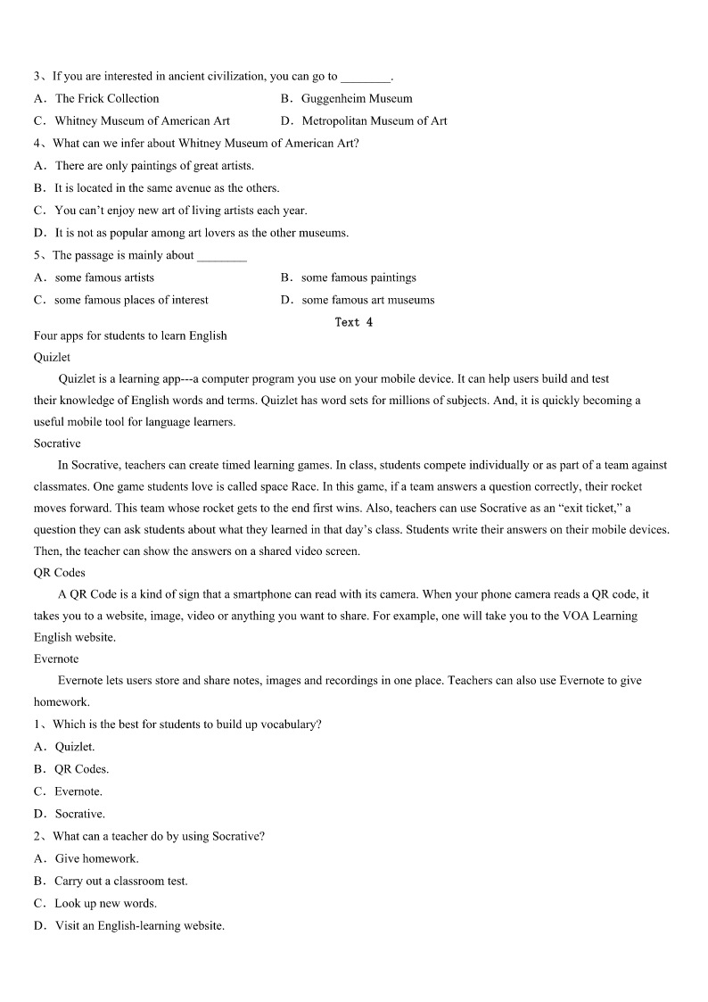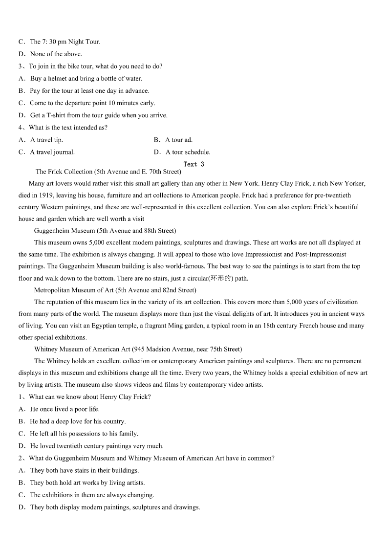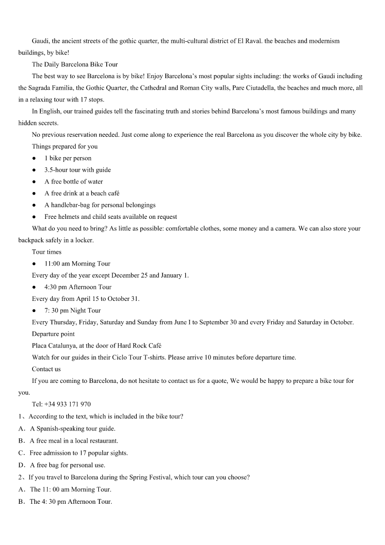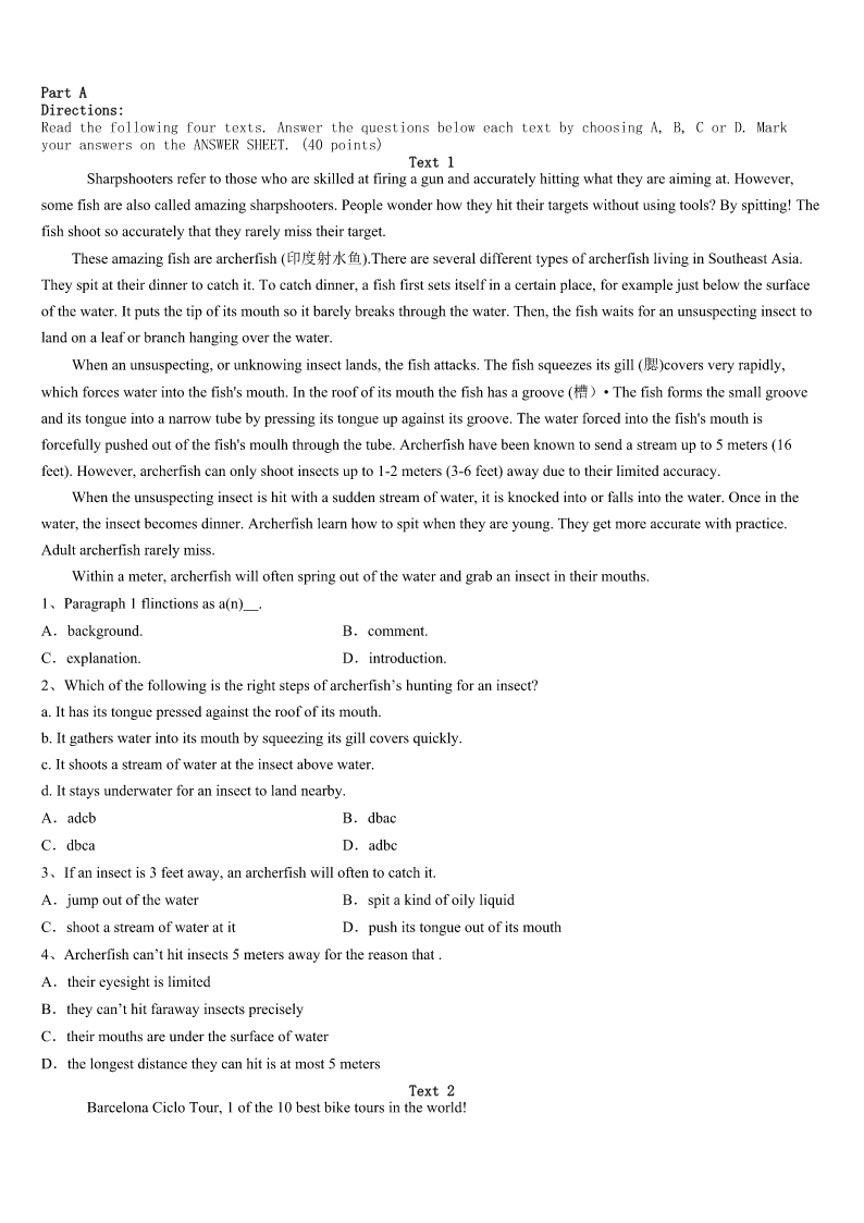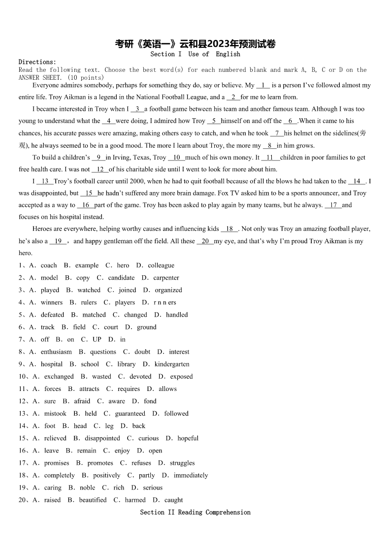 考研《英语一》云和县2023年预测试卷 SectionIUseofEnglish Directions: Readthefollowingtext.Choosethebestword(s)foreachnumberedblankandmarkA,B,CorDonthe ANSWERSHEET.(10points) Everyoneadmiressomebody,perhapsforsomethingtheydo,sayorbelieve.My1isapersonI’vefollowedalmostmy entirelife.TroyAikmanisalegendintheNationalFootballLeague,anda2formetolearnfrom. IbecameinterestedinTroywhenI3afootballgamebetweenhisteamandanotherfamousteam.AlthoughIwastoo youngtounderstandwhatthe4weredoing,IadmiredhowTroy5himselfonandoffthe6.Whenitcametohis chances,hisaccuratepasseswereamazing,makingotherseasytocatch,andwhenhetook7hishelmetonthesidelines(旁 观),healwaysseemedtobeinagoodmood.ThemoreIlearnaboutTroy,themoremy8inhimgrows. Tobuildachildren’s9inIrving,Texas,Troy10muchofhisownmoney.It11childreninpoorfamiliestoget freehealthcare.Iwasnot12ofhischaritablesideuntilIwenttolookformoreabouthim. I13Troy’sfootballcareeruntil2000,whenhehadtoquitfootballbecauseofalltheblowshehadtakentothe14.I wasdisappointed,but15hehadn’tsufferedanymorebraindamage.FoxTVaskedhimtobeasportsannouncer,andTroy acceptedasawayto16partofthegame.Troyhasbeenaskedtoplayagainbymanyteams,buthealways.17and focusesonhishospitalinstead. Heroesareeverywhere,helpingworthycausesandinfluencingkids18.NotonlywasTroyanamazingfootballplayer, he’salsoa19,andhappygentlemanoffthefield.Allthese20myeye,andthat’swhyI’mproudTroyAikmanismy hero. 1、A.coachB.exampleC.heroD.colleague 2、A.modelB.copyC.candidateD.carpenter 3、A.playedB.watchedC.joinedD.organized 4、A.winnersB.rulersC.playersD.rnners 5、A.defeatedB.matchedC.changedD.handled 6、A.trackB.fieldC.courtD.ground 7、A.offB.onC.UPD.in 8、A.enthusiasmB.questionsC.doubtD.interest 9、A.hospitalB.schoolC.libraryD.kindergarten 10、A.exchangedB.wastedC.devotedD.exposed 11、A.forcesB.attractsC.requiresD.allows 12、A.sureB.afraidC.awareD.fond 13、A.mistookB.heldC.guaranteedD.followed 14、A.footB.headC.legD.back 15、A.relievedB.disappointedC.curiousD.hopeful 16、A.leaveB.remainC.enjoyD.open 17、A.promisesB.promotesC.refusesD.struggles