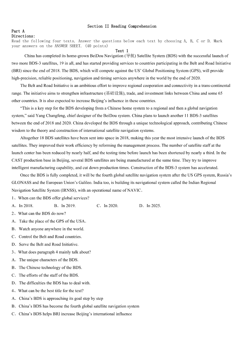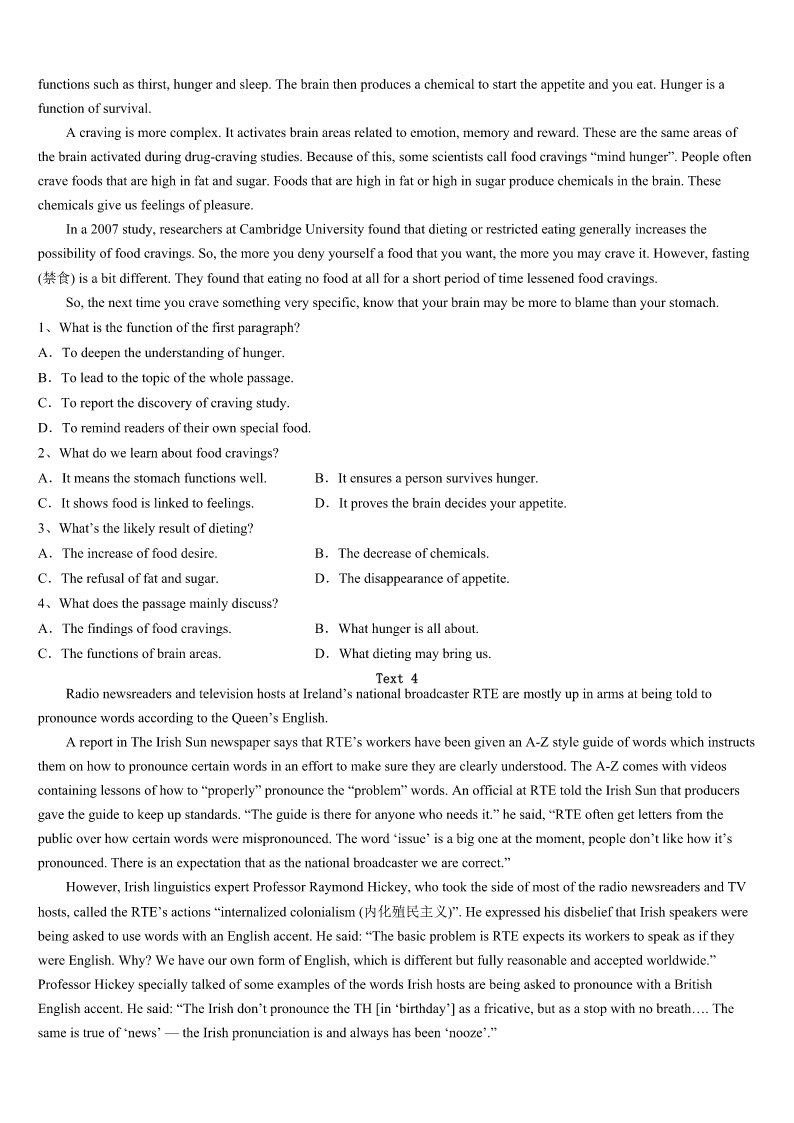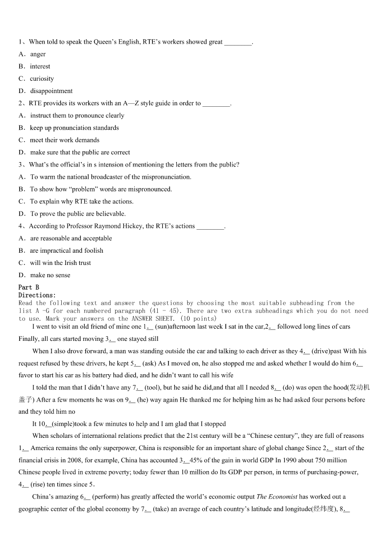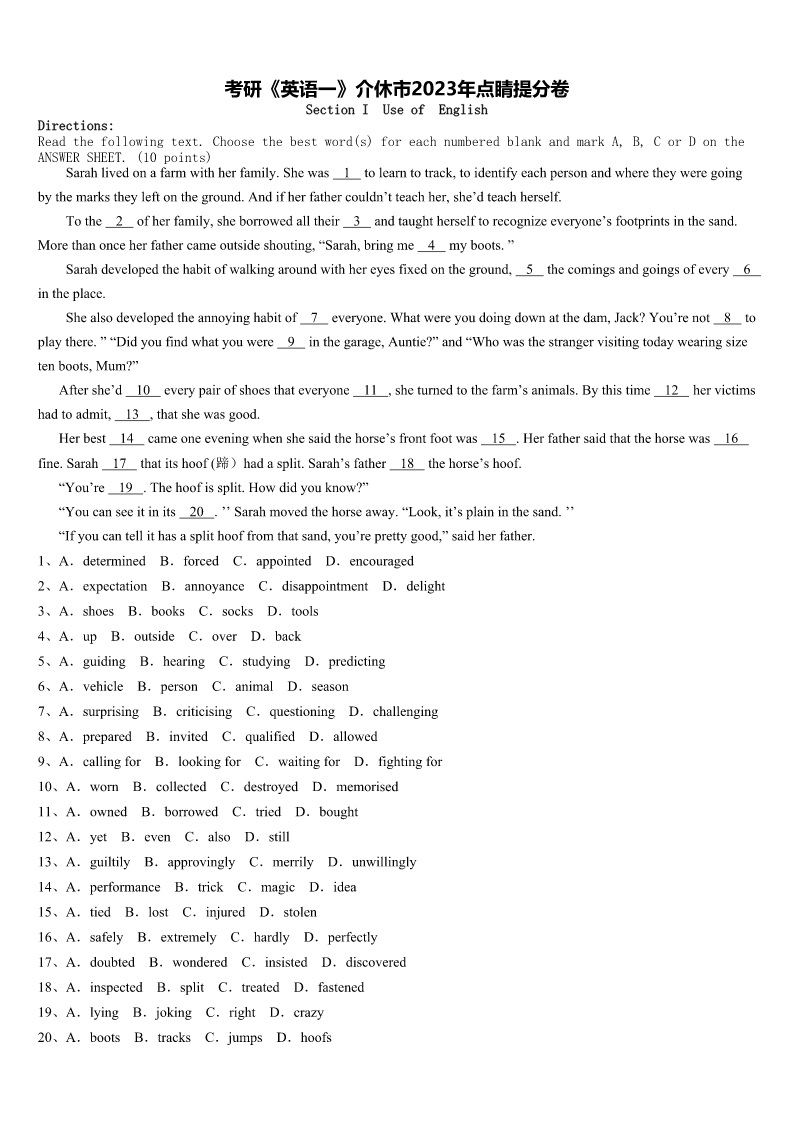 考研《英语一》介休市2023年点睛提分卷 SectionIUseofEnglish Directions: Readthefollowingtext.Choosethebestword(s)foreachnumberedblankandmarkA,B,CorDonthe ANSWERSHEET.(10points) Sarahlivedonafarmwithherfamily.Shewas1tolearntotrack,toidentifyeachpersonandwheretheyweregoing bythemarkstheyleftontheground.Andifherfathercouldn’tteachher,she’dteachherself. Tothe2ofherfamily,sheborrowedalltheir3andtaughtherselftorecognizeeveryone’sfootprintsinthesand. Morethanonceherfathercameoutsideshouting,“Sarah,bringme4myboots.” Sarahdevelopedthehabitofwalkingaroundwithhereyesfixedontheground,5thecomingsandgoingsofevery6 intheplace. Shealsodevelopedtheannoyinghabitof7everyone.Whatwereyoudoingdownatthedam,Jack?You’renot8to playthere.”“Didyoufindwhatyouwere9inthegarage,Auntie?”and“Whowasthestrangervisitingtodaywearingsize tenboots,Mum?” Aftershe’d10everypairofshoesthateveryone11,sheturnedtothefarm’sanimals.Bythistime12hervictims hadtoadmit,13,thatshewasgood. Herbest14cameoneeveningwhenshesaidthehorse’sfrontfootwas15.Herfathersaidthatthehorsewas16 fine.Sarah17thatitshoof(蹄)hadasplit.Sarah’sfather18thehorse’shoof. “You’re19.Thehoofissplit.Howdidyouknow?” “Youcanseeitinits20.’’Sarahmovedthehorseaway.“Look,it’splaininthesand.’’ “Ifyoucantellithasasplithooffromthatsand,you’reprettygood,”saidherfather. 1、A.determinedB.forcedC.appointedD.encouraged 2、A.expectationB.annoyanceC.disappointmentD.delight 3、A.shoesB.booksC.socksD.tools 4、A.upB.outsideC.overD.back 5、A.guidingB.hearingC.studyingD.predicting 6、A.vehicleB.personC.animalD.season 7、A.surprisingB.criticisingC.questioningD.challenging 8、A.preparedB.invitedC.qualifiedD.allowed 9、A.callingforB.lookingforC.waitingforD.fightingfor 10、A.wornB.collectedC.destroyedD.memorised 11、A.ownedB.borrowedC.triedD.bought 12、A.yetB.evenC.alsoD.still 13、A.guiltilyB.approvinglyC.merrilyD.unwillingly 14、A.performanceB.trickC.magicD.idea 15、A.tiedB.lostC.injuredD.stolen 16、A.safelyB.extremelyC.hardlyD.perfectly 17、A.doubtedB.wonderedC.insistedD.discovered 18、A.inspectedB.splitC.tre
