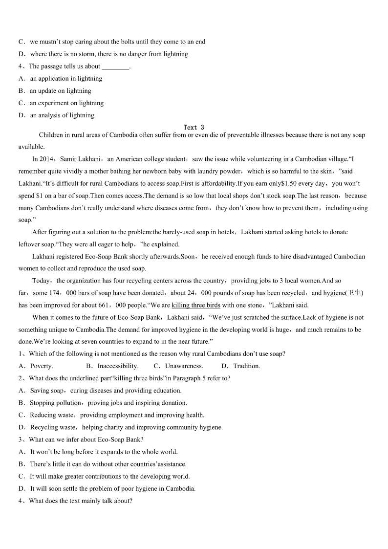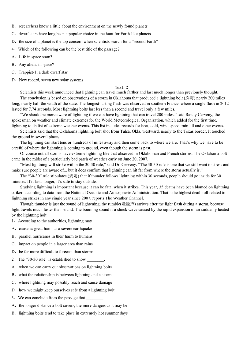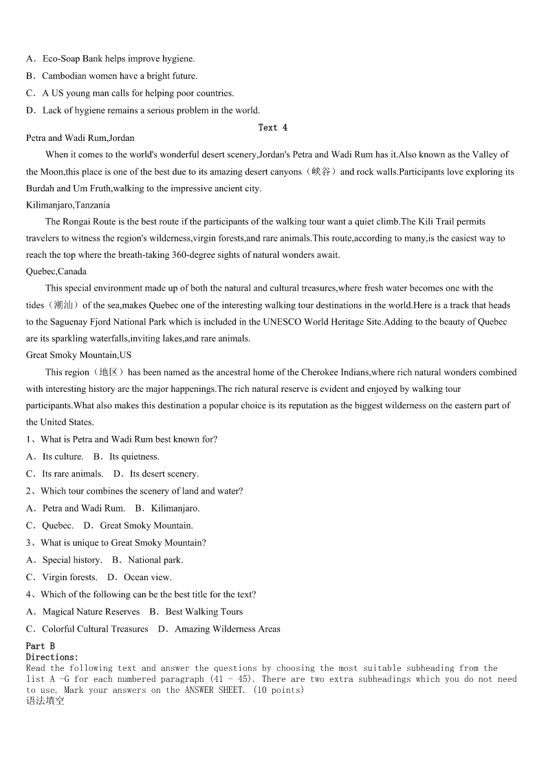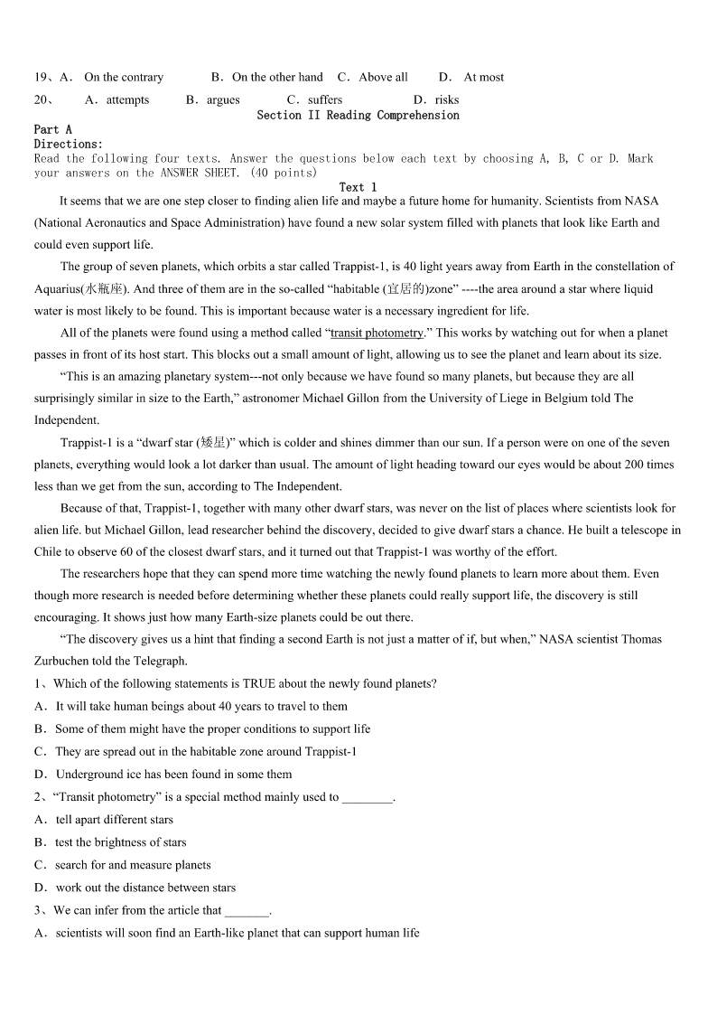 考研《英语一》云南省昆明市呈贡县2023年统考试题 SectionIUseofEnglish Directions: Readthefollowingtext.Choosethebestword(s)foreachnumberedblankandmarkA,B,CorDonthe ANSWERSHEET.(10points) 完形填空(共20小题;每小题1.5分,满分30分) 阅读下面短文,从短文后各题所给的四个选项(A、B、C和D)中,选出可以填入空白处的最佳选项,并在答题卡 上将该项涂黑。 Iwasstandingonstagebefore200people,dressedupasGeorgeWashington.Ihadtheleadroleinmysixthgrade36and,for thepasttwomonths,Ihadwalkedbackandforthinmyroom37tosaymylines. Nowitwastimetogivea38,andmyheartwasbeatingrapidly.Atmy39,Ibegantospeaksmoothlyandclearly,but thenit40:Istuttered(口吃).IknewIwould,andIdid. Fromthatmomenton,I41thatmyroleinthatplaywouldbemyfirstandmylast.Myspeechproblemaffected42. Asachild,Istruggledtosayafullsentence,repeatedlyhearingthe43commentsofmyparents.“Takeadeepbreathand thinkaboutwhatyou’regoingtosay.”Iwastoo44toadmitIhadaproblem. 45myschoolcareerprogressedmyspeechproblembecamelessnoticeable,butitnever46.Itheldmeback. Afterrealizingthatclassofficershadtospeakinfrontoftheentirestudentbody,I47runninginclasselections.Ifeared readingaloudandmeetingnewpeople. Iwould48sitinmyroomandcry,imaginingwhatitwouldbeliketobe49,likeeveryoneelse. Finally,Icametomysenses.Ireadarticlesaboutfamouspeoplewho50theirspeechproblems.I51thefactthatIdo haveaproblemthatwillalwaysbewithme. Ithasmademea52personand,withtime,IknowI’llgaintheconfidencetostandupand53tomyselfthatitwillnever holdmeback.54,IknowthatI’mnottheonlyonewho55,becausenobodyisperfect. 1、A.playB.gameC.danceD.concert 2、A.desiringB.waitingC.strugglingD.hesitating 3、A.testB.performanceC.suggestionD.judgment 4、A.sightB.angleC.newsD.turn 5、A.happenedB.seemedC.brokeD.remained 6、A.urgedB.promisedC.admittedD.repeated 7、A.nothingB.somethingC.everythingD.anything 8、A.excitingB.surprisingC.puzzlingD.annoying 9、A.ashamedB.willingC.weakD.eager 10、A.ThoughB.AsC.BeforeD.Unless 11、A.failedB.disappearedC.burstD.combined 12、A.insistedonB.putoffC.approvedofD.gaveup 13、A.neverB.seldomC.sometimeD.constantly 14、A.normalB.specialC.usualD.alive 15、A.realizedB.refusedC.overcameD.avoided 16