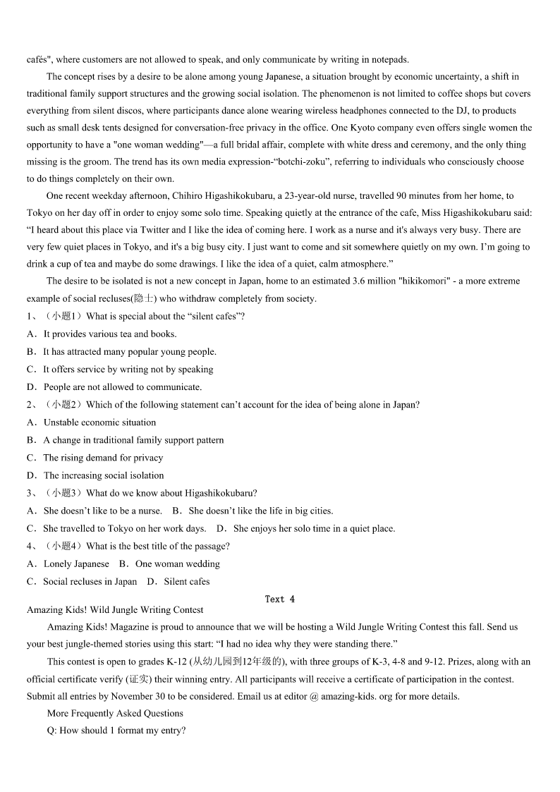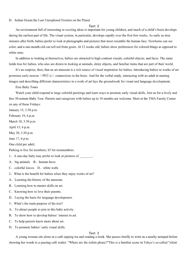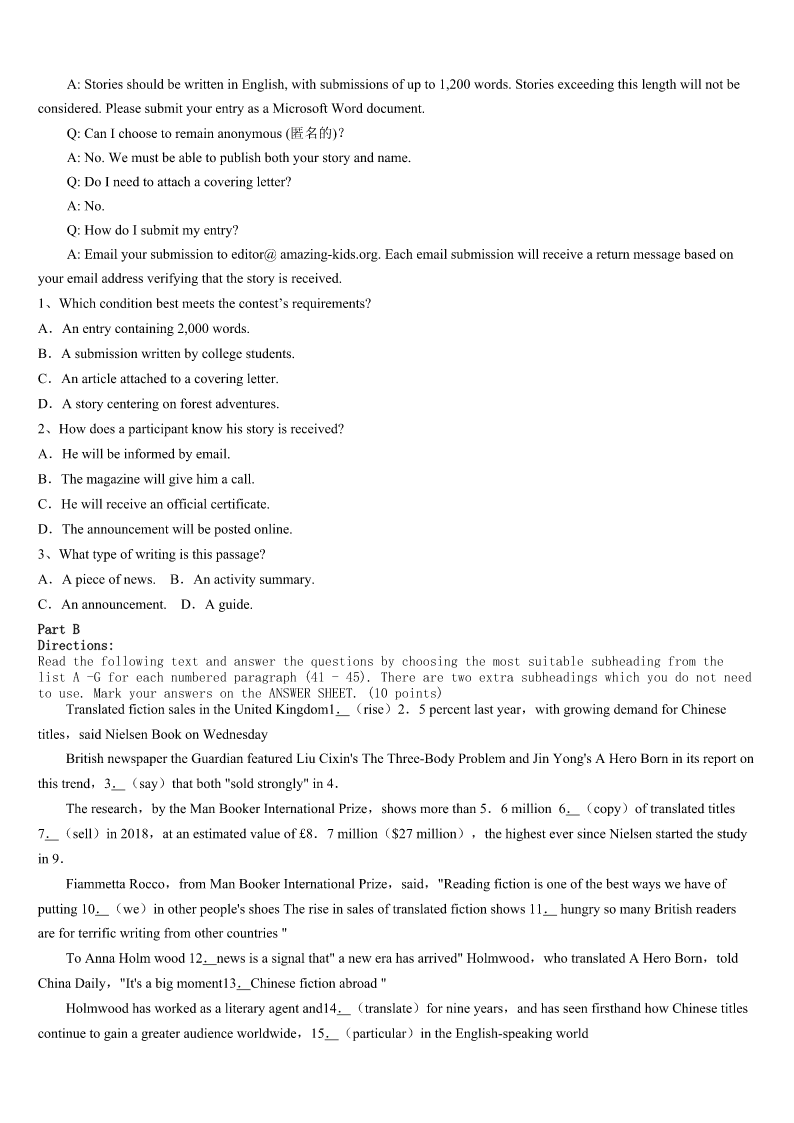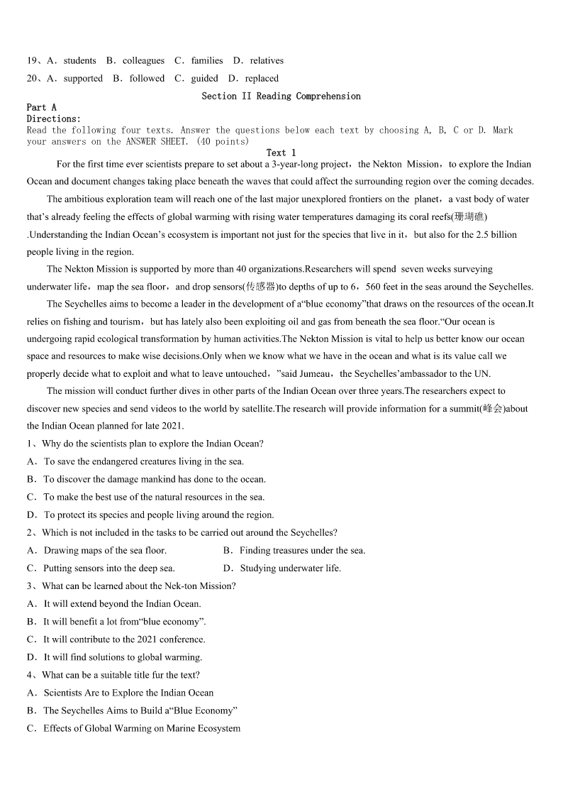 考研《英语一》南昌市进贤县2023年巅峰冲刺试卷 SectionIUseofEnglish Directions: Readthefollowingtext.Choosethebestword(s)foreachnumberedblankandmarkA,B,CorDonthe ANSWERSHEET.(10points) MissBessiewasonlyfivefeettall,butshewastheonlywomanstrictenoughtomakemereadBeowulf.Ishallnever forgetthedayshe1meandpersuadedmetoreadit. “ButMissBessie,”Icomplained,“Iain’tmuch2it.” “Boy,”shesaid,“howdareyousay‘ain’t’tome!I’vetaughtyoubetterthanthat.” “MissBessie,”Iresponded,“I’mtryingtobethe3ofthefootballteam,andifIgoaroundsaying‘itisn’t’and‘they aren’t’,myfriendsaregoingtolaughatme.” “Boy,”shesaid,“youwanttobetheleader4youhavecourage.Butdoyouknowwhat5takescourage?It’s6 toloweryourstandardstothoseofthecrowd.” Then,I7saying“itisn’t”and“theyaren’t,‘‘andI8becametheleader,withoutlosingmyfriends’9. Bornin1895inpoverty,MissBessiegrewupinAthens,Alabama.Sheneverattendeduniversitybecauseshecouldnot 10it.Inthelocalhighschool,she11alotaboutShakespeareandthegreatimportanceof12.“Whatyouputinyour head,”sheoncesaid,“canneverbe13byanybody.” Duringher1444-yearcareer(职业生涯),MissBessietaughthundredsofyoungsters.Irememberhernowwith 15andaffection.MissBessienoticedthingsthathadnothingtodowithschoolwork,butwereimportanttoayoungster’s16 .Onceafewclassmates17myworn-outovercoat,andasIwasleavingschool,MissBessie18me,”Carl,neverworry aboutwhatyoudon’thave.Justmakethemostofwhatyoudohave—abrain. WhenMissBessiediedin1980,hundredsofherformer19mourned.Manyofthem,20byMissBessie’sexample, becameexcellentteachers. 1、A.praisedB.scoldedC.understoodD.cheated 2、A.worriedaboutB.tiredofC.satisfiedwithD.interestedin 3、A.memberB.friendC.leaderD.coach 4、A.becauseB.soC.orD.when 5、A.naturallyB.unexpectedlyC.reallyD.directly 6、A.pretendingB.refusingC.wishingD.remembering 7、A.startedB.preferredC.suggestedD.minded 8、A.alsoB.stillC.neverD.even 9、A.controlB.helpC.trustD.respect 10、A.affordB.finishC.manageD.change 11、A.wroteB.learnedC.thoughtD.talked 12、A.knowledgeB.courageC.wealthD.confidence 13、A.usedupB.givenawayC.brokendownD.takenaway 14、A.boringB.diffi