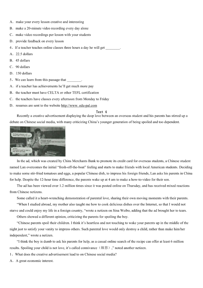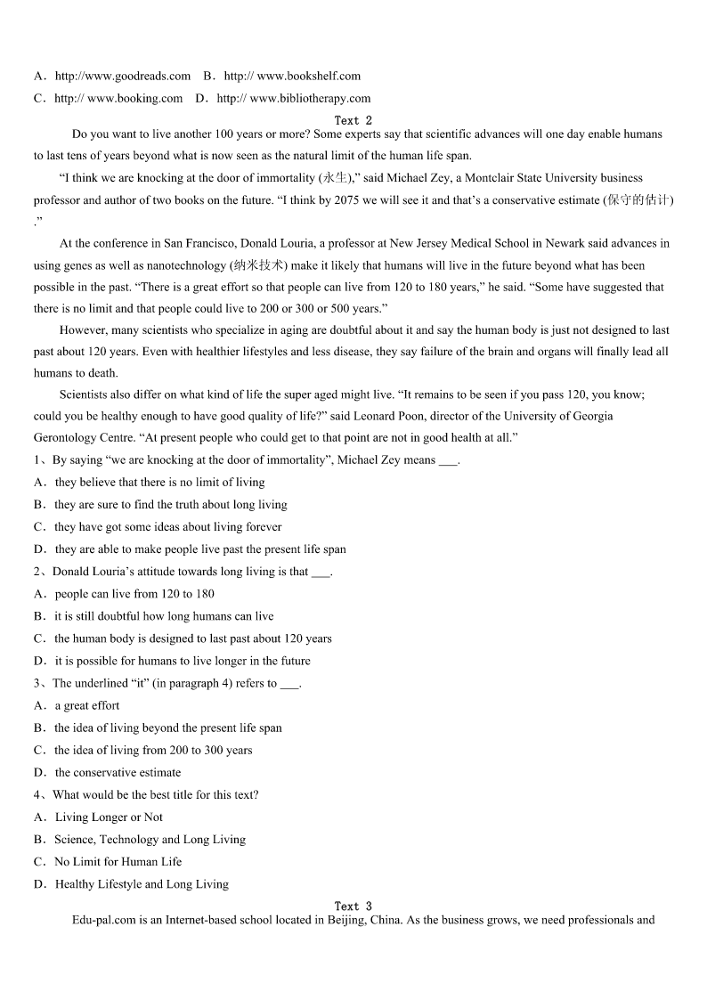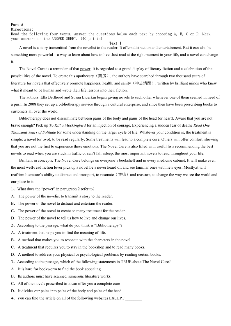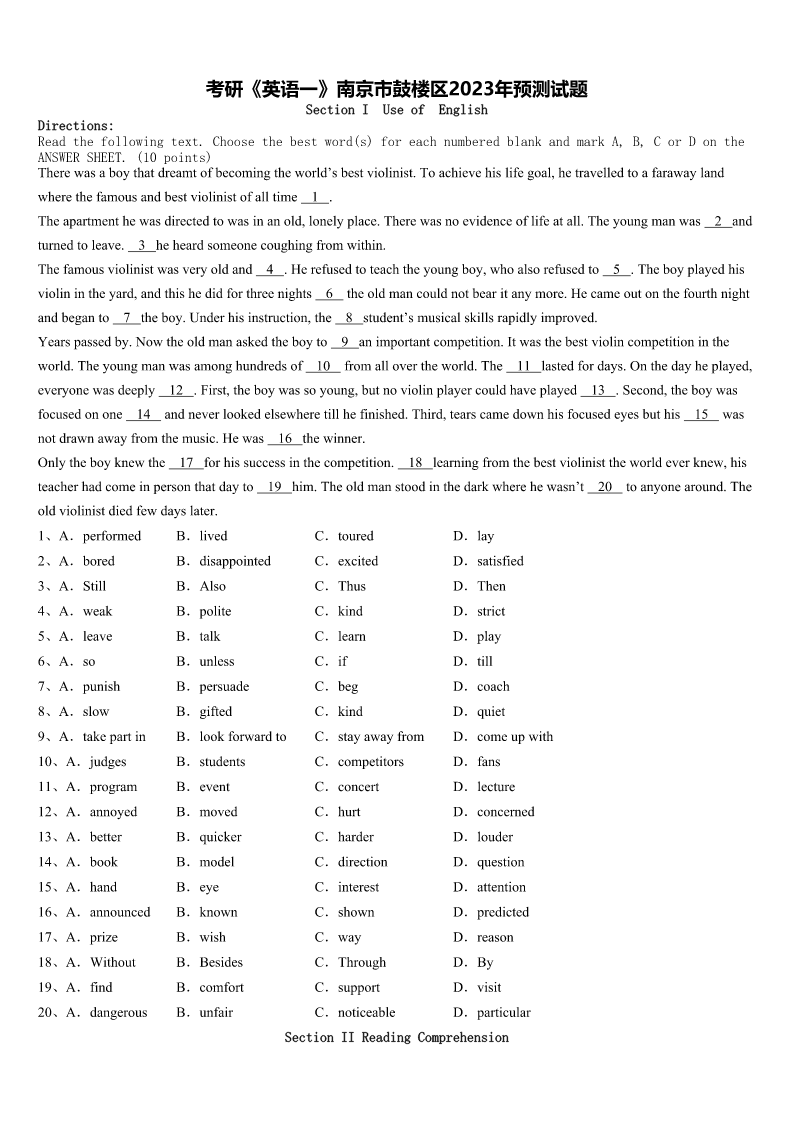 考研《英语一》南京市鼓楼区2023年预测试题 SectionIUseofEnglish Directions: Readthefollowingtext.Choosethebestword(s)foreachnumberedblankandmarkA,B,CorDonthe ANSWERSHEET.(10points) Therewasaboythatdreamtofbecomingtheworld’sbestviolinist.Toachievehislifegoal,hetravelledtoafarawayland wherethefamousandbestviolinistofalltime1. Theapartmenthewasdirectedtowasinanold,lonelyplace.Therewasnoevidenceoflifeatall.Theyoungmanwas2and turnedtoleave.3heheardsomeonecoughingfromwithin. Thefamousviolinistwasveryoldand4.Herefusedtoteachtheyoungboy,whoalsorefusedto5.Theboyplayedhis violinintheyard,andthishedidforthreenights6theoldmancouldnotbearitanymore.Hecameoutonthefourthnight andbeganto7theboy.Underhisinstruction,the8student’smusicalskillsrapidlyimproved. Yearspassedby.Nowtheoldmanaskedtheboyto9animportantcompetition.Itwasthebestviolincompetitioninthe world.Theyoungmanwasamonghundredsof10fromallovertheworld.The11lastedfordays.Onthedayheplayed, everyonewasdeeply12.First,theboywassoyoung,butnoviolinplayercouldhaveplayed13.Second,theboywas focusedonone14andneverlookedelsewheretillhefinished.Third,tearscamedownhisfocusedeyesbuthis15was notdrawnawayfromthemusic.Hewas16thewinner. Onlytheboyknewthe17forhissuccessinthecompetition.18learningfromthebestviolinisttheworldeverknew,his teacherhadcomeinpersonthatdayto19him.Theoldmanstoodinthedarkwherehewasn’t20toanyonearound.The oldviolinistdiedfewdayslater. 1、A.performedB.livedC.touredD.lay 2、A.boredB.disappointedC.excitedD.satisfied 3、A.StillB.AlsoC.ThusD.Then 4、A.weakB.politeC.kindD.strict 5、A.leaveB.talkC.learnD.play 6、A.soB.unlessC.ifD.till 7、A.punishB.persuadeC.begD.coach 8、A.slowB.giftedC.kindD.quiet 9、A.takepartinB.lookforwardtoC.stayawayfromD.comeupwith 10、A.judgesB.studentsC.competitorsD.fans 11、A.programB.eventC.concertD.lecture 12、A.annoyedB.movedC.hurtD.concerned 13、A.betterB.quickerC.harderD.louder 14、A.bookB.modelC.directionD.question 15、A.handB.eyeC.interestD.attention 16、A.announcedB.knownC.shownD.predicted 17、A.prizeB.wishC.wayD.reason 18、A.Without