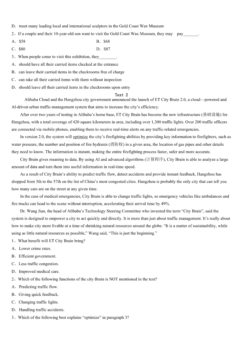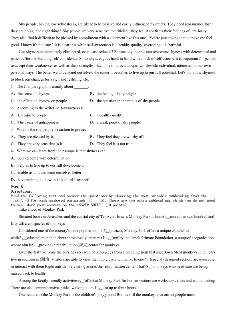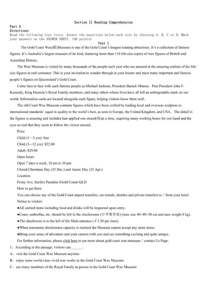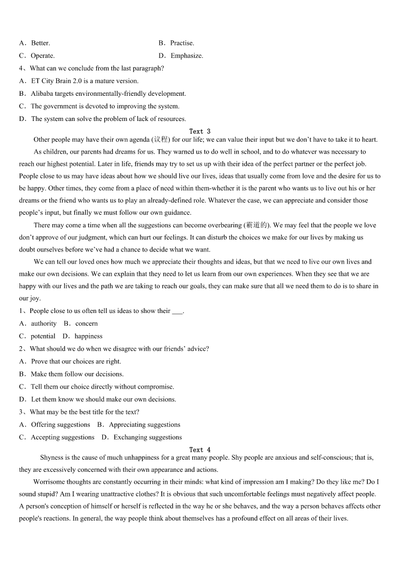 考研《英语一》四川省成都市双流县2023年统考试题 SectionIUseofEnglish Directions: Readthefollowingtext.Choosethebestword(s)foreachnumberedblankandmarkA,B,CorDonthe ANSWERSHEET.(10points) Ilearnedsomethingreallyearlyfrommyfamily:Eventhebiggestchallengesareless1whenyousolvethemasa community. Mybrother,sisterandcousinsweremyfirstgroup.2wegotmoreandmorefightsathome,wenever3thatoutside ourhouse,ifyoumessedwithoneofus,yougot4ofus. Fromschooltosports,Iwas5inaclassproject,club,teamorgroup.Fromspeechanddebatetofieldhockey,whenI wasinacommunity,Ifelt6totryforthingsthatseemed7.Igrewbecauseotherspushedme.8didn’tseemsoscary becauseweweretakingriskstogether. Whenadrunkdriverkilledmyfather,itwasourcommunitythat9.Itwasourfamilyfriends,ourcommunitytheater andoursportsteamsthatstood10us.Myfatherhadbeenahighschoolhistoryteacher,andhiscolleagues—nowmy teachers—begantokeepa11eyeonusbecausehe12could. Idon’t13aparent’sdeathasthewaytolearnaboutthe14ofsmallcommunities,butitdidmakeme15that.If Ilookedforbiggerchallengeswiththesupportofagroup,Iwasgoingto16broadergoalsandbuilddeeperrelationships 17thejourney. AsIsitheretonightwithmyteamoffive,I’m18ofhowmuchIlovethesemoments–building19webelievein, thatwe’lllearnfromandthatwe’lldotogether. Ifyouaregoingtodosomethingthatterrifiesyou,firstfinda20. 1、A.terrifyingB.riskyC.appealingD.thrilling 2、A.OnceB.WhenC.WhileD.Since 3、A.arguedB.consideredC.decidedD.doubted 4、A.noneB.allC.nothingD.anyone 5、A.sometimesB.seldomC.alwaysD.barely 6、A.curiousB.discouragedC.scaryD.safe 7、A.undercontrolB.outofmyreachC.outoforderD.withinmyability 8、A.FailuresB.GoalsC.FightsD.Disasters 9、A.steppedinB.movedonC.turnedupD.standout 10、A.forB.betweenC.byD.through 11、A.biggerB.stricterC.warmerD.closer 12、A.nolongerB.neverC.hardlyD.insteadof 13、A.confirmB.recommendC.adoptD.identify 14、A.beliefB.powerC.possibilityD.harmony 15、A.realizeB.figureC.considerD.notice 16、A.gothroughB.getoverC.goforD.comeacross 17、A.forB.besidesC.byD.throughout 18、A.informedB.remindedC.blamedD.inspired 19、A.anythingB.everything