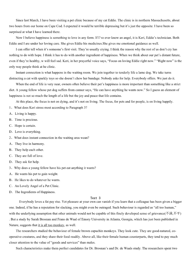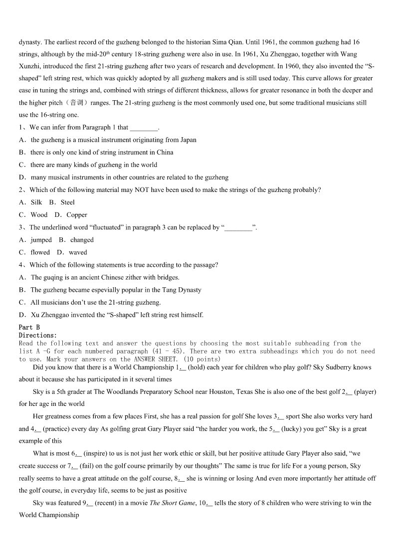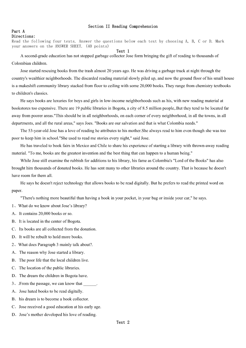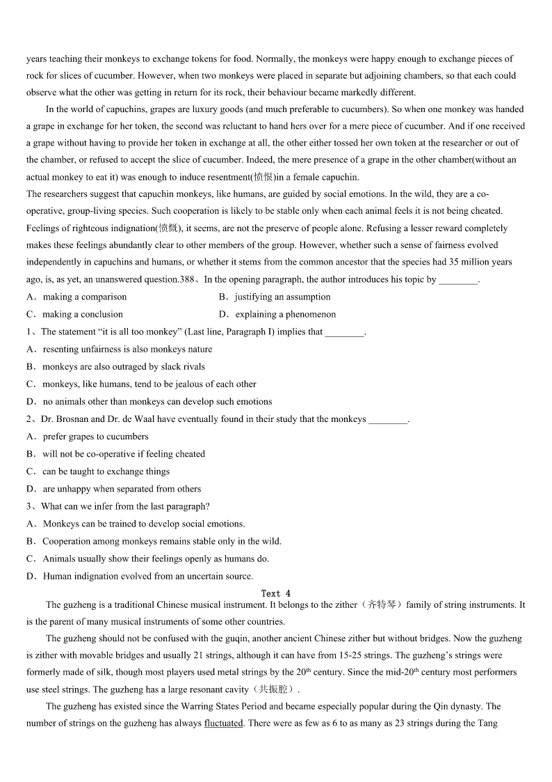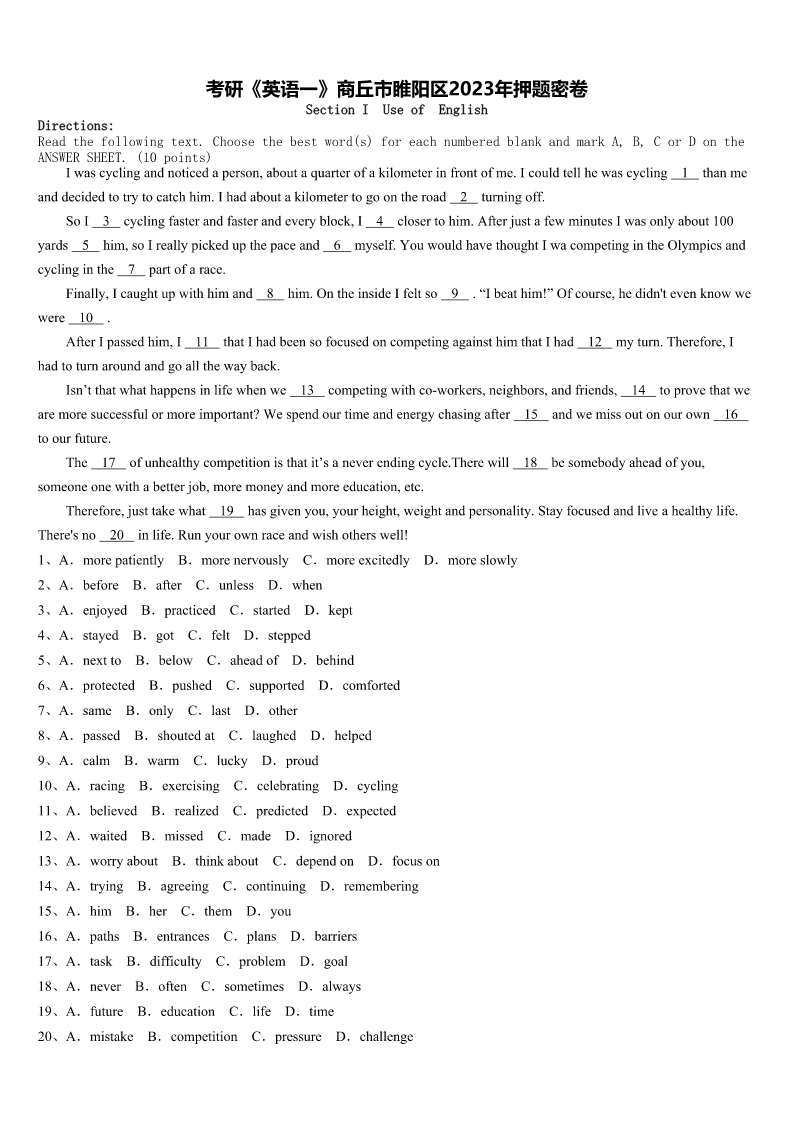 考研《英语一》商丘市睢阳区2023年押题密卷 SectionIUseofEnglish Directions: Readthefollowingtext.Choosethebestword(s)foreachnumberedblankandmarkA,B,CorDonthe ANSWERSHEET.(10points) Iwascyclingandnoticedaperson,aboutaquarterofakilometerinfrontofme.Icouldtellhewascycling1thanme anddecidedtotrytocatchhim.Ihadaboutakilometertogoontheroad2turningoff. SoI3cyclingfasterandfasterandeveryblock,I4closertohim.AfterjustafewminutesIwasonlyabout100 yards5him,soIreallypickedupthepaceand6myself.YouwouldhavethoughtIwacompetingintheOlympicsand cyclinginthe7partofarace. Finally,Icaughtupwithhimand8him.OntheinsideIfeltso9.“Ibeathim!”Ofcourse,hedidn'tevenknowwe were10. AfterIpassedhim,I11thatIhadbeensofocusedoncompetingagainsthimthatIhad12myturn.Therefore,I hadtoturnaroundandgoallthewayback. Isn’tthatwhathappensinlifewhenwe13competingwithco-workers,neighbors,andfriends,14toprovethatwe aremoresuccessfulormoreimportant?Wespendourtimeandenergychasingafter15andwemissoutonourown16 toourfuture. The17ofunhealthycompetitionisthatit’saneverendingcycle.Therewill18besomebodyaheadofyou, someoneonewithabetterjob,moremoneyandmoreeducation,etc. Therefore,justtakewhat19hasgivenyou,yourheight,weightandpersonality.Stayfocusedandliveahealthylife. There'sno20inlife.Runyourownraceandwishotherswell! 1、A.morepatientlyB.morenervouslyC.moreexcitedlyD.moreslowly 2、A.beforeB.afterC.unlessD.when 3、A.enjoyedB.practicedC.startedD.kept 4、A.stayedB.gotC.feltD.stepped 5、A.nexttoB.belowC.aheadofD.behind 6、A.protectedB.pushedC.supportedD.comforted 7、A.sameB.onlyC.lastD.other 8、A.passedB.shoutedatC.laughedD.helped 9、A.calmB.warmC.luckyD.proud 10、A.racingB.exercisingC.celebratingD.cycling 11、A.believedB.realizedC.predictedD.expected 12、A.waitedB.missedC.madeD.ignored 13、A.worryaboutB.thinkaboutC.dependonD.focuson 14、A.tryingB.agreeingC.continuingD.remembering 15、A.himB.herC.themD.you 16、A.pathsB.entrancesC.plansD.barriers 17、A.taskB.difficultyC.problemD.goal 18、A.neverB.oftenC.sometimesD.always 19、A.futureB.educationC.lifeD.time 20、A.mistakeB