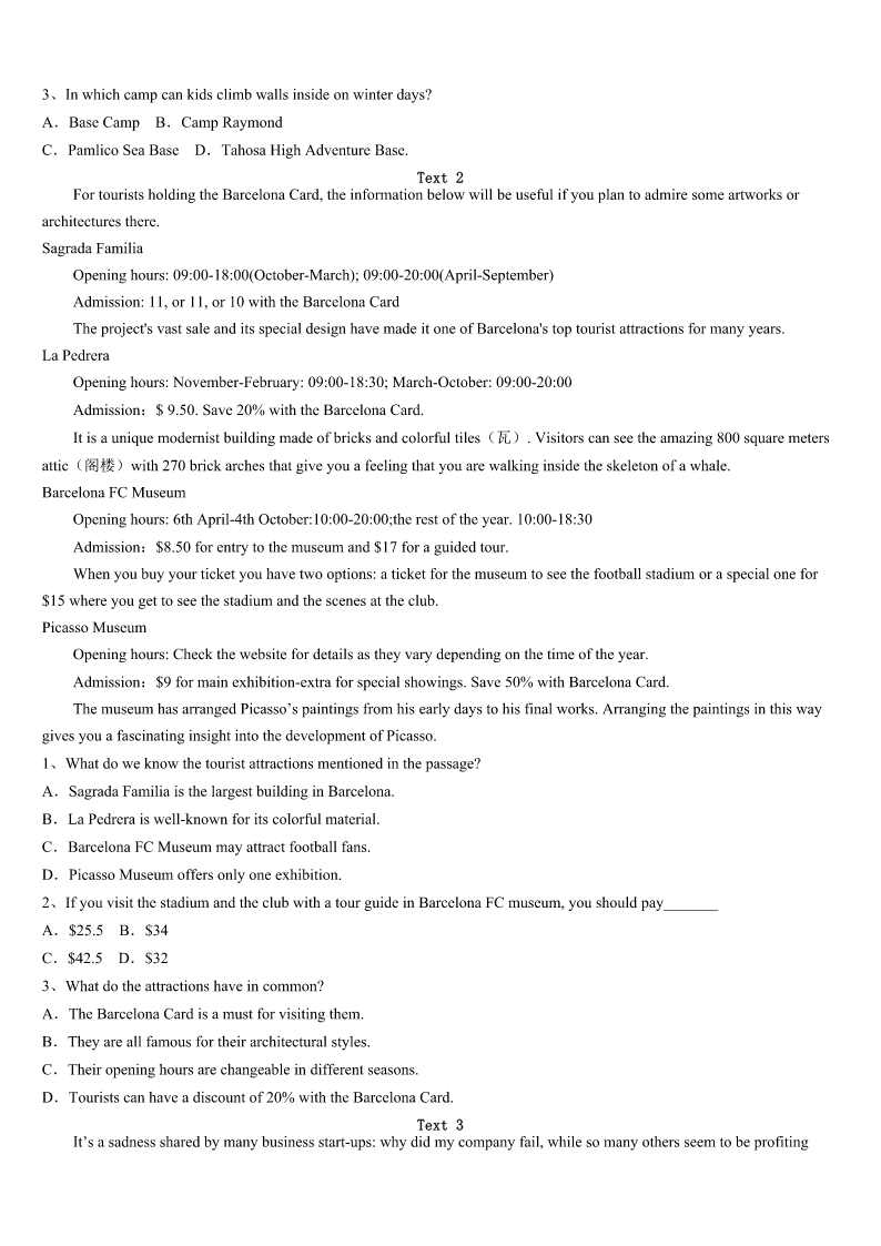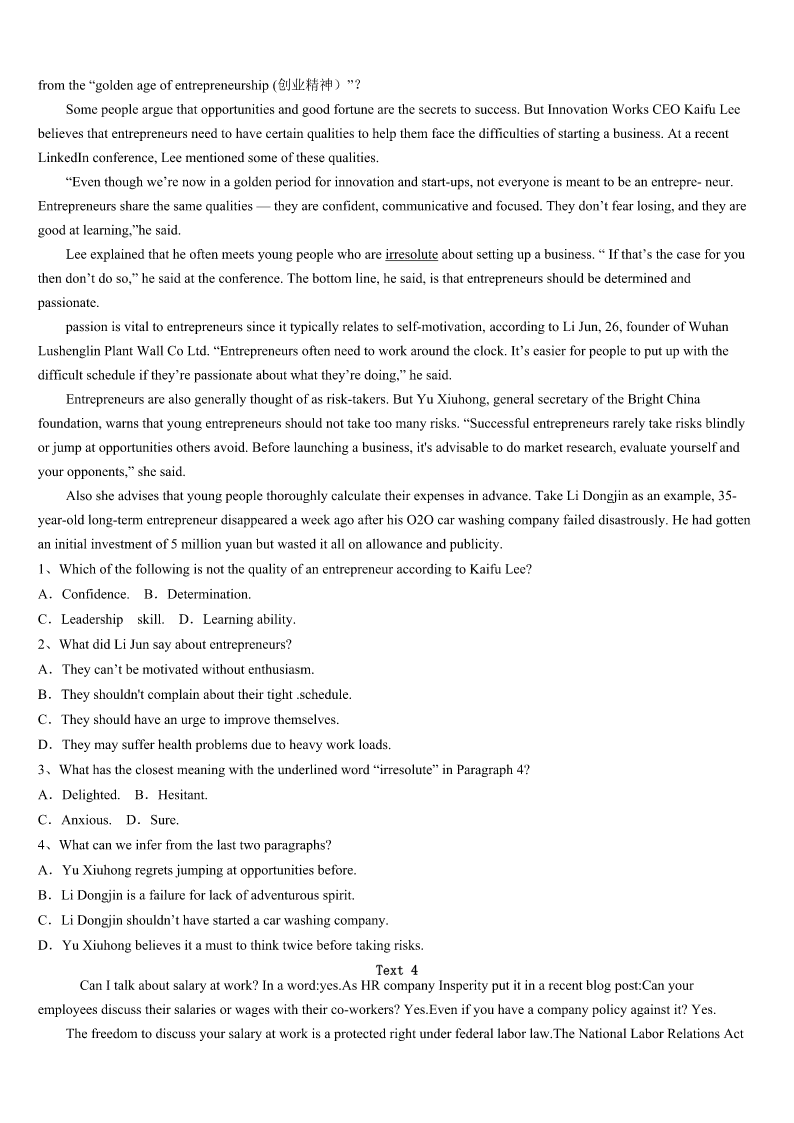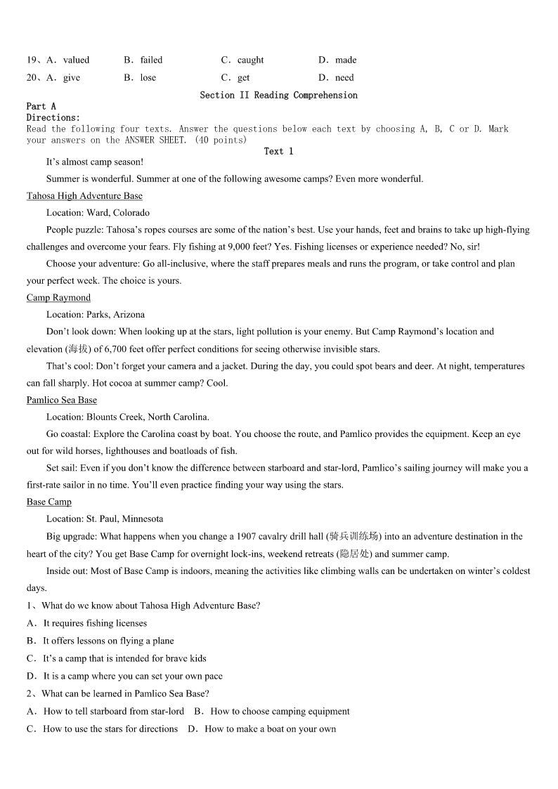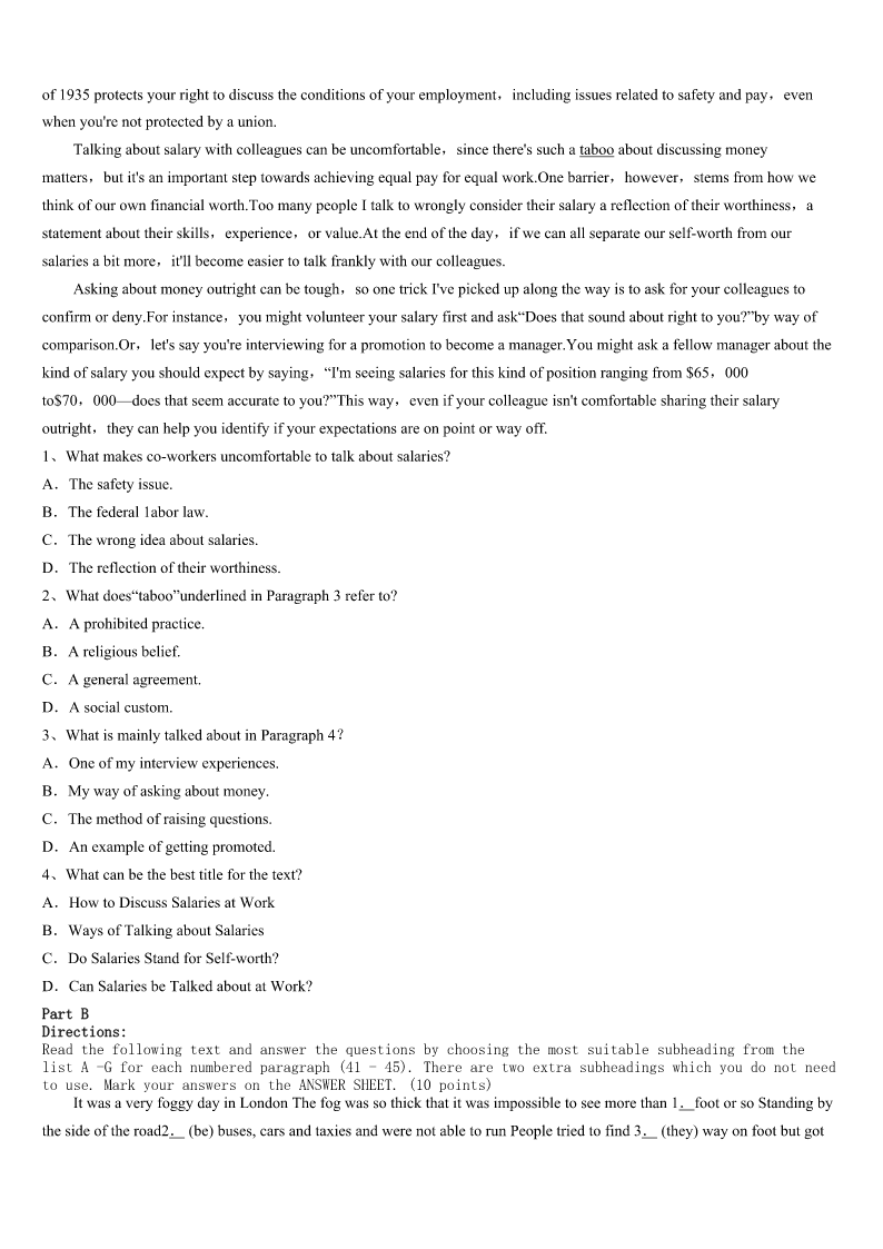考研《英语一》四川省达州市开江县2023年全真模拟试题 SectionIUseofEnglish Directions: Readthefollowingtext.Choosethebestword(s)foreachnumberedblankandmarkA,B,CorDonthe ANSWERSHEET.(10points) 完形填空(共20小题;每小题1.5分,满分30分) 阅读下面短文,掌握其大意,然后从36—55各题所给的A、B、C、D四个选项中,选出最佳选项,并在答题卡上将该 项涂黑。 Insomecities,workholism(废寝忘食工作)issocommonthatpeopledon’tconsideritunusual.Theyacceptthelifestyleas 1.GovernmentworkersinWashington,D.C.,2,frequentlyworksixtytoseventyhoursaweek.Theydon’tdothis becausetheyhaveto;theydoitbecausethey3to.Workholismcanbea4problem.Becausetrueworkaholicswould ratherworkthandoanythingelse,they5havenoideaofhowtorelax;thatis,theymightnot6movies,sports,orother typesofentertainment.Mostofall,they7tositanddonothing.Thelivesofworkaholicsareusuallystressful,andthis tensionandworrycancause8problemssuchasheartattacksandstomachdiseases.9,typicalworkaholicsdon’tpay muchattentiontotheirfamilies.Theirmarriagesmayendin10astheyspendlittletimewiththeirfamilies. Isworkholism11dangerous?Perhapsnot.Thereare,certainly,peoplewhowork12understress.Somestudiesshowthat manyworkaholicshavegreatenergyandinterestinwork.Theyfeel13issopleasurablethattheyareactuallyveryhappy. Formostworkaholics,workandentertainmentarethesamething.Theirjobs14themwithachallenge;thiskeepsthem busyandcreative. 15doworkaholicsenjoytheirjobssomuch?Thereareseveral16towork.Ofcourse,itprovidespeoplewith paychecks,andthisisimportant.Butitoffers17financialsecurity.Itprovidespeoplewithself-confidence;theyhavea feelingofsatisfaction18theyhaveproducedachallengingpieceofworkandareabletosay“I19it”.Psychologists claimthattheirworkgivespeopleanidentity.Aftertheytakepartinwork,they20asenseofselfandindividualism. 1、A.strangeB.boringC.pleasantD.normal 2、A.forexampleB.ontheotherhandC.what’smoreD.afterall 3、A.agreeB.promiseC.dareD.want 4、A.slightB.seriousC.obviousD.difficult 5、A.stillB.probablyC.certainlyD.mostly 6、A.affordB.enjoyC.watchD.allow 7、A.dreamB.decideC.intendD.hate 8、A.physicalB.culturalC.socialD.mental 9、A.ThereforeB.HoweverC.AnywayD.Besides 10、A.happ
