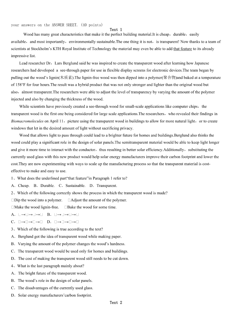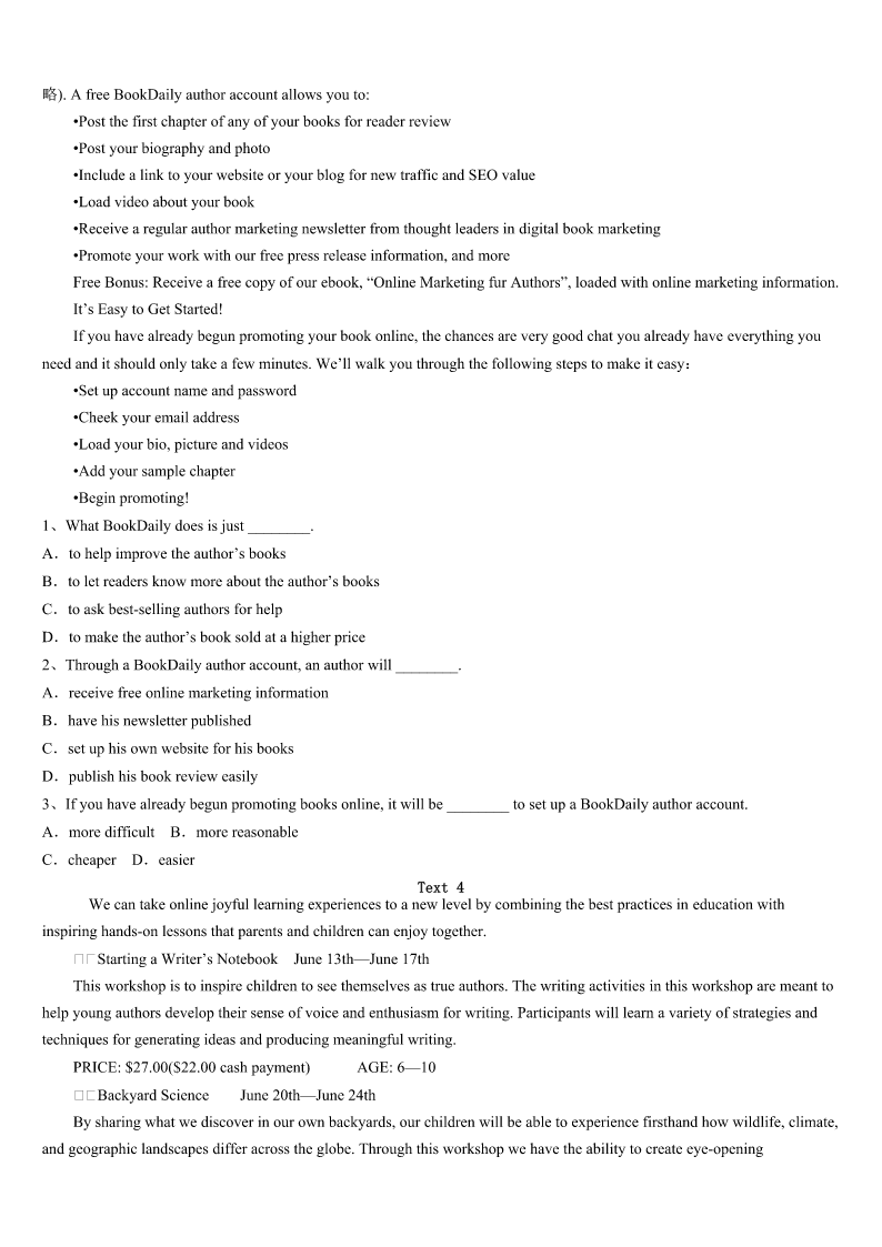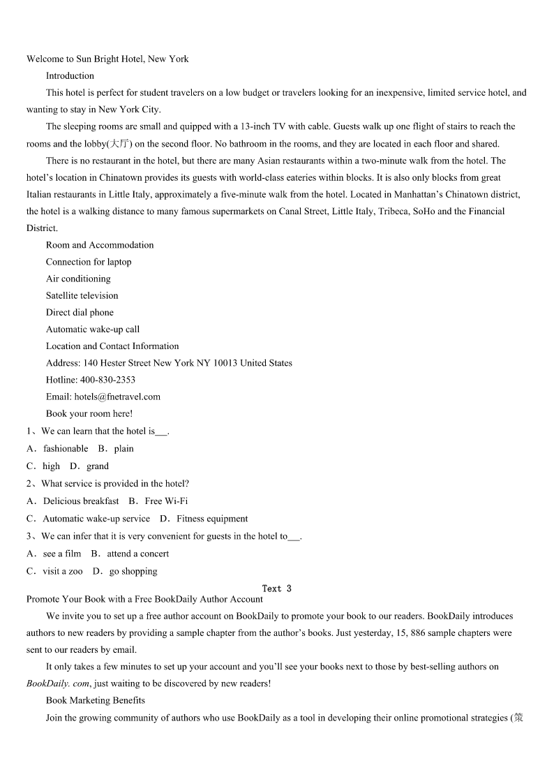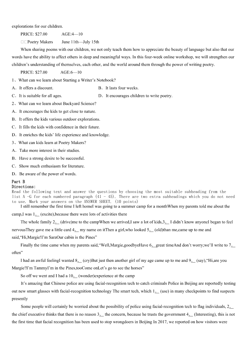 考研《英语一》天峻县2023年深度预测试卷 SectionIUseofEnglish Directions: Readthefollowingtext.Choosethebestword(s)foreachnumberedblankandmarkA,B,CorDonthe ANSWERSHEET.(10points) Iwokeuptoansweraphonecallfromataxidriverwhohadmyfriend’scellphone.Myfriendhadapparently1itin thetaxithenightbefore.Thedriverhadcalledothers,2Iwasthefirstonewho3toanswer. Thecabdriveraskedmewherehecould4thecellphoneoff.ItoldhimthecrossstreetstowhereIlivedand5 jumpedoutofbed,gotdressedandtoldthecabdriverIWmeethimonthe6ofthosestreets.Thedriverdrovealltheway fromQueensto7thisphonetowhereIlived.I8ifhehadtakenona9ortwo.Hecouldhavemadesomegood10 fromdrivingthatdistance. WhenImetupwiththetaxidriverI11himforhavingsuchakindandbeautifulsoul.Iwasso12formyfriend! MyfriendrecentlymovedherefromoutofthecountryandIcanonlyimaginehow13hiscellphoneistohim!Ifurther askedthetaxidriverifIcouldgethis14,sothatmyfriendcanthankhimaswell.Hesaidmy15wasallthatheneeded anddroveoff. Ie-mailedmyfriend16himIhadhisphoneandlaterthatdaymetupwithhimtotellhimhowIhadreceivedit.My friendsmiled17biggerandsaidhecouldn’tbelievesuchkindness18inthisbigcity.Hetoldmehecannot19to payitforward.Iwassotouchedtowitnessthekindstorythat20earlythatmorninganditjustmademyday! 1、A.usedB.leftC.playedD.showed 2、A.forB.orC.soD.but 3、A.pickedupB.watchedoverC.turnedupD.calmeddown 4、A.takeB.payC.dropD.ring 5、A.quicklyB.finallyC.slowlyD.anxiously 6、A.backB.sideC.frontD.corner 7、A.deliverB.moveC.enjoyD.repair 8、A.determinedB.askedC.wonderedD.doubted 9、A.strangerB.passengerC.witnessD.friend 10、A.pleasureB.fameC.experienceD.money 11、A.thankedB.rememberedC.treasuredD.paid 12、A.sorryB.encouragedC.excitedD.happy 13、A.lovelyB.importantC.reliableD.rare 14、A.nameB.opinionC.informationD.request 15、A.identityB.gratitudeC.helpD.tip 16、A.convincingB.tellingC.warningD.reminding 17、A.neverB.justC.evenD.ever 18、A.existedB.survivedC.formedD.recovered 19、A.decideB.pretendC.waitD.refuse 20、A.differedB.succeededC.countedD.happened SectionIIReadingComprehension PartA Directions: Readthefollowin