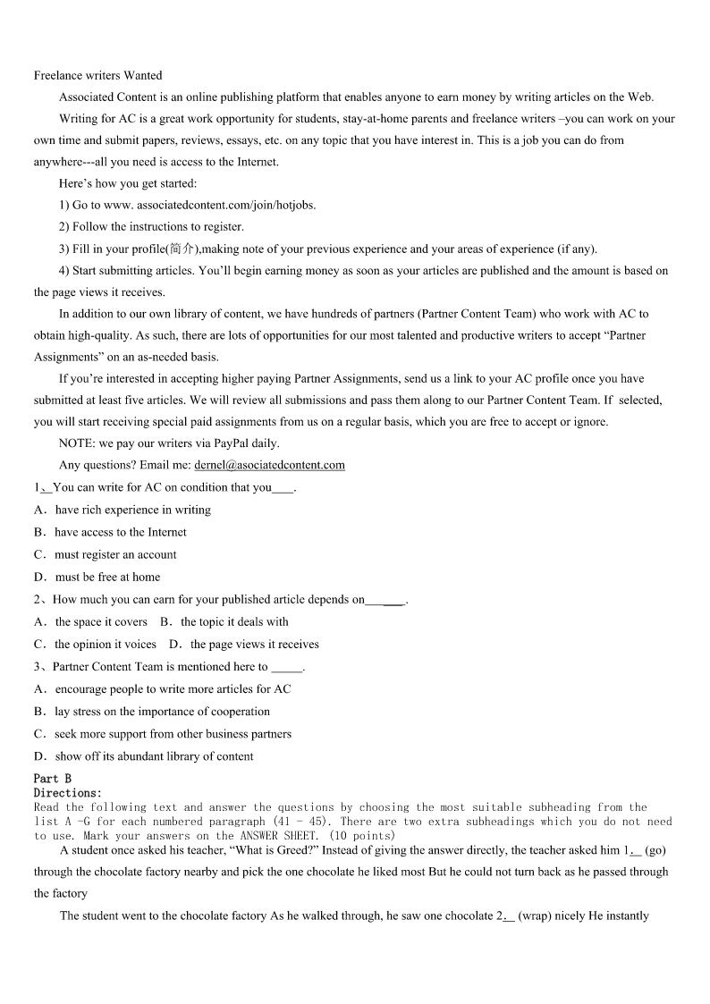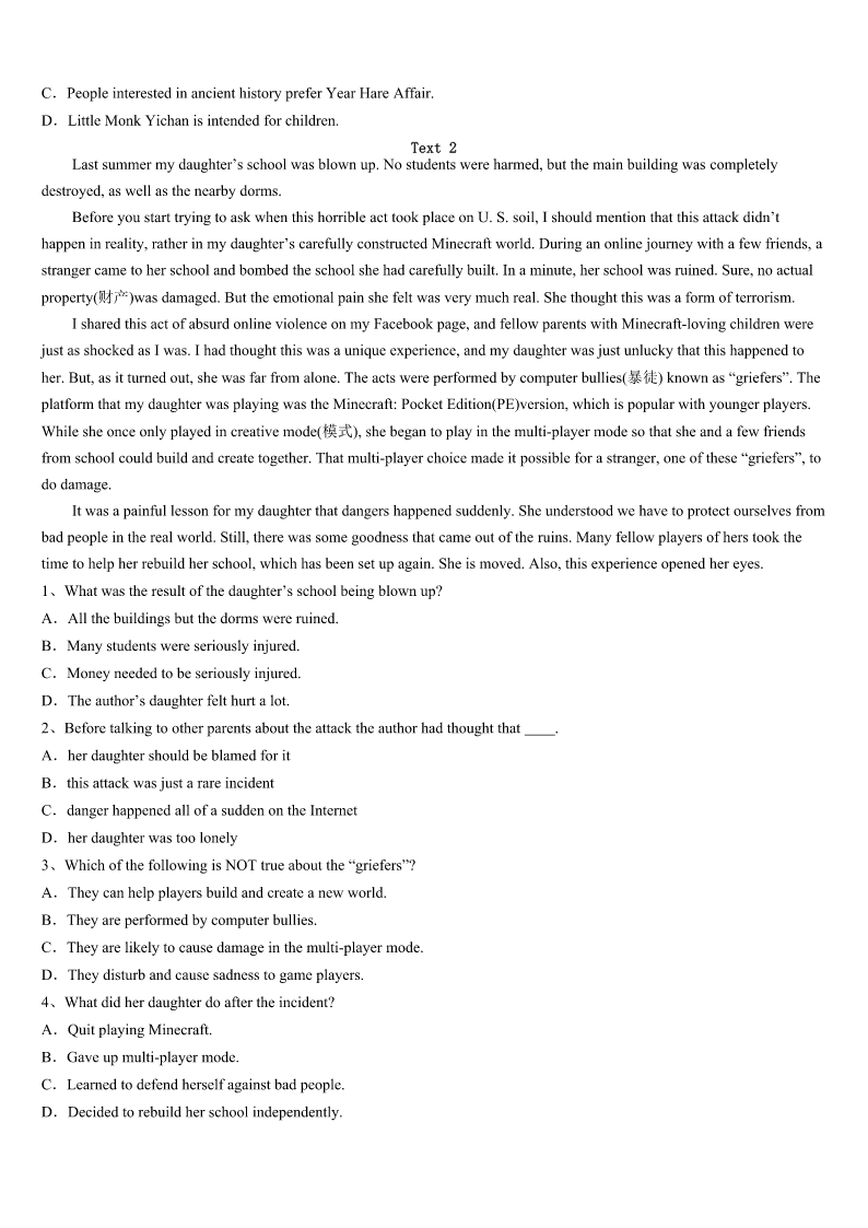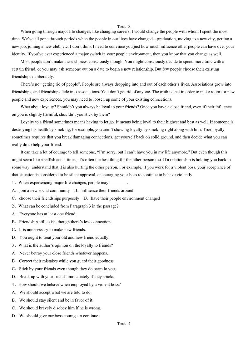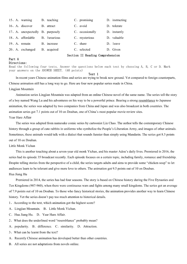 2023年山西省忻州市岢岚县考研《英语一》高分冲刺试卷 SectionIUseofEnglish Directions: Readthefollowingtext.Choosethebestword(s)foreachnumberedblankandmarkA,B,CorDonthe ANSWERSHEET.(10points) 阅读下面短文,从短文后各题所给的四个选项(A、B、C和D)中,选出可以填入空白处的最佳选项,并在答题卡上将 该项涂黑。 Dr.WilliamOslerwasworkinginoneoftheBritain’smilitaryhospitalsduringthewar.Oneday,hewascalledoutofthe ward(病房)duringhisdailyrounds(查房)tobegivenanimportant1thathisownsonhadbeenkilledonthefieldsof France.2bythenews,hestillwentbacktohisrounds.Hewas________differentforalongperiodafterward.The cheerfulnotewas3fromhisvoiceandneveragaindidfriends4himhearthemerrytunewhichhesooftenwhistledashe wentfromwardtoward. Althoughthesethingscouldnot5,somethingneweventuallycametotaketheirplace.Everyone6anewcompassion(同 情)inhiscareforthesoldierswhoeachdaystreamedin.Before,hewasanextremelydevotedphysician,whotreatedhis workseriouslyand7patientsverymuch.Nowtherewasa(n)8personalcompassion,likethatofafatherforhisson. Likemostpeoplewhohave________suchlosses,Oslermusthavespentconsiderabletimeon9.Painwillchange us,ofteninvariousways.Itcanleaveusangryandbroken,or,asinthecaseofOsler,itcanbringforthgood10such ascompassionortenderness.Itisasifthephysicianchanneledhispainintoenergyandloveforothers,caringforthemashe wouldcareforhisownchild. HelenKeller,whowentthroughlifebothblindanddeaf,knewplentyabout________.Sheoncewiselysaid,“The11of lifeisoneofourgreatestblessings.Itmakesuspatientandsensitive'12usthatalthoughtheworldisfullofpain,itisalso fulloftheovercomingofit.” Theworldisfullofsuffering,andwecan’t13itnomaterhowhardwetry.Butthosewhoovercomegreatchallengeswill change14.Forourstrugglesenterourlivesasunwelcomeguests,buttheyalsobring15gifts.Andoncethepain decreases,thegifts16.Thesegiftsarelife’struetreasures,boughtatgreatprice,butcannotbe17inanyother way. 1、A.decisionB.messageC.positionD.memory 2、A.InspiredB.DisappointedC.ShockedD.Affected 3、A.previouslyB.purelyC.exactlyD.obviously 4、A.goneB.farC.freeD.safe 5、A.overB.beyondC.aroundD.except 6、A.returnB.disobeyC.neglectD.develop