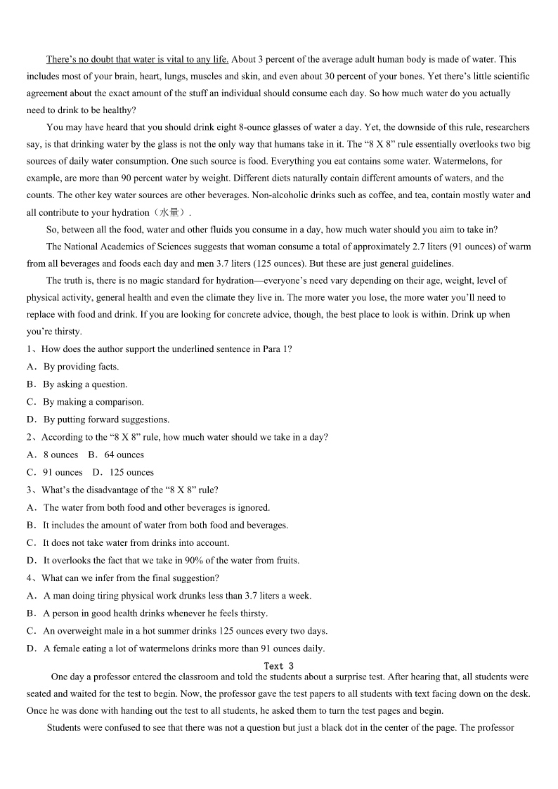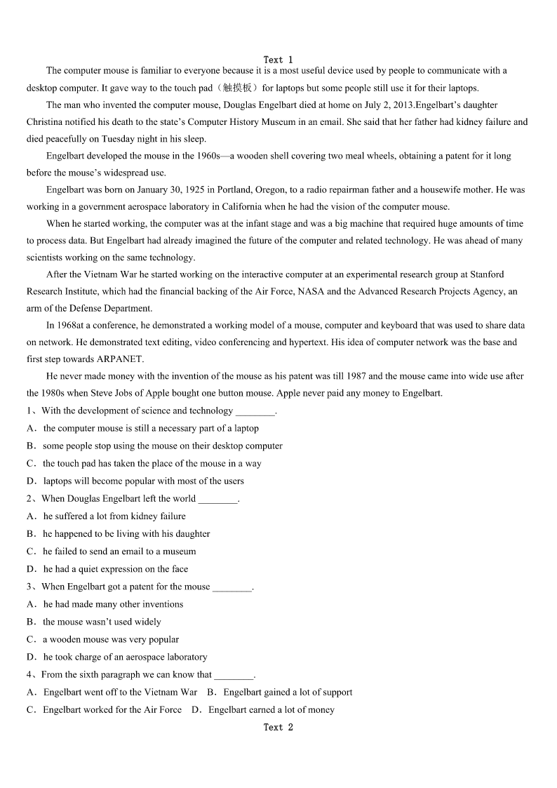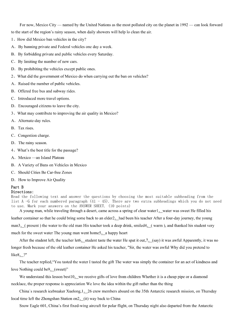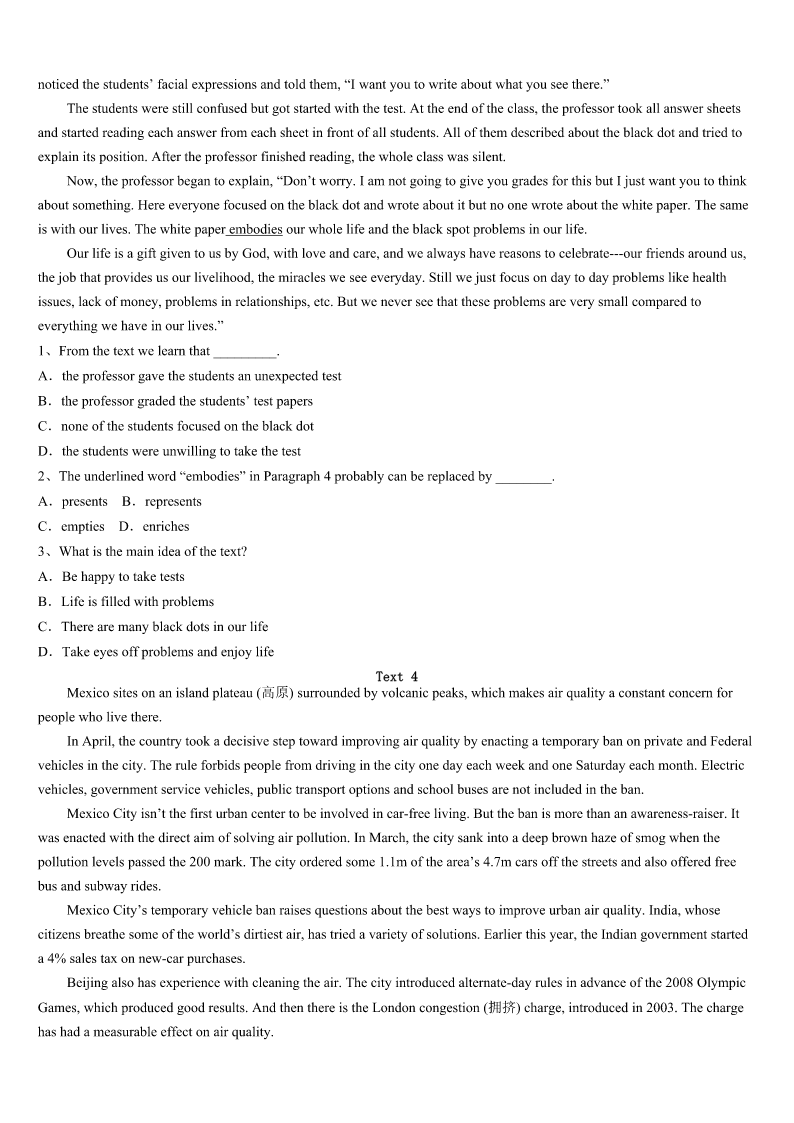考研《英语一》大名县2023年统考试题 SectionIUseofEnglish Directions: Readthefollowingtext.Choosethebestword(s)foreachnumberedblankandmarkA,B,CorDonthe ANSWERSHEET.(10points) Itwasacoldnight.AsIwaswalkingpasta1shop,ahomelessguycameuptomeandaskedmeforsome2.Ihave alwaysbeen3ofgivingoutmoneyto4peopleforacoupleofreasons.First,Idon'tknow5theywilldowithit.Thereis thepossibility(可能性)thattheywilluseitto6themselvesordosomethinggood.7,thereisthepossibilitythatthey willuseitforalcohol(酒精).IfI8handthemmoney,Iwillnever9.Second,Ibelievethatgivingmoney—thistypeof actkeepsthemmastateof10.Idon'twantto11themtoalwaysaskformoneywithouttryingto12itinadifferentway thatbringshappiness.Therearepeopleouttherewhodoneedahelpinghand,butyouneverknowwhattheyusethemoneyfor 13youask. Idecidedtoaskhimwhatheneededmoneyfor.Hesaidhejustwantedsomecoffee.Ididsmellalcoholcomingoutof him,soIwasalittle14.Ifallhewantedwascoffeeandwewereinfrontofacoffeeshop,Ithought,just15the intermediary(中间媒介)—money.SoIboughtacupofcoffeeforhim.Hewalkedawayhappilyandwas16tome. Icontinuethis17everytimeImeetwithhomelesspeople.18givingmoneyawayand19forthebest,gettingthem whatthey20willhaveagoodeffect(影响)foralongtime. 1、A.foodB.toyC.bookD.coffee 2、A.clothesB.moneyC.drinksD.medicine 3、A.unsureB.supportiveC.proudD.fond 4、A.carelessB.differentC.homelessD.worried 5、A.whyB.whenC.howD.what 6、A.congratulateB.betterC.devoteD.appreciate 7、A.ThereforeB.AboveallC.HoweverD.Forsure 8、A.stillB.alreadyC.justD.ever 9、A.judgeB.realizeC.seeD.know 10、A.lazinessB.uselessnessC.gloryD.calmness 11、A.persuadeB.encourageC.requestD.command 12、A.earnB.useC.findD.pay 13、A.thoughB.unlessC.becauseD.once 14、A.carefulB.sadC.patientD.excited 15、A.doubtB.saveC.skipD.serve 16、A.gratefulB.kindC.politeD.generous 17、A.customB.practiceC.trainingD.tradition 18、A.LessthanB.MorethanC.RatherthanD.Otherthan 19、A.lookingB.askingC.waitingD.hoping 20、A.wantB.thinkC.valueD.insist SectionIIReadingComprehension PartA Directions: Readthefollowingfourtexts.Answerthequestionsbeloweachtextbychoosin