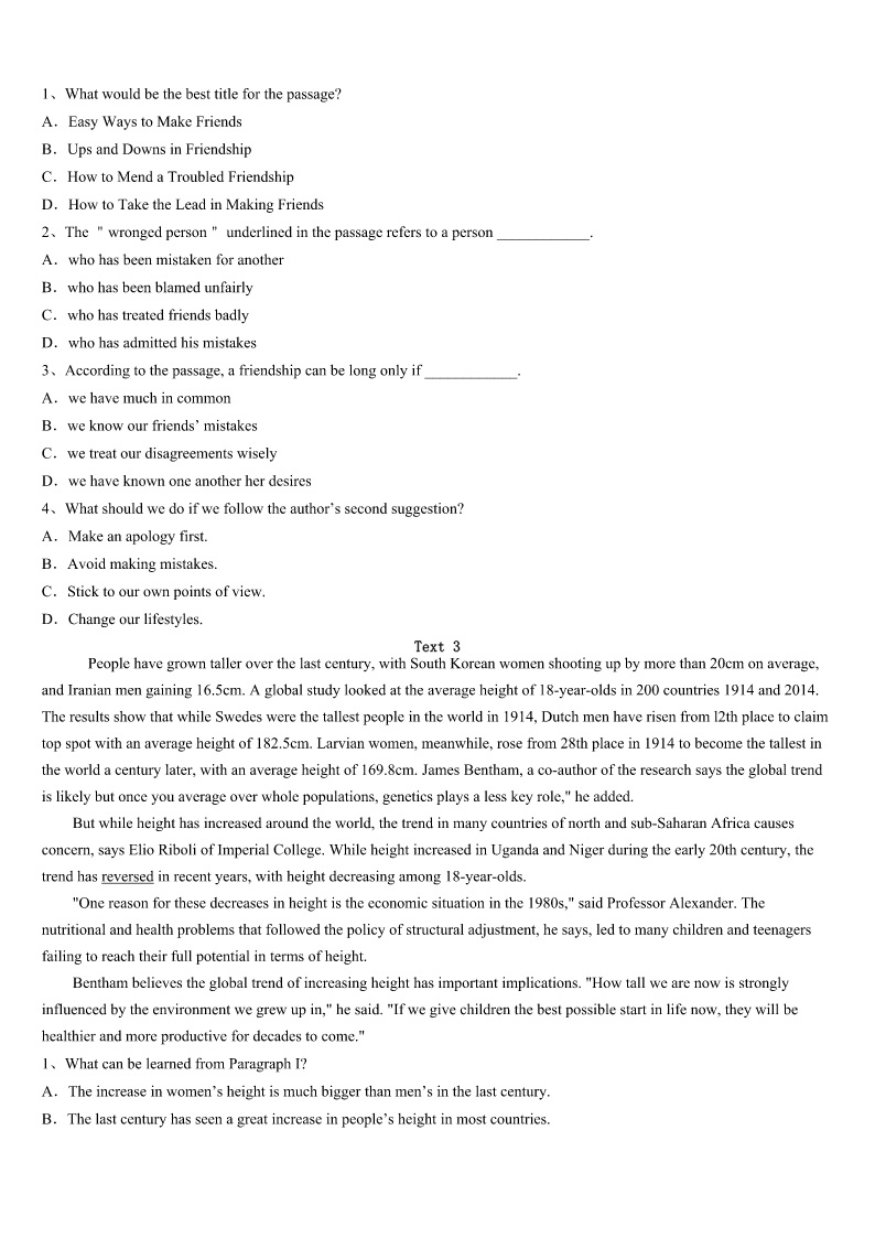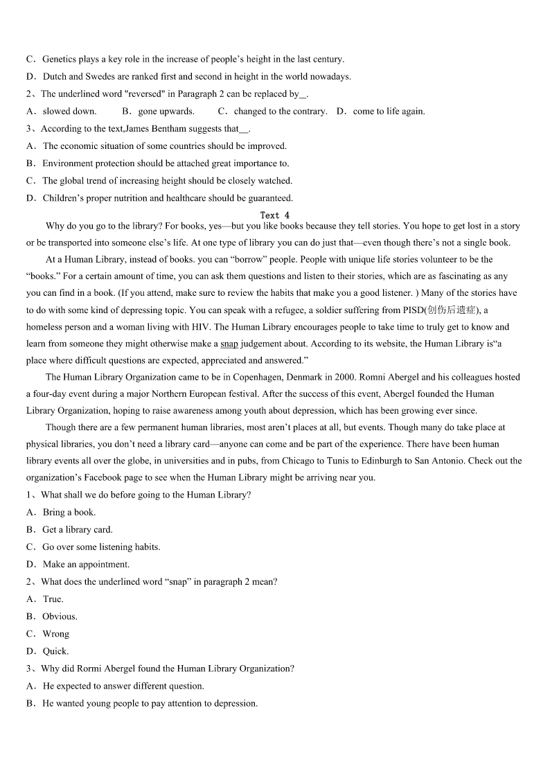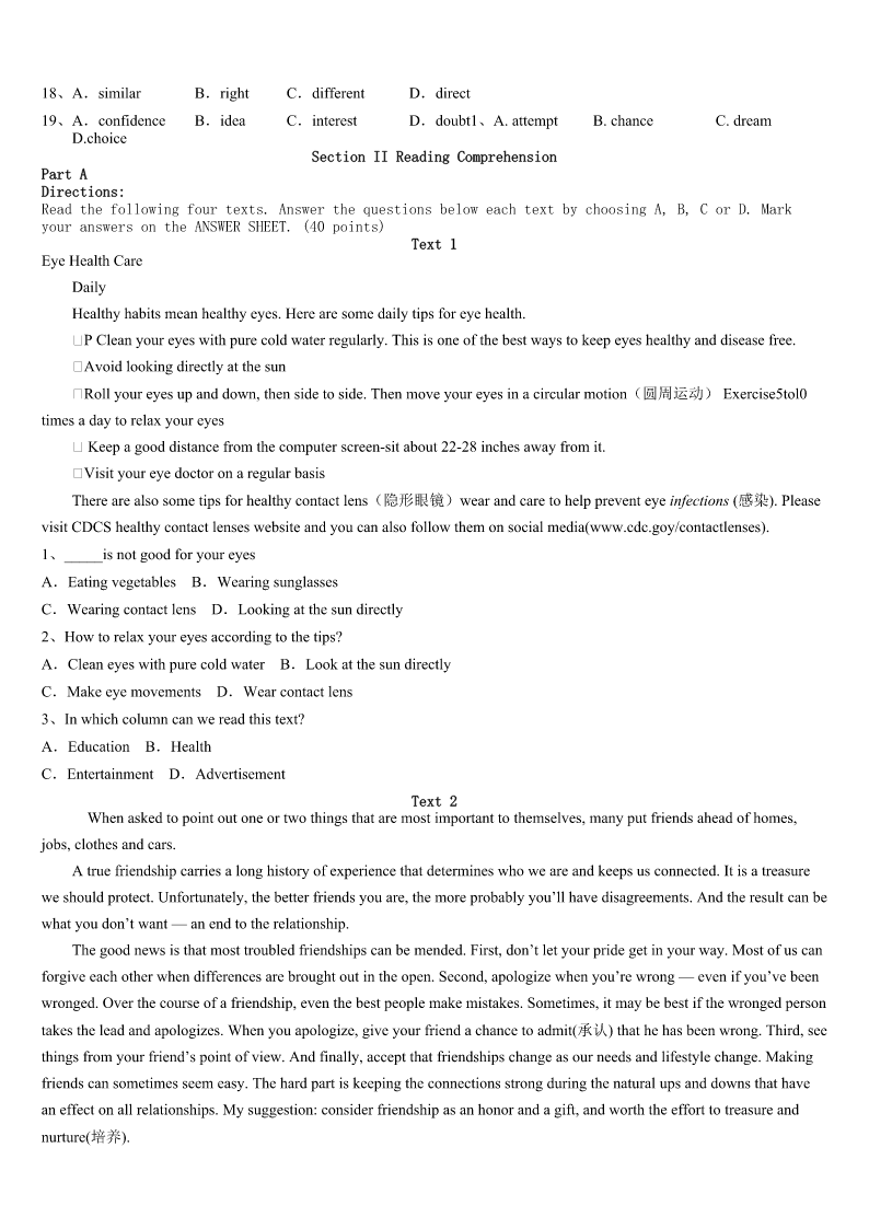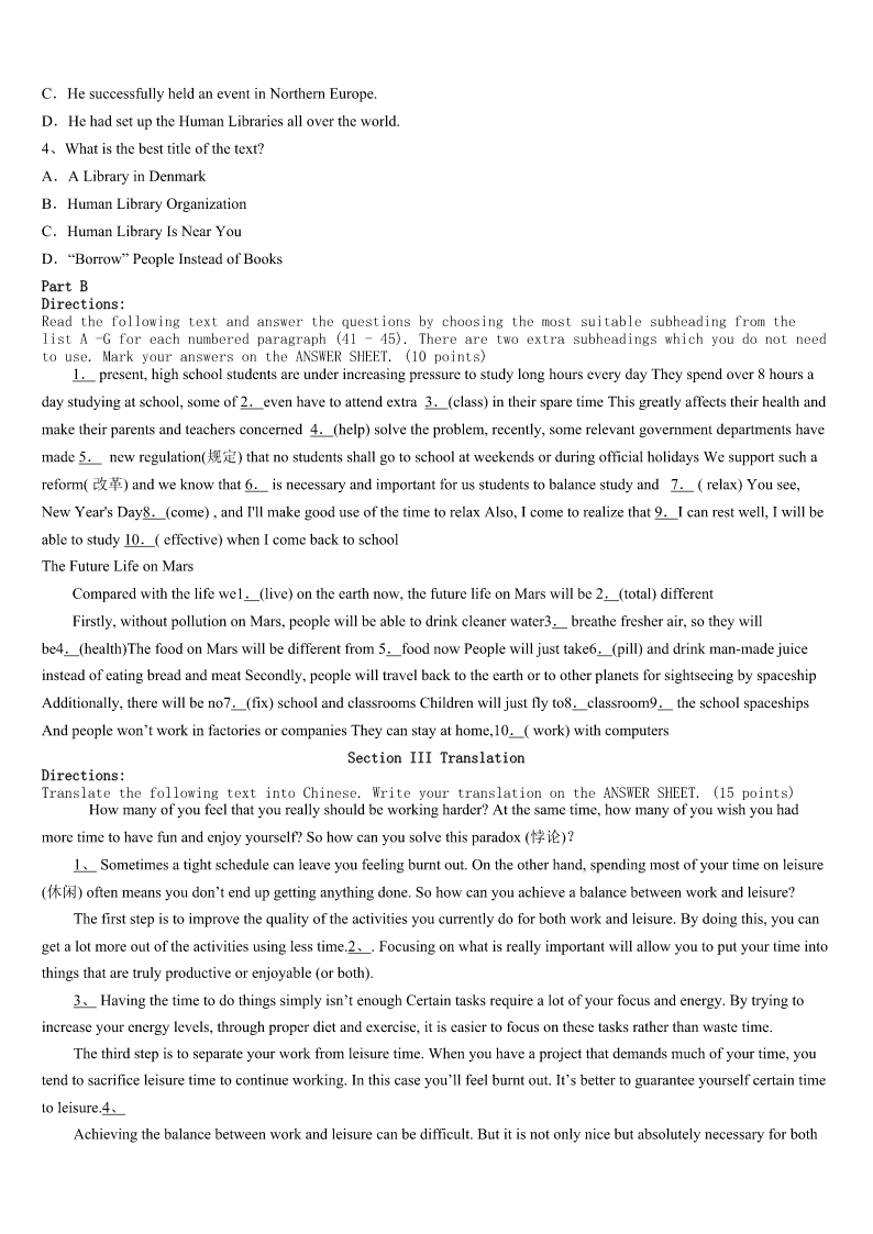 考研《英语一》天津市和平区2023年模拟预测试卷 SectionIUseofEnglish Directions: Readthefollowingtext.Choosethebestword(s)foreachnumberedblankandmarkA,B,CorDonthe ANSWERSHEET.(10points) WhilemoststudentsintheUSAareworryingaboutgettingintotheirdreamuniversities,othersworryaboutabiggerproblem. StudentsbroughttotheUSAillegally,whohavetoleavea36onapplicationsthatneedtheirSocialSecuritynumber,know theywillnotbeaccepted37theiroutstandinggradesandperformance.Theyoungimmigrants38fromtheU.S.school system,butonlyupthroughhighschool.Theireducationoften39thereduetoa1996federallawthatbansstatesfrom offeringin-statetuitionrate(学费)toillegalimmigrants40thestatealsooffersittoallU.S.citizens.However,theremaybe somehopebecauseoftheDREAMAct,whichwillbevotedoninCongress(国会). TheDREAMActisa/an41aidprogramfortheyoungillegalimmigrantswhoenteredtheU.S.beforetheywere16.Those whoapplyforthisprogramcanget42andtemporaryresiding(居住)status,whichcanbechanged,once43,toagreen cardaftersixyears.Theseimmigrantscanthenusetheirnewlyacquiredstatustoseekgreencardsfortheir44.Inthisway,it canalsoprovidecitizenshipfortheillegalforeignerswhobroughttheirchildrentotheUS. “Idon’tliveinfearofbeingdrivenoutofthis45,”saysJuan,ahighschooljuniorborninMexico.“Iliveanormallifehere 46thatnoweveryoneisgettingtheirdriver’slicense,andIcan’t.” JuancametotheU.S.withhismotherandolderbrotherateight.HeishopingfortheDREAMActtobe47.Whilehe admitsthatthereisnoobviousprejudiceinhighschool,Juan48facesunfairracialtreatment. “It49mewhenpeoplejokearoundandaskmeformygreencard,”Juanexplains.“I50,butdeepdownIknowtheyare offendingmefor51Ihavenocontrolover.IwasborninMexico,butmy52ishere.” Hisbrothernowattendsacommunity(社区)collegeandplanstoenterauniversity.Juanhopestotakea53path.“Forlong,I haveno54thatIcangotouniversity”Juansays.“Iknowit’sgoingtobehard,butaslongasIstayinthiscountry,Ihave a/an55.” 1、A.blankB.trackC.nameD.message 2、A.becauseofB.insteadofC.intermsofD.regardlessof 3、A.sufferB.benefitC.learnD.graduate 4、A.stopsB.beginsC.continuesD.changes 5、A.ifB.until