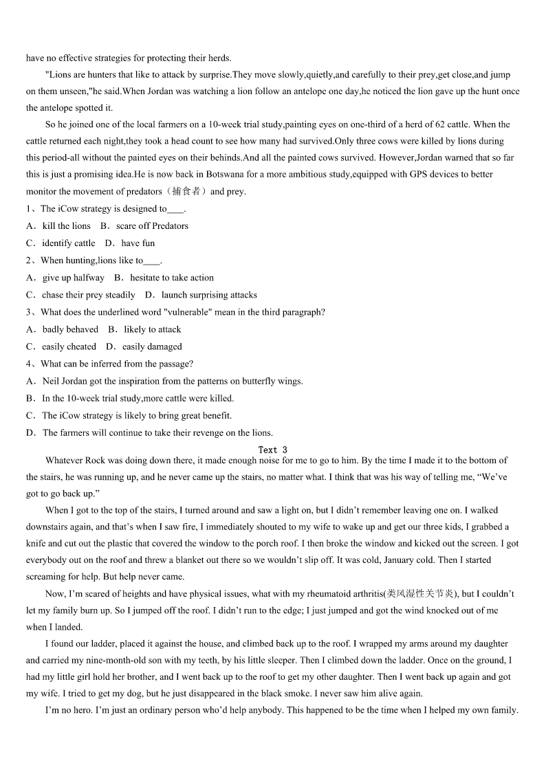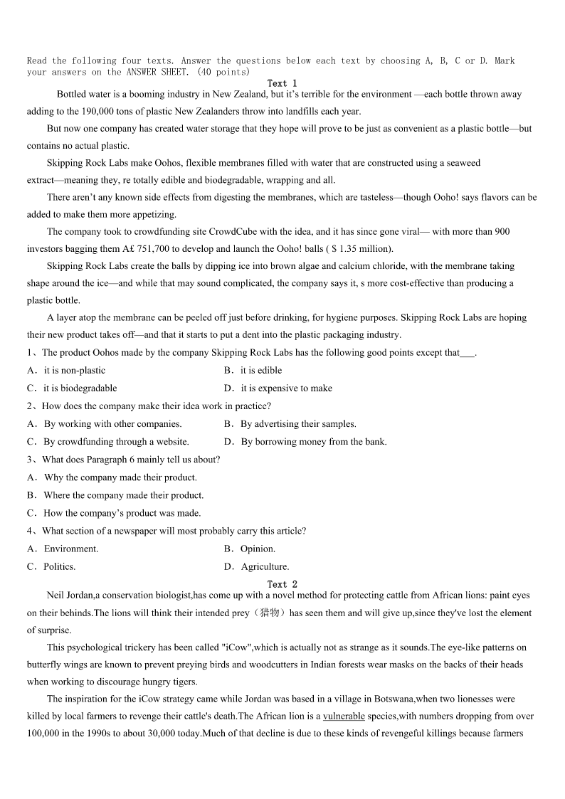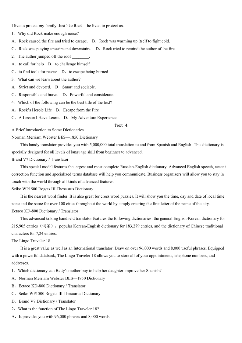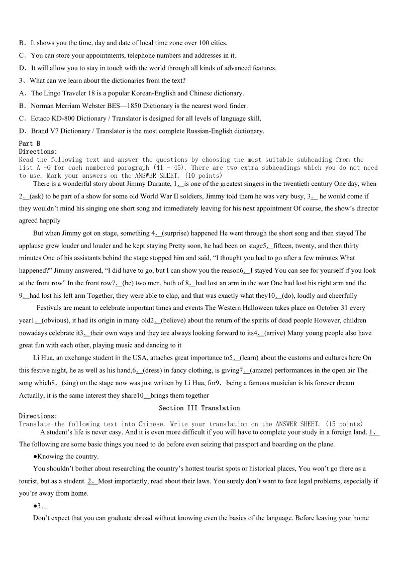 考研《英语一》四川省泸州市泸县2023年高分冲刺试卷 SectionIUseofEnglish Directions: Readthefollowingtext.Choosethebestword(s)foreachnumberedblankandmarkA,B,CorDonthe ANSWERSHEET.(10points) Formany1.Bymakingtheirownmoneytheycanbuywhatevertheywant.Italsodevelopsasenseofresponsibilityand independence. MostteensIknowhaveasmallsumofmoney.Their2givethemanallowance(零用钱).Forsome,anallowanceisgiven everyweek;for3,everymonthorso.Usuallytheycanget10to30dollarsamonthfromtheirparents.Anallowanceis typicallybasedonthe4ofchores(家务),suchaswashingthedishes,cleaningupone’sroom,takingoutthetrash,and5 thefloor6toyoungersiblings(兄弟姐妹)isalsoregardedasworthyofextracash,7somecases. Manyteensalsoworktoget8.Sincemostofmypeers(同伴)arenot9foraformaljob,manychoosepart-timepositions .Theserequirerelatively10timeandbasicallynotraining.Theycanhavethesejobslikebabysitting;11younger students,offeredbymostschools12asmallfee;13bagginggroceriesatlocalsupermarkets. 14spendinghabits,mostteensspendtheirmoneyinarelativelycarefreestyle.Often,amonth’sallowancecanbespentin justafewhours.I’mnotsayingthatteensinUSare15savingmoney.Indeed,inmanysituations,teenscanbequitelevel- headed(头脑冷静)in16moneytowardscollegeorother17plans.Thewayteensmanagetheirmoneyshouldnotbeseen asa18.Itmayjustbeadefiningcharacteristicoftheircarefree19. 1、A.adultsB.teensC.babiesD.elders 2、A.freedomB.prideC.happinessD.excitement 3、A.parentsB.teachersC.friendsD.schools 4、A.theothersB.anotherC.theotherD.others 5、A.completionB.performanceC.endD.success 6、A.wateringB.washingC.sweepingD.removing 7、A.CrueltyB.ColdnessC.UsefulnessD.Kindness 8、A.inB.onC.byD.for 9、A.dollarsB.moneyC.cashD.fees 10、A.satisfiedB.readyC.qualifiedD.allowed 11、A.littleB.muchC.moreD.no 12、A.helpingB.trainingC.tutoringD.informing 13、A.inneedofB.inreturnforC.withthepurposeofD.asaresultof 14、A.andB.butC.soD.yet 15、A.AsforB.BecauseofC.inspiteofD.Butfor 16、A.usedtoB.expertatC.lookingforwardtoD.incapableof 17、A.spendingB.earningC.savingD.collecting 18、A.futureB.presentC.pastD.last 19、A.characteristicB.wea