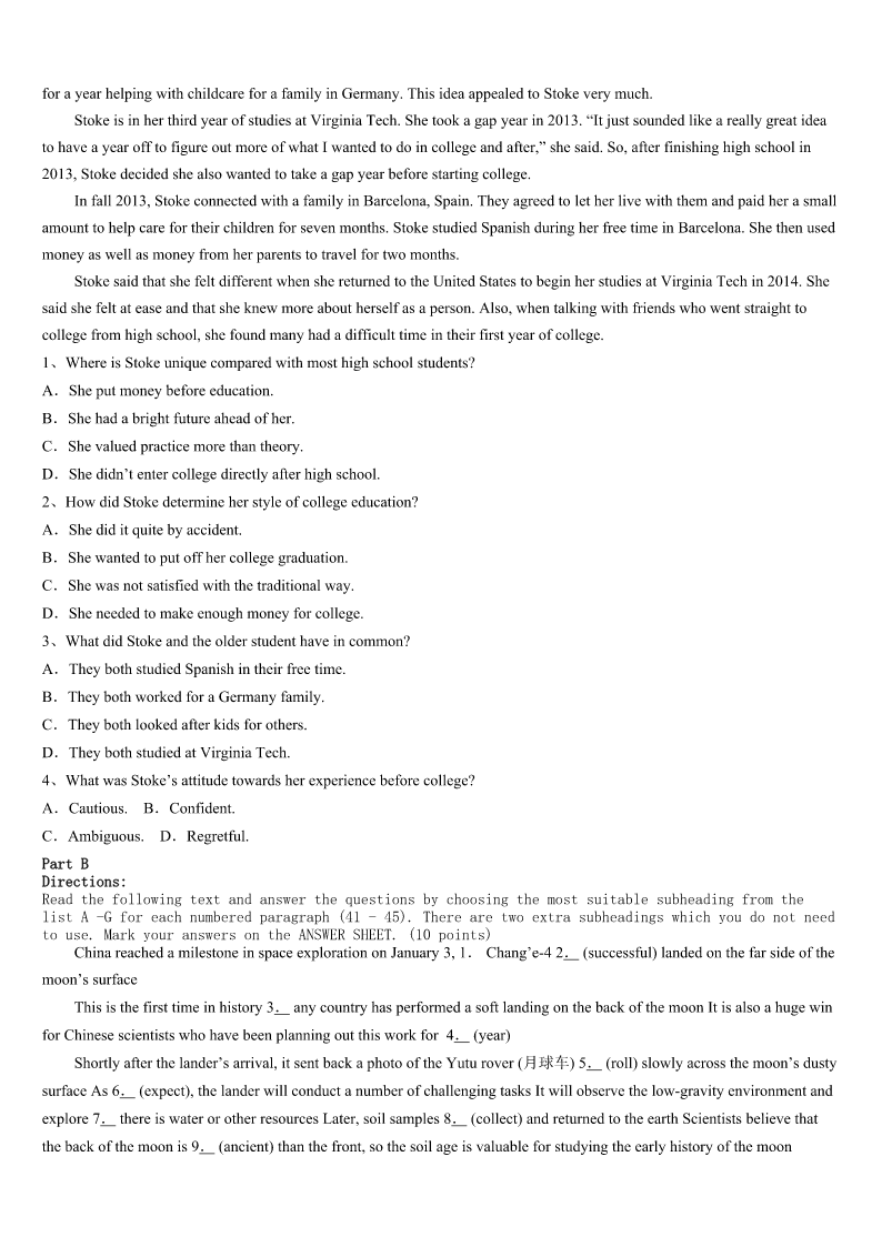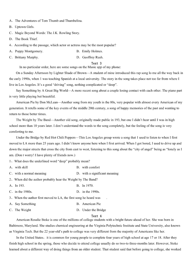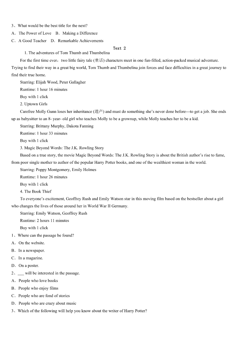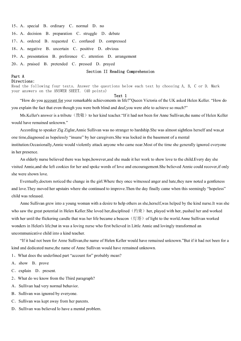 考研《英语一》安徽省亳州市利辛县2023年模拟预测试卷 SectionIUseofEnglish Directions: Readthefollowingtext.Choosethebestword(s)foreachnumberedblankandmarkA,B,CorDonthe ANSWERSHEET.(10points) III.完形填空(共20小题;每小题1.5分),满分30分) 阅读下面短文,掌握其大意,然后从3655各题所给的四个选项(A,B,C和D)中,选出最佳选项。 Oneday,apoorboywhowastryingtopayhiswaythroughschoolbysellinggoodsfromdoortodoorfoundthatheonly hadonedimeleft.Hewashungrysohedecidedto21foramealatthenexthouse. However,helosthisnerve22alovelyyoungwomanopenedthedoor.Insteadofamealheaskedforadrinkofwater. Shethoughthelooked23soshebroughthimalargeglassofmilk.Hedrankit24,andthenasked,“HowmuchdoI oweyou?” “Youdon’towemeanything,”she25.“Motherhastaughtmenevertoacceptpayfora _26.”Hesaid,“ThenIthankyoufromthebottomofmyheart.”AsHowardKellyleftthathouse,henotonlyfeltstronger 27,butitalsoincreasedhisfaithinGodandhumanrace.Hewasabouttogiveupandquitbeforethispoint. Yearslatertheyoungwomanbecamecriticallyill.Thelocaldoctorswerebaffled.Theyfinallysenthertothebigcity,where specialistscanbecalled28tostudyherraredisease.Dr.HowardKelly,now29,wascalledinfortheconsultation. Whenheheardthenameofthetownshecamefrom,astrangelight30hiseyes.Immediately,he31andwentdown throughthehospitalhallintoherroom. 32inhisdoctor’sgownhewentintoseeher.He33heratonce.Hewentbacktotheconsultationroomand34to dohisbesttosaveherlife.Fromthatdayon,hegave35__attentiontohercase. Afteralong36thebattlewaswon.Dr.Kelly37thebusinessofficetopassthefinalbilltohimforapproval.He lookedatitandthenwrotesomethingontheside.Thebillwassenttoherroom.Shewasafraidtoopenitbecauseshewas 38thatitwouldtaketherestofherlifetopayitoff.Finallyshelooked,andthenoteonthesideofthebillcaughther39. Shereadthesewords… “Paidinfullwithaglassofmilk.”Dr.HowardKelly Tearsofjoyfloodedhereyesasshe40silently.“Thankyou,God.Yourlovehasspreadthroughhumanheartsandhands.” 1、A.callB.makeC.begD.prepare 2、A.whileB.whenC.thoughD.unless 3、A.thirstyB.lazyC.tiredD.hungry 4、A.slowlyB.unexpectedlyC.steadilyD.hurriedly 5、A.announcedB.shookC.repliedD.doubted 6、A.rewardB.kindnessC.