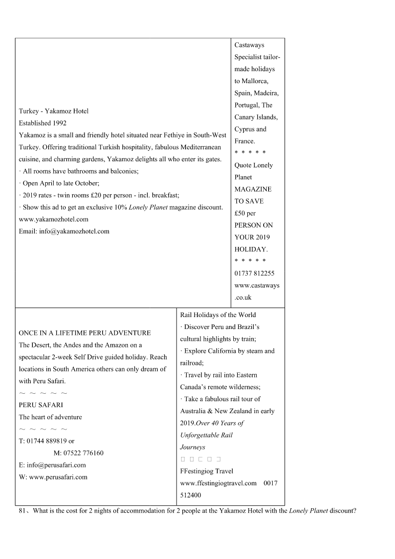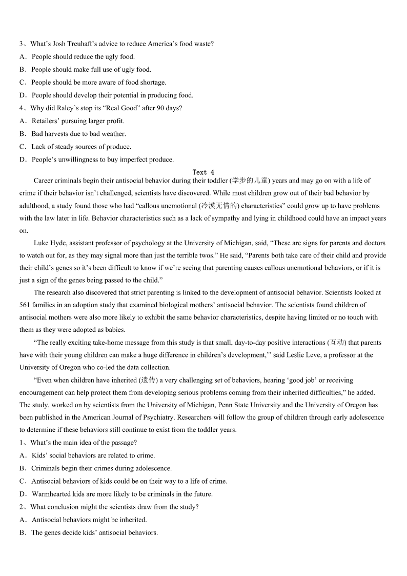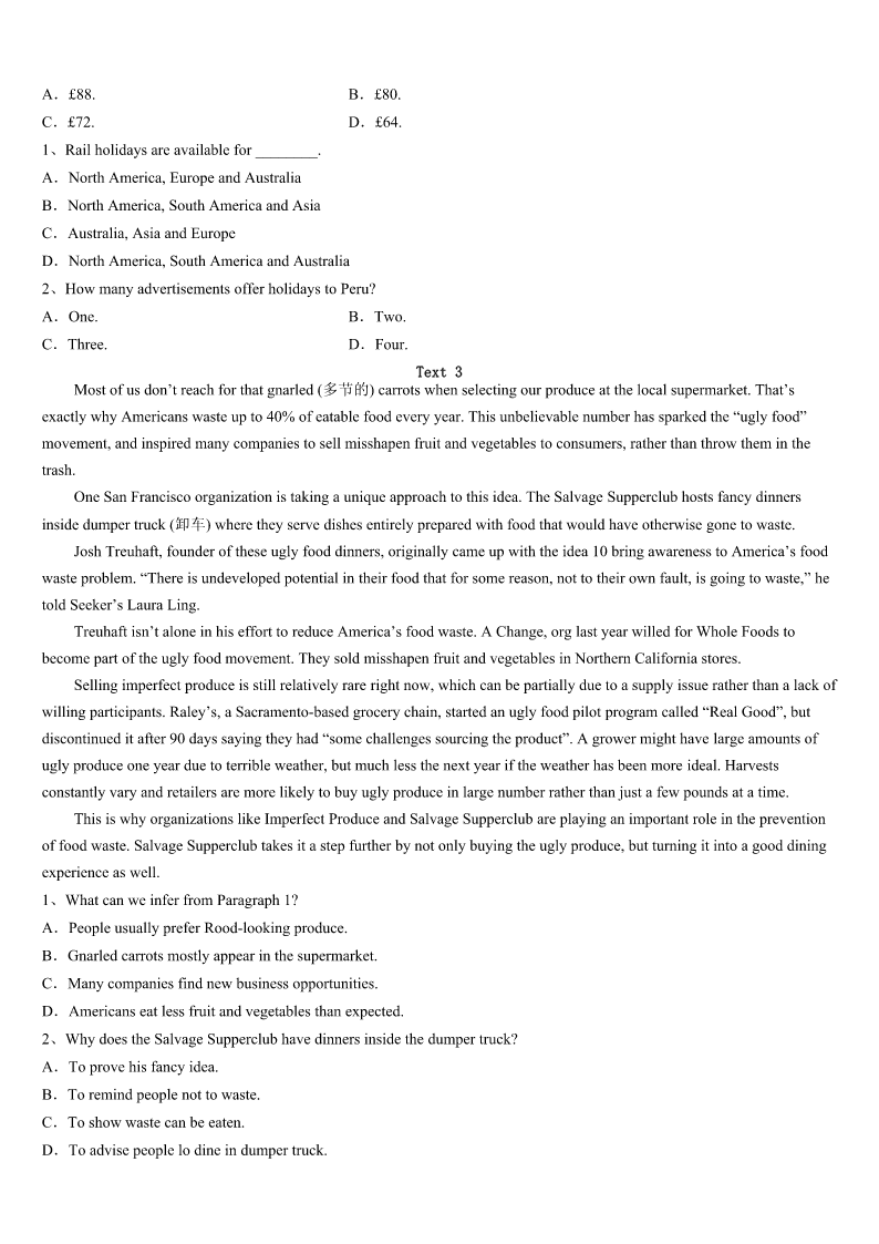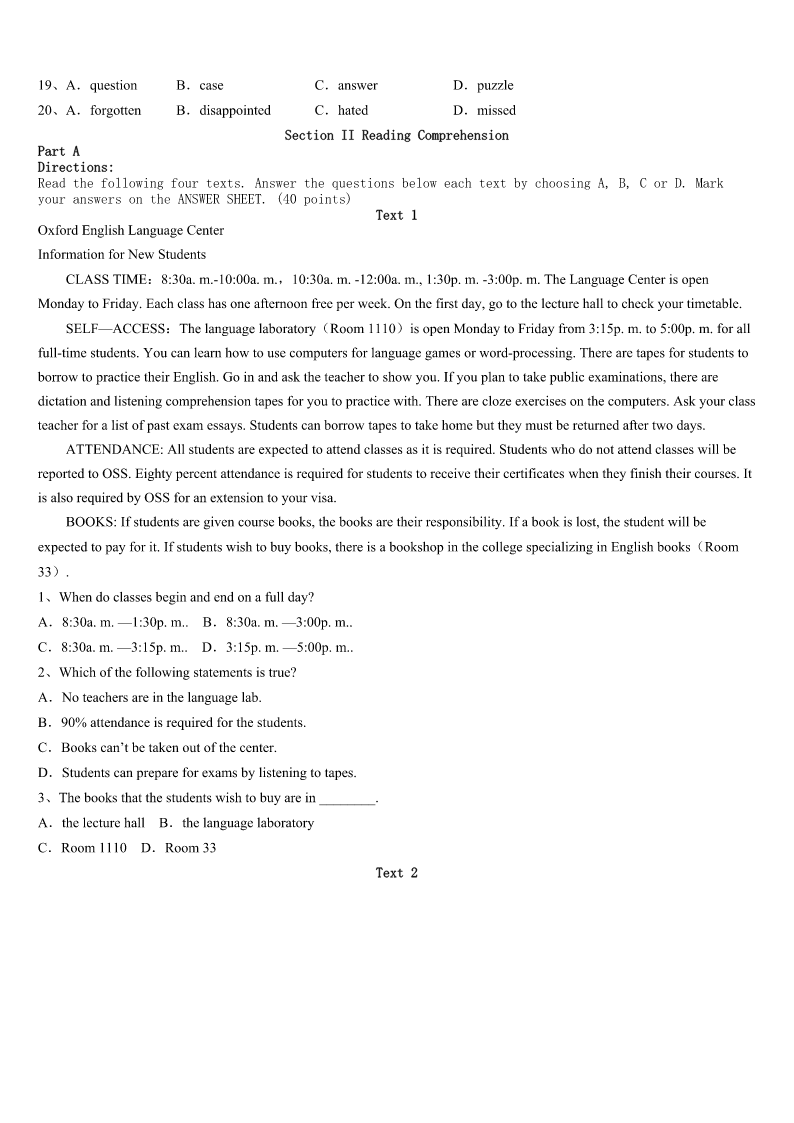考研《英语一》宁波市余姚市2023年点睛提分卷 SectionIUseofEnglish Directions: Readthefollowingtext.Choosethebestword(s)foreachnumberedblankandmarkA,B,CorDonthe ANSWERSHEET.(10points) Iwalkedintothegrocerystorenotparticularlyinterestedinbuyingsomething.Thesorrowof1myhusbandof37yearswas stilltoopainful.Andthisgrocerystoreheldsomanysweet2Boboftencamewithmeandalmosteverytimehe'd3togo offandlookforsomethingspecial.I'dalwaysseehimwalkingdownthewalkway4thethreeyellowrosesinhishands.Bob knewIlovedyellowroses.Withaheart5withpain,Icametothemeatshelf,Isearchedforthe6smallsteakand rememberedhowBobhadlovedhissteak. Suddenlyawomancamebesideme.Shewasinasoftgreendress.I7asshepickedupalargepackofT-bones,8themin herbasket,hesitated,andthenputthemback.Shesawmewatchingherandshesmiled."MyhusbandlovesT-bones,but9, attheseprices,Idon'tknow." "Myhusbandpassedawayeightdaysago,"Itoldher."Buyhimthesteaks.Andvalueevery10youhavetogether." ShesmiledandIsawthefeelinginher11assheplacedthepackageinherbasketand12away.Iturnedandpushedmy cartforwardtoo.SeveralminuteslaterIsawfirstthegreensuitandthen13theprettyladycomingtome.Inherarmsshe carriedsomething.Onherfacewasthe14smileIhadeverseen. Asshecamecloser,Isawwhatsheheldand15welleddown."Theseareforyou,"shesaidandplacedthreebeautifulyellow rosesinmyarms.Sheplacedagentlekissonmycheek,thensmiledagain.Iwantedtotellherwhattheroses16,butstill unabletospeak.Iwatchedasshewalkedawayastearscloudedmy17Ilookeddownatthebeautifulrosesandfoundit almost18Howdidsheknow? Suddenlythe19seemedsoclear.Iwasn'talone."Oh,Bob,youhaven't20me,haveyou?"Iwhispered,withtearsinmy eyes.Hewasstillwithme,andshewashisangel. 1、A.leavingB.losingC.passingD.failing 2、A.flowersB.rosesC.thoughtsD.memories 3、A.pretendB.happenC.refuseD.decide 4、A.byB.betweenC.withD.during 5、A.fullB.pleasedC.filledD.crowded 6、A.perfectB.beautifulC.prettyD.very 7、A.sawB.watchedC.foundD.glared 8、A.fellB.carriedC.tookD.dropped 9、A.honestlyB.generallyC.usuallyD.exactly 10、A.dinnerB.momentC.timeD.year 11、A.handsB.voiceC.eyesD.basket 12、A.