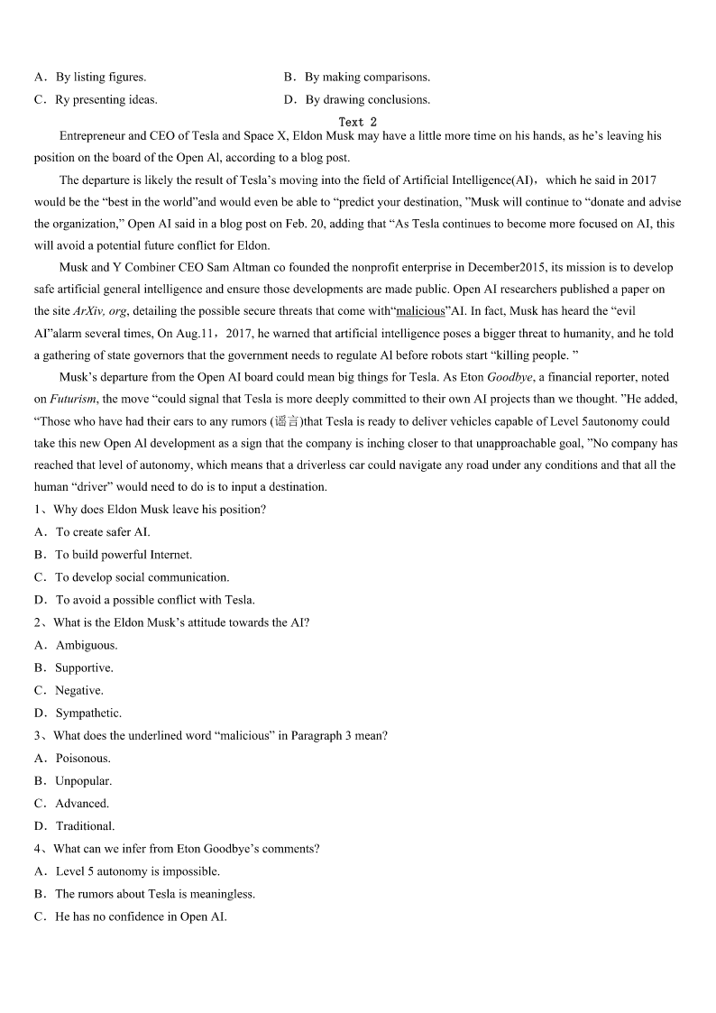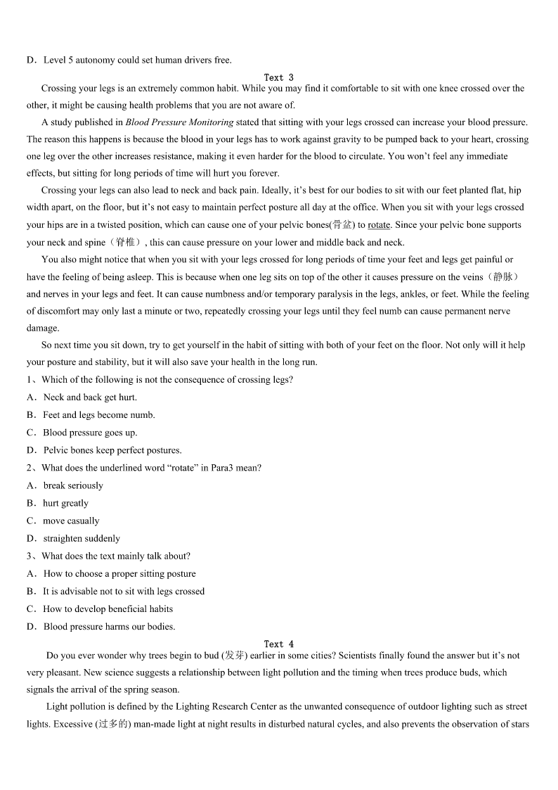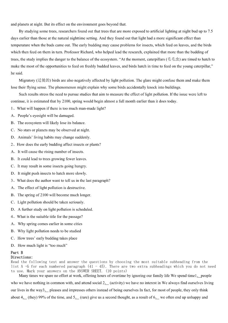 考研《英语一》宜宾市宜宾县2023年巅峰冲刺试卷 SectionIUseofEnglish Directions: Readthefollowingtext.Choosethebestword(s)foreachnumberedblankandmarkA,B,CorDonthe ANSWERSHEET.(10points) Afewyearsago,Iwasworkinginasmallorganization.Everyonewasbusyworkingonprojectsallday,1alotfrom stress.Oneparticularweek,Idecidedtomakepeoplesmile.Sooneevening,Iwroteupafewquotesthathave2meover theyears.Thenextmorning,Iwenttoworkabitearlyandquickly3themupbythemirrorsintheofficerestroom.Maybe someoneelsewouldenjoythe4asmuchasIhad,andperhapstheymightjust5theirday,Ithought. Forthenextfewmonths,someofthequotesgottakendown,butInoticedthatacouple6.Soperhapsothers7 them,too. Eventually,I8mycontract(合同)withthatorganizationandconditionsbroughtmetoothersettings.Acoupleyears passed,duringwhichI'dgetanemailupdatefrommy9bossandteammateseverysooften. Afewmonthsago,Iwas10toareunionwithmycolleaguestohear11onhowtheprojectIhadworkedonwas going.AlthoughI12workedinthisofficebuilding,Ihadreallyenjoyedworkingwithmyteam,andwas13toseethem allagain.Towardstheendoftheevent,Iwenttothe14,andfoundthequotethatIhadwrittentwoandahalf15earlier wasstillupinthesamespotbythemirror!It16: "Therealvoyageof17consistsnotinseekingnewlands,butinseeingwithneweyes."—MarcelProust Itwasa(n)18momenttofinditstillstoodoutasashiningremindereachtimesomeonewenttotherestroom.We never19howlongaseedplantedwilltaketobloomandgivefruit—butsimplykeepsowingseedsof20fromtheheart ... 1、A.expectingB.learningC.sufferingD.escaping 2、A.inspiredB.frustratedC.confusedD.surprised 3、A.rangB.cleanedC.pickedD.posted 4、A.mirrorsB.quotesC.daysD.projects 5、A.wasteB.spoilC.freshenD.celebrate 6、A.remainedB.fellC.disappearedD.separated 7、A.wroteB.likedC.hatedD.ignored 8、A.exchangedB.signedC.renewedD.finished 9、A.formerB.presentC.potentialD.real 10、A.persuadedB.attractedC.invitedD.sent 11、A.instructionsB.updatesC.suggestionsD.arguments 12、A.onceB.seldomC.frequentlyD.nolonger 13、A.happyB.awkwardC.shyD.astonished 14、A.officeB.bathroomC.cinemaD.exit 15、A.daysB.monthsC.yearsD.decades 16、A.w