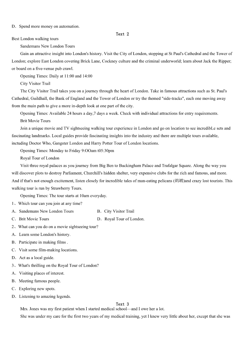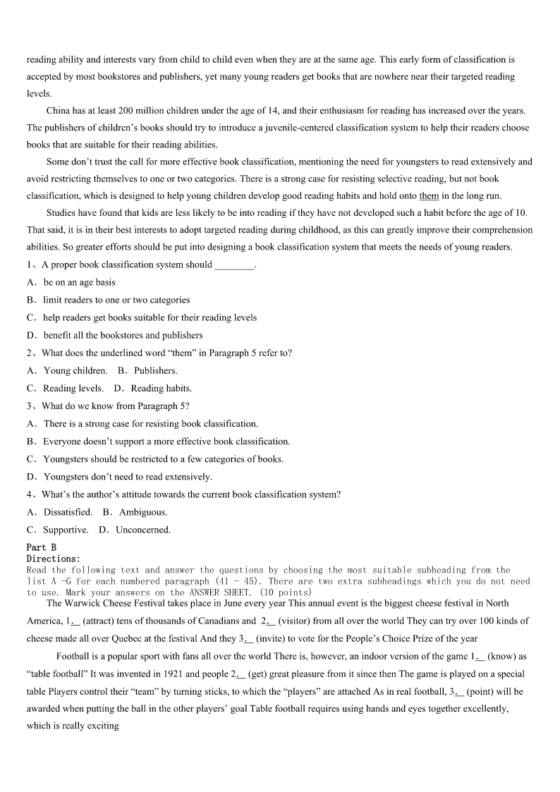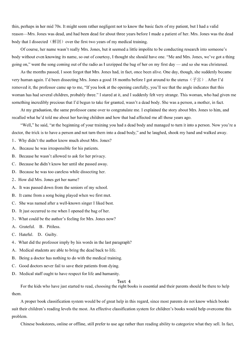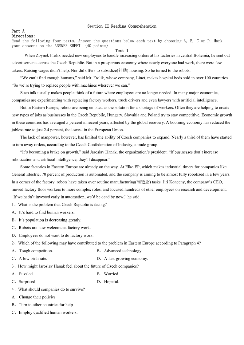 考研《英语一》宁阳县2023年全真模拟试卷 SectionIUseofEnglish Directions: Readthefollowingtext.Choosethebestword(s)foreachnumberedblankandmarkA,B,CorDonthe ANSWERSHEET.(10points) IalwaysrememberoneChristmaswhenwe1outsideoftown.Myolderbrotherhadajobinadifferentcity2he alwaysmadeithometocelebratetheholidays.DuringthefewdaysbeforeChristmasDay,we3aviolentsnowstormwith powerfulwinds.Itwasso4thatthecountryroadwasalmostimpassable. ThedaybeforeChristmaswasmore5thanIhadeverimagined.Myolderbrotherwasstuckatastranger’shome wherehehadbeen6tostayovernightbecauseofthestorm.Thepersonwas7enoughtolethimstayuntilmorning.But, the8wasthathecouldn’tgethiscartostartandtherewasnoassistanceavailable. So,mydadandI9.Wewereluckyenoughtomakeittowheremybrotherwas10.Afterhiscarwarmedup,he thoughtitmuch11toheadbacktohisplaceratherthantryandmakeithomeforChristmas.Soweheadedin12 directions. Thedrivebackgotevenworse.Wegotstuckinahugesnowdrift.A(n)13hadtobemade.Weplacedashovel(铲子) abouttenfeetbehindthecarto14anyoneelsethattherewasanobstruction(障碍物)ahead. Weleftthecarsinthe15,wrapped(包裹)blanketsaroundourheadsand16ontopofthesnowdrifts.Wemadeit aboutamileuptheroadtoaneighbor’sfarmhousewherewe17forthenextmilewalkhome.Weallmadeit18home thatnight. Christmaswasvery19thatyear.Itdidn’tmatteriftherewere20ornotunderthetreethenextmorning.Weeach gotourgift—thegiftoflife,homewithourfamilysafeandsound.Whatbettergiftisthere?None. 1、A.hidB.livedC.relaxedD.waited 2、A.orB.soC.butD.since 3、A.predictedB.discoveredC.rememberedD.experienced 4、A.badB.uniqueC.coldD.quiet 5、A.popularB.enjoyableC.importantD.memorable 6、A.orderedB.forcedC.invitedD.refused 7、A.kindB.strictC.smartD.curious 8、A.factB.resultC.problemD.message 9、A.gaveinB.setoutC.movedonD.turnedback 10、A.workingB.waitingC.sleepingD.studying 11、A.wiserB.crazierC.moredangerousD.moreinteresting 12、A.desiredB.expectedC.oppositeD.forward 13、A.excuseB.promiseC.changeD.decision 14、A.callB.warnC.criticizeD.persuade 15、A.snowB.garageC.churchD.backyard 16、A.dancedB.droveC.walkedD.stayed 17、A.wo
