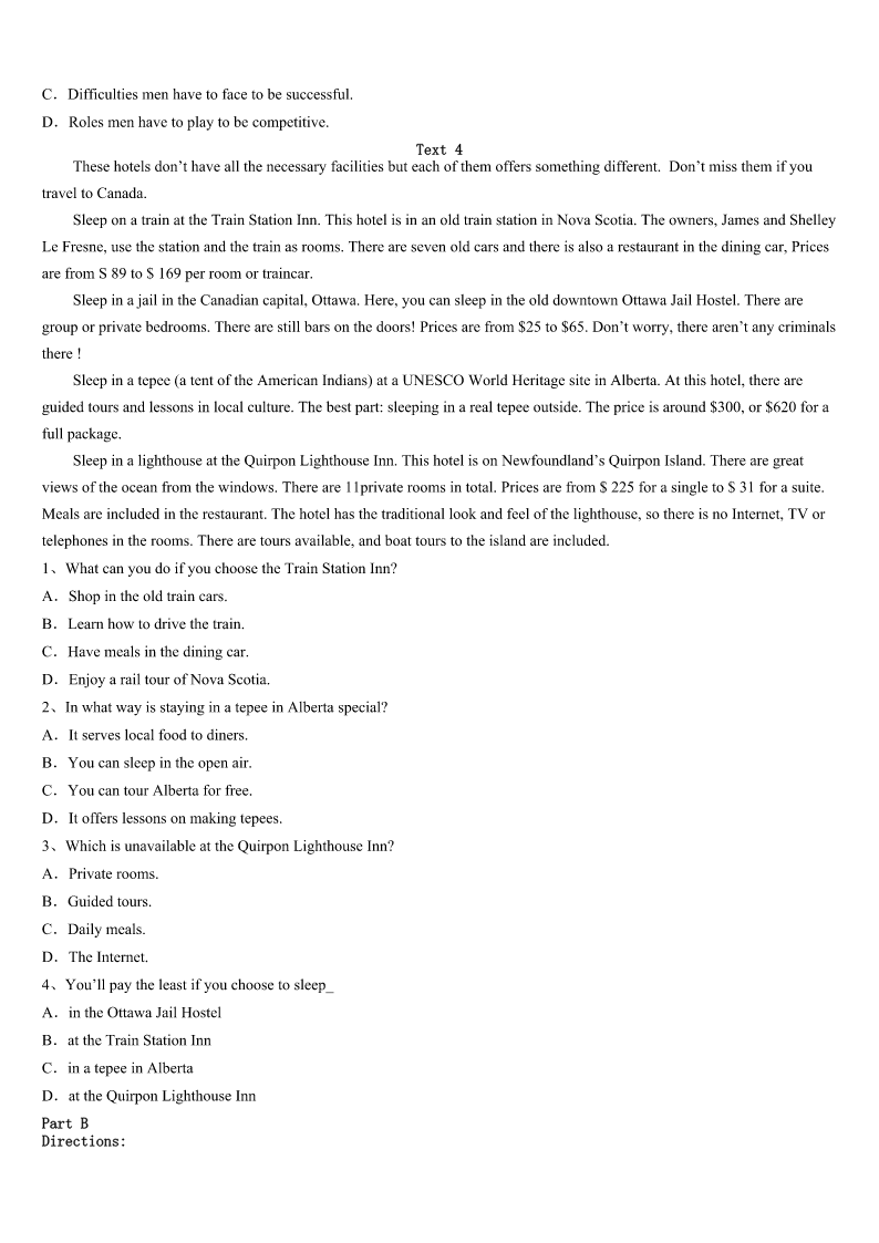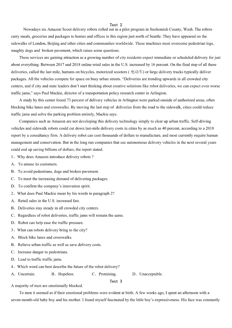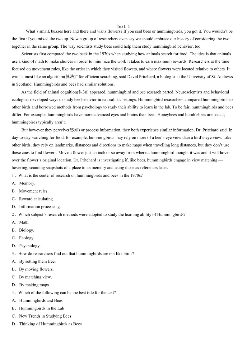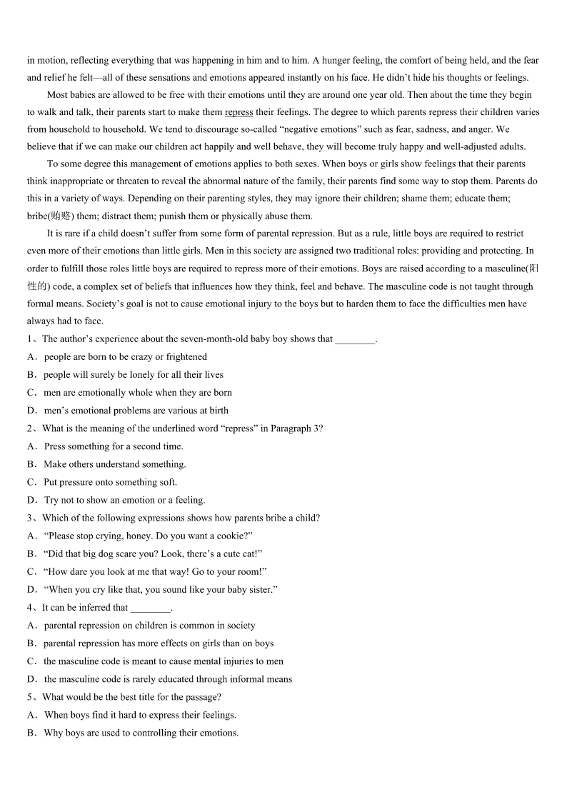 考研《英语一》宝鸡市扶风县2023年考前冲刺试题 SectionIUseofEnglish Directions: Readthefollowingtext.Choosethebestword(s)foreachnumberedblankandmarkA,B,CorDonthe ANSWERSHEET.(10points) Inthepast,peopleusuallybelievedwhatnewlybornbabieswantedwasfoodandtobekeptwarmanddry.Theythought babieswerenotableto1thingsuntiltheywerefiveorsixmonthsold.____theresearchersintheUnitedStatesnow believebabiesbeginlearningontheirfirst2oflife.Theysaybabiesarestrongly3bytheirenvironmentandonebaby will4ifhisorhermotherdoessomethingthatthebabylikes. Ababylearnstogetthebestcarepossiblebysmilingto5hermother.Thisishowbabiesstarttolearnto6and communicatewithotherpeople.Theresearcherssaythisabilitytolearn7inababyevenbeforebirth.Theyalso8the ideathatnewlybornbabiescan9andunderstandsoundstheyheardwhiletheywerestill10insidetheirmothers. Recently,anAmericanstudy11112babiesfoundbabieslearnedbetterwhentheywere____.Thebabiesappearedto learnwellwhethertheyweresittingupontheirown,sittinginseatsor12tositup.Theresearcherssaykeepingthatkind 13hadwhattheycalleda14effectonthebabies'abilitytolearnaboutobjects.Theysaythebodypositionmaybe linkedtodevelopmentinthe____.One15saysbabiescanpaymoreattentionto16anobjectiftheydonothavetobe abouttheirbalance. 1、A.learnB.knowC.rememberD.eat 2、A.BesidesB.WhileC.ButD.Therefore 3、A.hourB.monthC.weekD.day 4、A.influencedB.acceptedC.disturbedD.moved 5、A.cryB.smileC.singD.eat 6、A.annoyB.loveC.noticeD.please 7、A.connectB.liveC.speakD.smile 8、A.disappearsB.informsC.existsD.happens 9、A.inferB.supportC.denyD.instruct 10、A.recognizeB.realizeC.receiveD.record 11、A.sleepingB.deliveringC.shapingD.developing 12、A.helpingB.involvingC.raisingD.containing 13、A.sleepingsoundlyB.lyingdownC.sittingupD.awakingclearly 14、A.assistedB.forcedC.askedD.mentioned 15、A.hobbyB.gestureC.decorationD.purpose 16、A.negativeB.unmarkedC.significantD.side 17、A.languageB.brainC.feelingD.body 18、A.psychologistB.motherC.doctorD.researcher 19、A.exploringB.findingC.feelingD.discovering 20、A.eagerB.worriedC.confidentD.curious SectionIIR