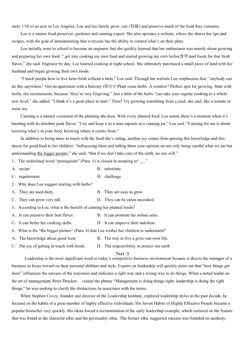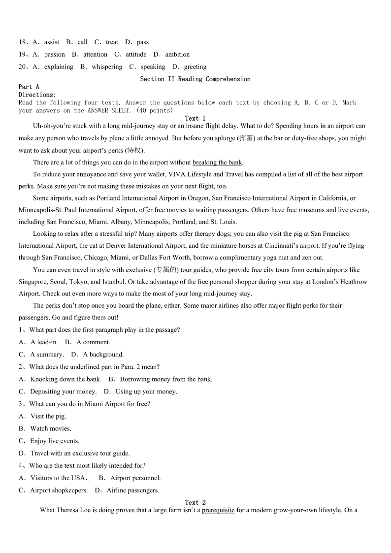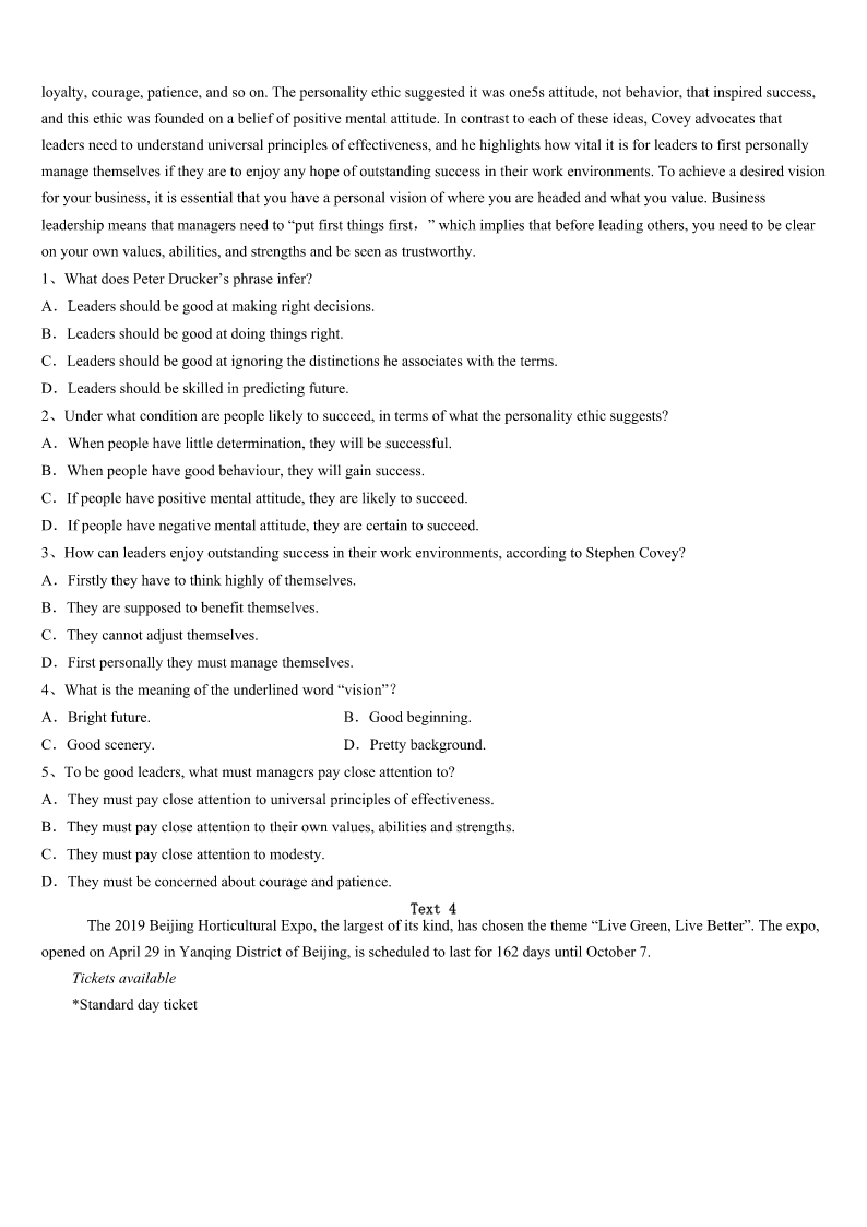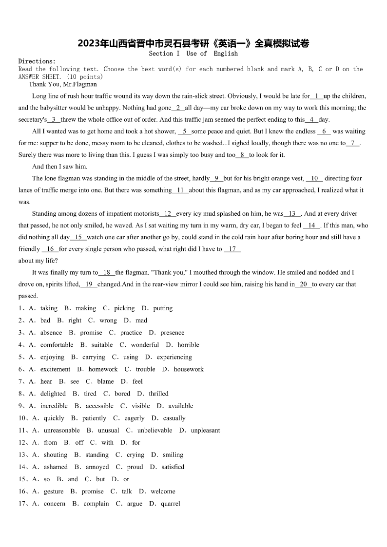 2023年山西省晋中市灵石县考研《英语一》全真模拟试卷 SectionIUseofEnglish Directions: Readthefollowingtext.Choosethebestword(s)foreachnumberedblankandmarkA,B,CorDonthe ANSWERSHEET.(10points) ThankYou,Mr.Flagman Longlineofrushhourtrafficwounditswaydowntherain-slickstreet.Obviously,Iwouldbelatefor1upthechildren, andthebabysitterwouldbeunhappy.Nothinghadgone2allday—mycarbrokedownonmywaytoworkthismorning;the secretary's3threwthewholeofficeoutoforder.Andthistrafficjamseemedtheperfectendingtothis4day. AllIwantedwastogethomeandtookahotshower,5somepeaceandquiet.ButIknewtheendless6waswaiting forme:suppertobedone,messyroomtobecleaned,clothestobewashed...Isighedloudly,thoughtherewasnooneto7. Surelytherewasmoretolivingthanthis.IguessIwassimplytoobusyandtoo8tolookforit. AndthenIsawhim. Theloneflagmanwasstandinginthemiddleofthestreet,hardly9butforhisbrightorangevest,10directingfour lanesoftrafficmergeintoone.Buttherewassomething11aboutthisflagman,andasmycarapproached,Irealizedwhatit was. Standingamongdozensofimpatientmotorists12everyicymudsplashedonhim,hewas13.Andateverydriver thatpassed,henotonlysmiled,hewaved.AsIsatwaitingmyturninmywarm,drycar,Ibegantofeel14.Ifthisman,who didnothingallday15watchonecarafteranothergoby,couldstandinthecoldrainhourafterboringhourandstillhavea friendly16foreverysinglepersonwhopassed,whatrightdidIhaveto17 aboutmylife? Itwasfinallymyturnto18theflagman."Thankyou,"Imouthedthroughthewindow.HesmiledandnoddedandI droveon,spiritslifted,19changed.Andintherear-viewmirrorIcouldseehim,raisinghishandin20toeverycarthat passed. 1、A.takingB.makingC.pickingD.putting 2、A.badB.rightC.wrongD.mad 3、A.absenceB.promiseC.practiceD.presence 4、A.comfortableB.suitableC.wonderfulD.horrible 5、A.enjoyingB.carryingC.usingD.experiencing 6、A.excitementB.homeworkC.troubleD.housework 7、A.hearB.seeC.blameD.feel 8、A.delightedB.tiredC.boredD.thrilled 9、A.incredibleB.accessibleC.visibleD.available 10、A.quicklyB.patientlyC.eagerlyD.casually 11、A.unreasonableB.unusualC.unbelievableD.unpleasant 12、A.fromB.offC.with