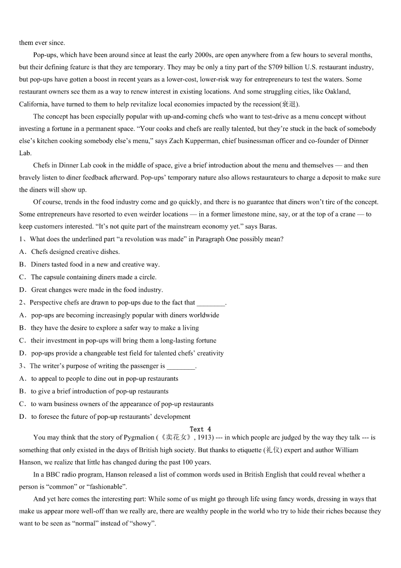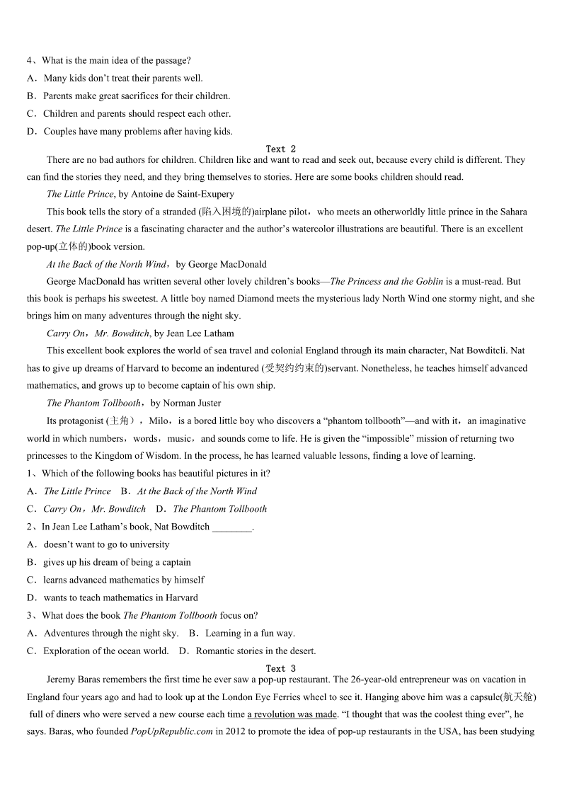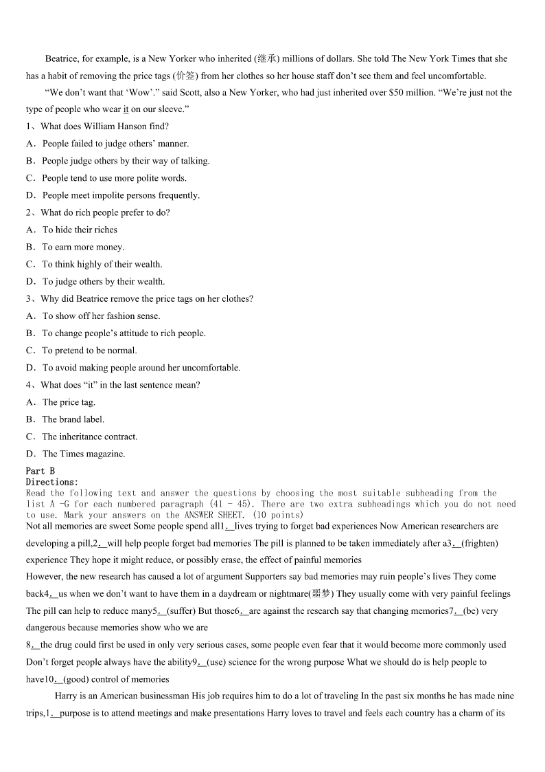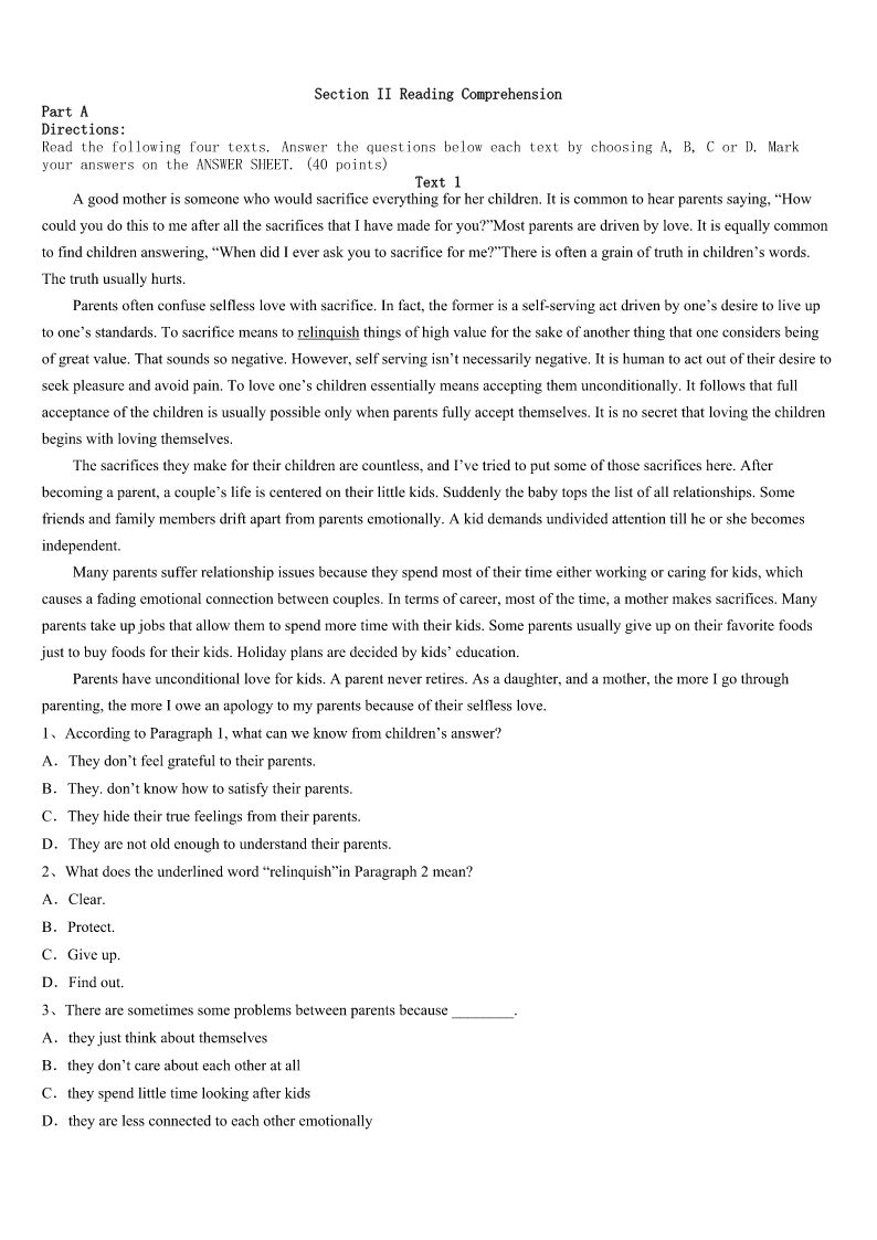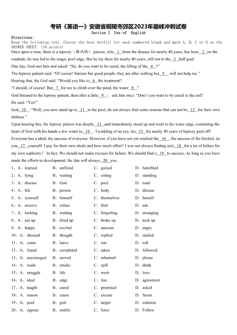考研《英语一》安徽省铜陵市郊区2023年巅峰冲刺试卷 SectionIUseofEnglish Directions: Readthefollowingtext.Choosethebestword(s)foreachnumberedblankandmarkA,B,CorDonthe ANSWERSHEET.(10points) Onceuponatime,thereisaleprosy(麻风病)patient,who1fromthediseasefornearly40years,hasbeen2onthe roadside,hewasledtothemagicpooledge,Buthelaytherefornearly40years,stillnottothe3halfgoal. Oneday,Godmethimandasked:“Sir,doyouwanttobecured,theliftingofthe4?” Theleprosypatientsaid:“Ofcourse!Sinisterbutgoodpeople,theyareafternothingbut5,willnothelpme.” Hearingthat,theGodsaid:“Wouldyouliketo6thetreatment? “Ishould,ofcourse!But7formetoclimboverthepond,thewater8” Godlistenedtotheleprosypatient,thenafteralittle9,askhimonce:“Don’tyouwanttobecuredintheend? Hesaid:“Yes!” God10:“Well,younowstandupto11tothepool,donotalwaysfindsomereasonsthatcannotbe12fortheirown defense.” Uponhearingthis,theleprosypatientwasdeeply13andimmediatelystoodupandwenttothewateredge,containingthe heartofGodwithhishandsafewwaterto14.Twinklingofaneye,his15fornearly40yearsofleprosypaidoff! Everyonehasaideal,thesuccessofeveryone.However,ifyouhavenotyetreachedthe16,thesuccessoffar-fetched,do you17yourself:Ipayfortheirownidealsandhowmucheffort?Iwasnotalwaysfindinga(n)18foralotoffailurefor myownsophistry?Infact,Weshouldnotmakeexcusesforfailure.Weshouldfinda19tosuccess,Aslongasyouhave madetheeffortstodevelopment,thefatewillalways20you. 1、A.learnedB.suffered`C.gainedD.benefited 2、A.lyingB.waitingC.sittingD.standing 3、A.diseaseB.GodC.poolD.road 4、A.lifeB.personC.bodyD.disease 5、A.yourselfB.himselfC.themselvesD.herself 6、A.receiveB.refuseC.findD.ask 7、A.lookingB.waitingC.forgettingD.arranging 8、A.putupB.driedupC.brokeupD.tookup 9、A.happyB.excitedC.anxiousD.angry 10、A.shoutedB.thoughtC.repliedD.smiled 11、A.comeB.leaveC.runD.roll 12、A.foundB.completedC.takenD.followed 13、A.encouragedB.movedC.ashamedD.please 14、A.washB.smokeC.spillD.drink 15、A.struggleB.lifeC.workD.love 16、A.idealB.edgeC.lineD.agreement 17、A.taughtB.curedC.promisedD.asked 18、A.reasonB.causeC.excus