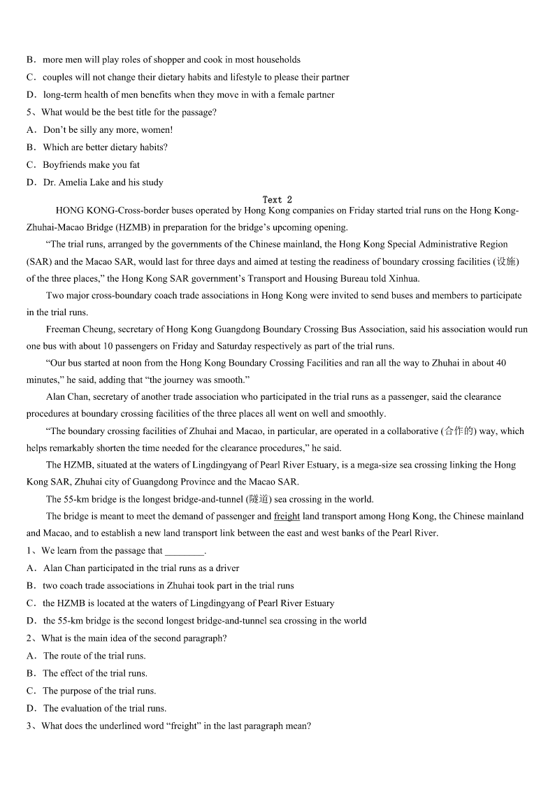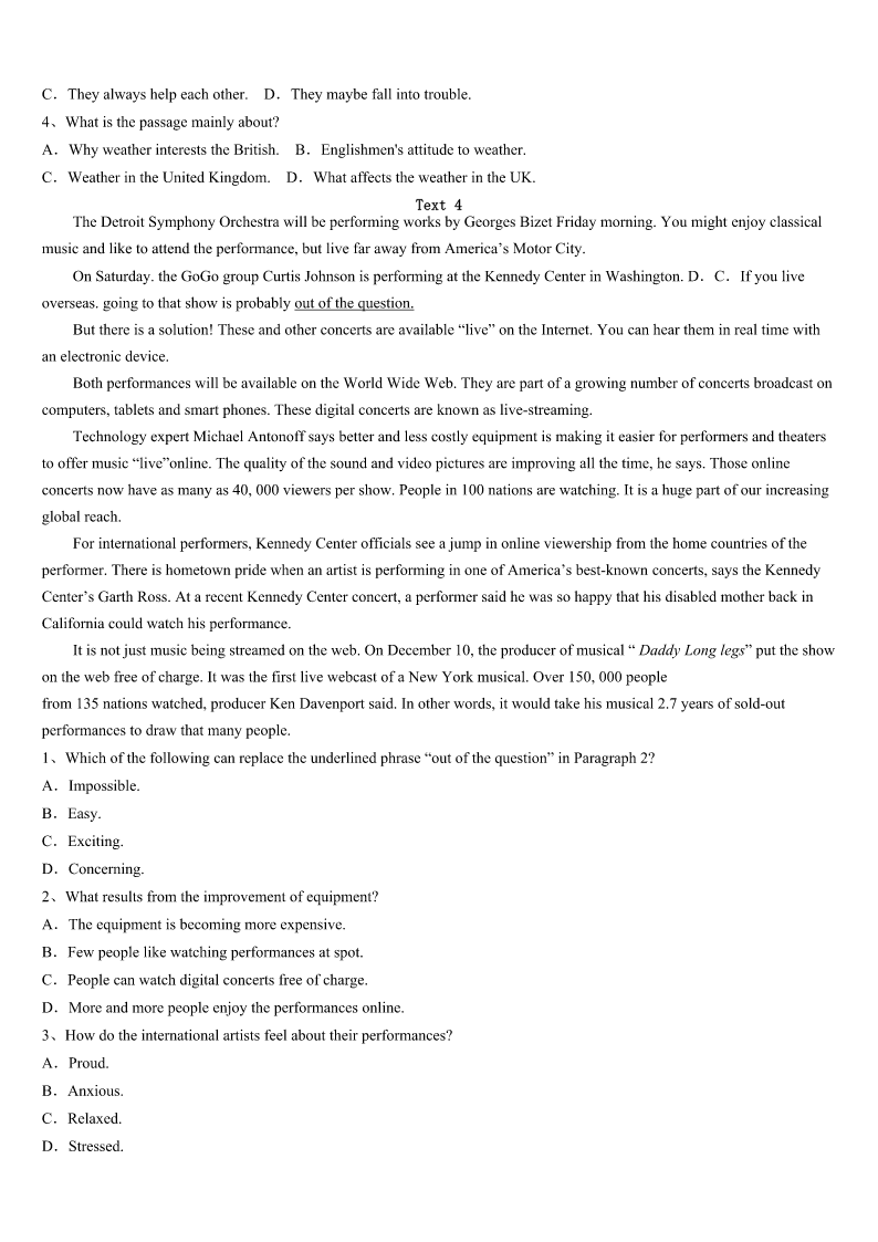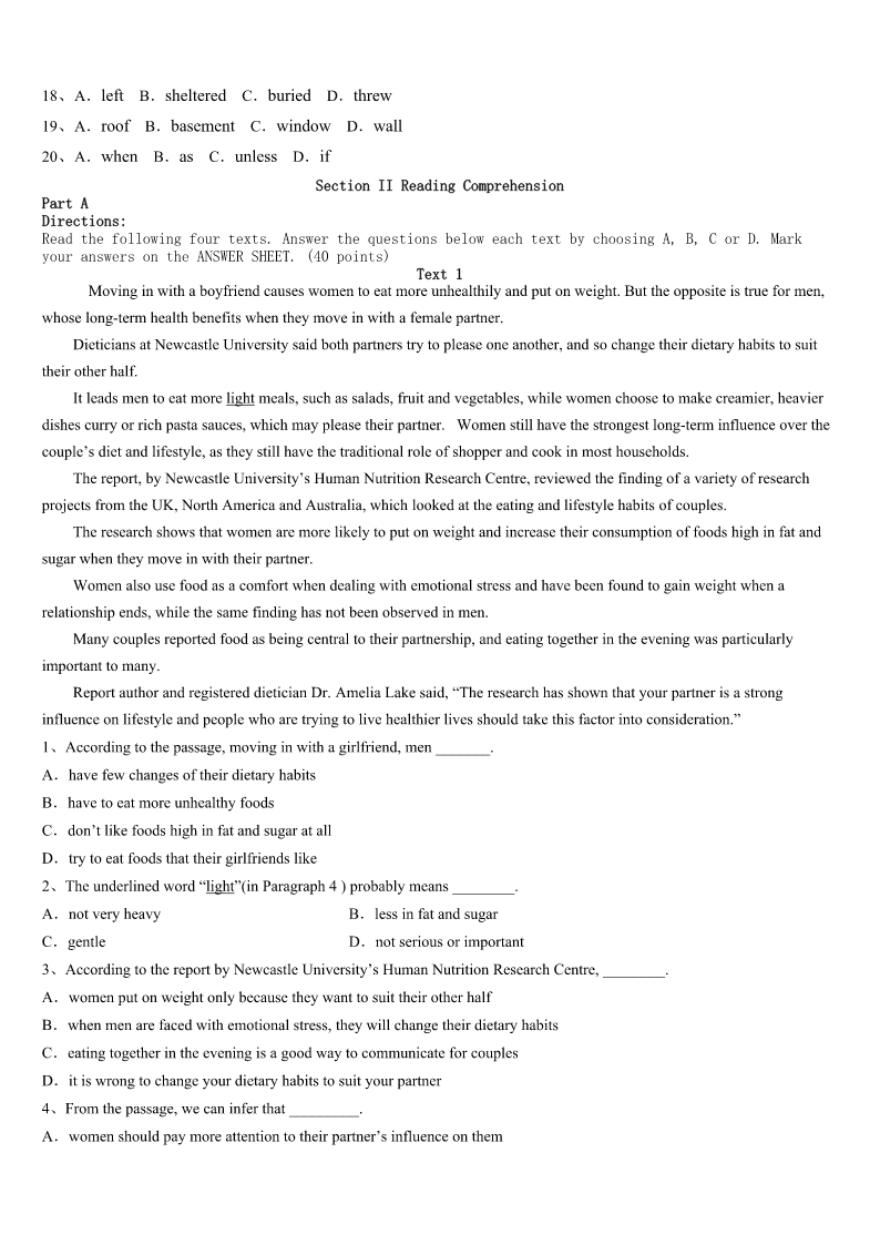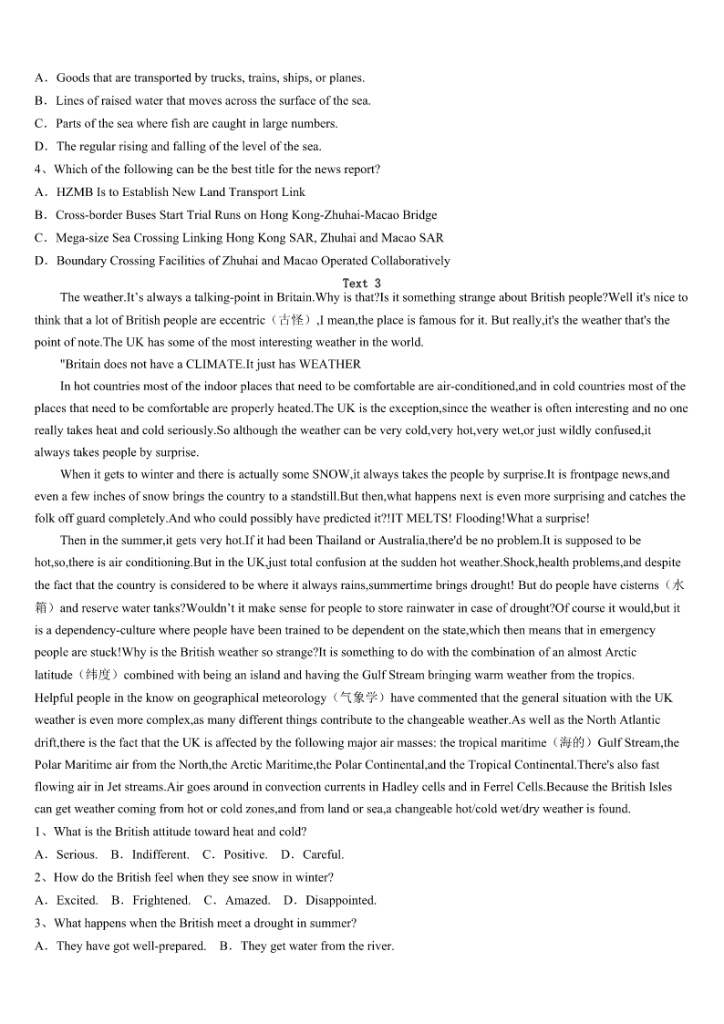 考研《英语一》山东省日照市东港区2023年预测试题 SectionIUseofEnglish Directions: Readthefollowingtext.Choosethebestword(s)foreachnumberedblankandmarkA,B,CorDonthe ANSWERSHEET.(10points) Heaviestsnowinhalfacenturyhitthesouthofthecountry.Itsnowedcontinuouslyforhalfamonth,1the railways,highways,andrunwaysintheairfields.Icewrappedandparalyzed(使瘫痪)thepowerand communicationsystem.Manypeoplewere2inrailwaystations,busstationsandairports,and3incars,buses andtrains.Governmentsandpeopledideverythingtheycouldtofightthesnow4,resultinginthegoodnewsthat noonewaskilledfrom5andhunger.Gradually,trappedpeopleallwentbackhome6.Whilefightingthesnow, peopleforgottheir7untilamovingstoryofaswallowcouplewaswidely8ontheInternet. Beinghungryandcold,theswallowcoupletriedtofly9people'shometowarmthemselves,buteveryhouse wasclosed10.Theyjumpedandflappedtheirwingsto11theattentionofthepeopleinsidethehouse,but failed.Thewife’sbodywas12,shecouldnotmoveanylonger.Thehusbandcamenearandwrappedhiswife withhiswings.Helosthis13soonbecauseofhisopenedwings.Thecouplediedintheend. Thenextmorning,thehousemasterwenttothebalconyto14hisflowersbecauseofconcernandsawa15 swallowoutsidethewindowpane.Touchingit,hefoundthattheyweretwo16together.Movedtotears,hetook themin,givingthemsome17,butinvain.Hefoundasmallcardboardbox,laidtheminand18theminthe backgarden. Inmyhometown,inthecountryside,aswallowfamilylivesinthe19ofmyhouse.Iwonderiftheywillcome backthisspring20theydid. 1、A.protectingB.maintainingC.blockingD.keeping 2、A.restrictedB.stuckC.surroundedD.persuaded 3、A.evenB.stillC.yetD.nevertheless 4、A.disturbanceB.occurrenceC.incidentD.disaster 5、A.coldB.diseaseC.povertyD.thirsty 6、A.merrilyB.safelyC.excitedlyD.exhaustedly 7、A.familyB.distantrelativesC.parentsD.animalfriends 8、A.broadcastB.writtenC.spreadD.identified 9、A.intoB.throughC.beyondD.across 10、A.tightlyB.earlyC.secretlyD.quickly 11、A.payB.attractC.resistD.keep 12、A.injuredB.liftedC.frozenD.broken 13、A.heatB.strengthC.directionD.eyesight 14、A.waterB.plantC.digD.check 15、A.deadB.drunkC.li
