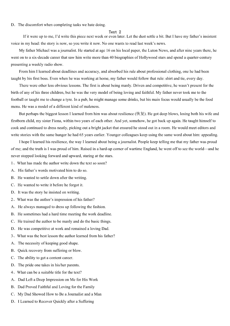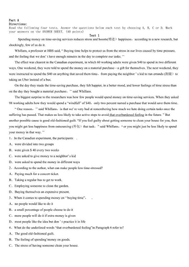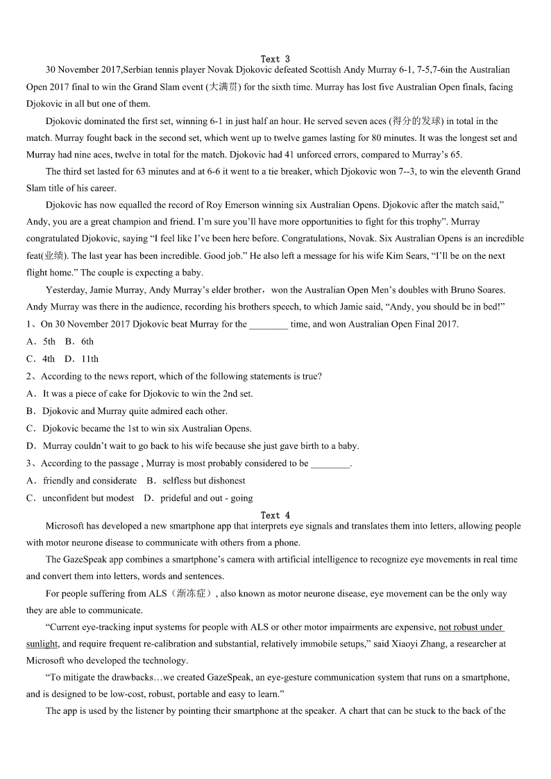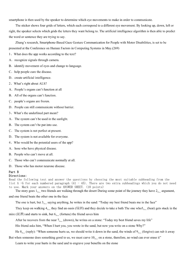 考研《英语一》山西省太原市晋源区2023年巅峰冲刺试卷 SectionIUseofEnglish Directions: Readthefollowingtext.Choosethebestword(s)foreachnumberedblankandmarkA,B,CorDonthe ANSWERSHEET.(10points) Signscansometimesbeseenattheentranceofahouse,expressingthatatramp(流浪汉)haspassed.Thisspecialsign- languageisfrequently1bytrampstoinformtheir2whetherthehostofacertainhouseisfriendlyorunfriendly,andto3 themthetroubleofmakingunnecessarycalls. Quite4oneday,Icameacrossarealtramp.HewassuchararesightthesedaysthatIstoodsomedistanceawayandwatched him.Hewasdressedjustasatrampshouldbe5,oldworntrousers,andajacketmanysizestoobigforhim.Onhishead therewasabatteredoldhatandhisbootsweresooldandworn;theywerealmostcominginto6Butthemanhimselflooked cheerfulasifhehadnotbeena7intheworld.Herubbedhisnosewithhisforefinger,8afunnyturn,laidasmallparcel bythefrontgate,andbegan9asignmadebyaformercaller.Althoughthesignwasmeaninglesstome,itmusthavebeen 10,forthetramp’sfacelitupwith11Heenteredthefrontgateconfidentlyandrangthebell.Whenthedooropened,Isaw him12hishatbutcouldn’thearhiswords.The13wasveryshortindeed,fornosoonerhadhespokenafewwordsthan thedoorclosedfiercelyinhisface.Ifelt14forhimashewalked15outofthehouse.Butjustasquickly,hisfacelitup againandhemovedquicklytowardsthegate.Therehestopped,lookedatthesign,and16hisheadseriouslyasifhehad madeabadmistake.17deeplyintohispockets,heproducedapieceofchalk,rubbedoutthe18signandmadeanewone initsplace.Hestaredatitforamomentsmilingtohimself,thengatheredhis19,pushedbackhishatandbeganwalking towardsthenexthouseatanunhurried20,whistlingashewentalong. 1、A.employedB.madeC.takenD.putup 2、A.parentsB.classmatesC.fellowsD.friends 3、A.shareB.saveC.giveD.put 4、A.inawayB.bymistakeC.bythewayD.bychance 5、A.withB.inC.byD.on 6、A.afashionB.adesignC.piecesD.blocks 7、A.successB.careC.failureD.family 8、A.gaveB.gotC.setD.made 9、A.drawingB.kissingC.correctingD.studying 10、A.pleasedB.strangeC.funnyD.exciting 11、A.surpriseB.satisfactionC.worryD.disappointment 12、A.riseB.putonC.raiseD.throw 13、A.conversationB.introdu