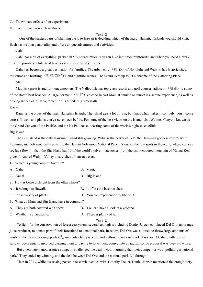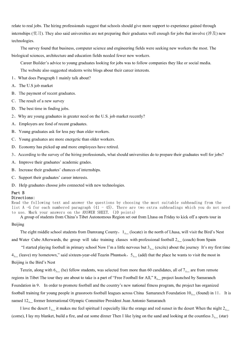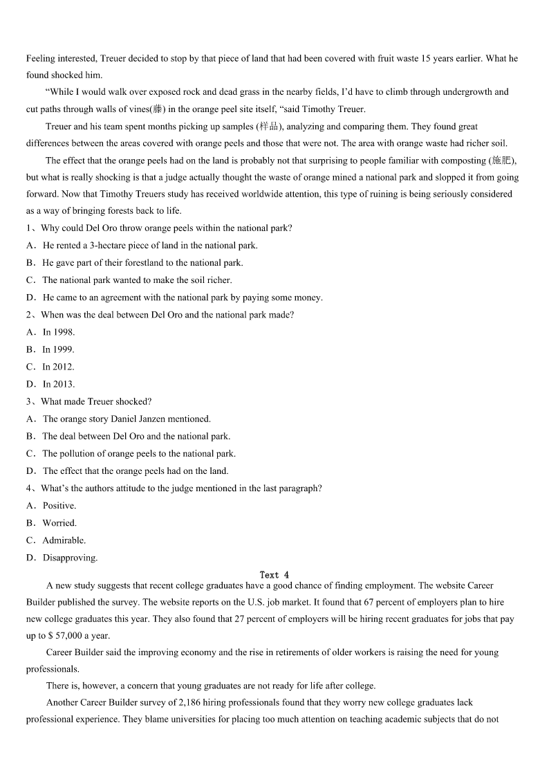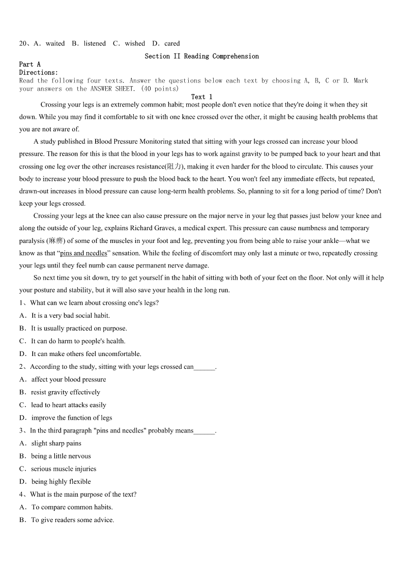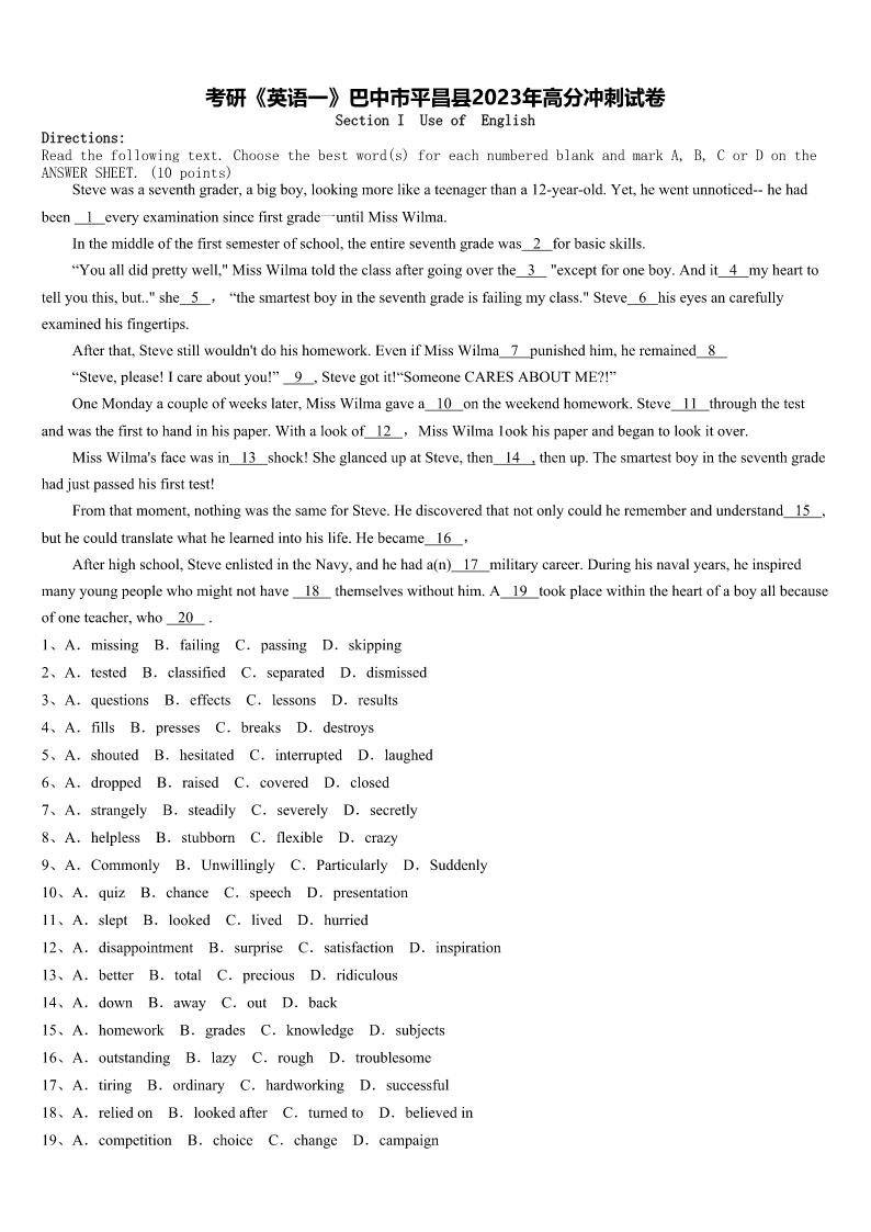考研《英语一》巴中市平昌县2023年高分冲刺试卷 SectionIUseofEnglish Directions: Readthefollowingtext.Choosethebestword(s)foreachnumberedblankandmarkA,B,CorDonthe ANSWERSHEET.(10points) Stevewasaseventhgrader,abigboy,lookingmorelikeateenagerthana12-year-old.Yet,hewentunnoticed--hehad been1everyexaminationsincefirstgrade一untilMissWilma. Inthemiddleofthefirstsemesterofschool,theentireseventhgradewas2forbasicskills. “Youalldidprettywell,"MissWilmatoldtheclassaftergoingoverthe3"exceptforoneboy.Andit4myheartto tellyouthis,but.."she5,“thesmartestboyintheseventhgradeisfailingmyclass."Steve6hiseyesancarefully examinedhisfingertips. Afterthat,Stevestillwouldn'tdohishomework.EvenifMissWilma7punishedhim,heremained8 “Steve,please!Icareaboutyou!”9,Stevegotit!“SomeoneCARESABOUTME?!” OneMondayacoupleofweekslater,MissWilmagavea10ontheweekendhomework.Steve11throughthetest andwasthefirsttohandinhispaper.Withalookof12,MissWilma1ookhispaperandbegantolookitover. MissWilma'sfacewasin13shock!SheglancedupatSteve,then14,thenup.Thesmartestboyintheseventhgrade hadjustpassedhisfirsttest! Fromthatmoment,nothingwasthesameforSteve.Hediscoveredthatnotonlycouldherememberandunderstand15, buthecouldtranslatewhathelearnedintohislife.Hebecame16, Afterhighschool,SteveenlistedintheNavy,andhehada(n)17militarycareer.Duringhisnavalyears,heinspired manyyoungpeoplewhomightnothave18themselveswithouthim.A19tookplacewithintheheartofaboyallbecause ofoneteacher,who20. 1、A.missingB.failingC.passingD.skipping 2、A.testedB.classifiedC.separatedD.dismissed 3、A.questionsB.effectsC.lessonsD.results 4、A.fillsB.pressesC.breaksD.destroys 5、A.shoutedB.hesitatedC.interruptedD.laughed 6、A.droppedB.raisedC.coveredD.closed 7、A.strangelyB.steadilyC.severelyD.secretly 8、A.helplessB.stubbornC.flexibleD.crazy 9、A.CommonlyB.UnwillinglyC.ParticularlyD.Suddenly 10、A.quizB.chanceC.speechD.presentation 11、A.sleptB.lookedC.livedD.hurried 12、A.disappointmentB.surpriseC.satisfactionD.inspiration 13、A.betterB.totalC.preciousD.ridiculous 14、A.downB.awayC.outD.back