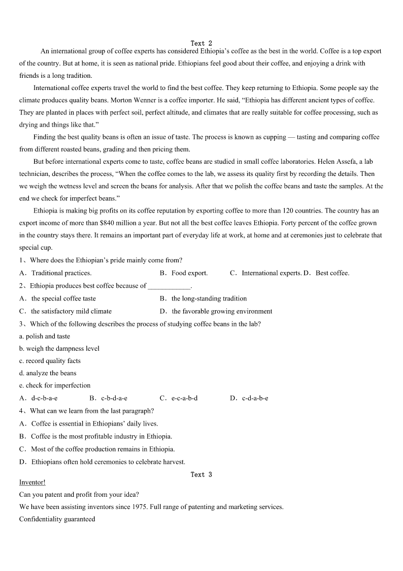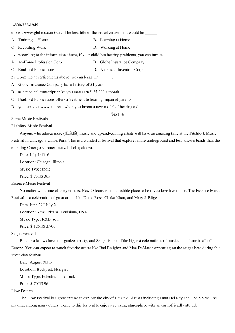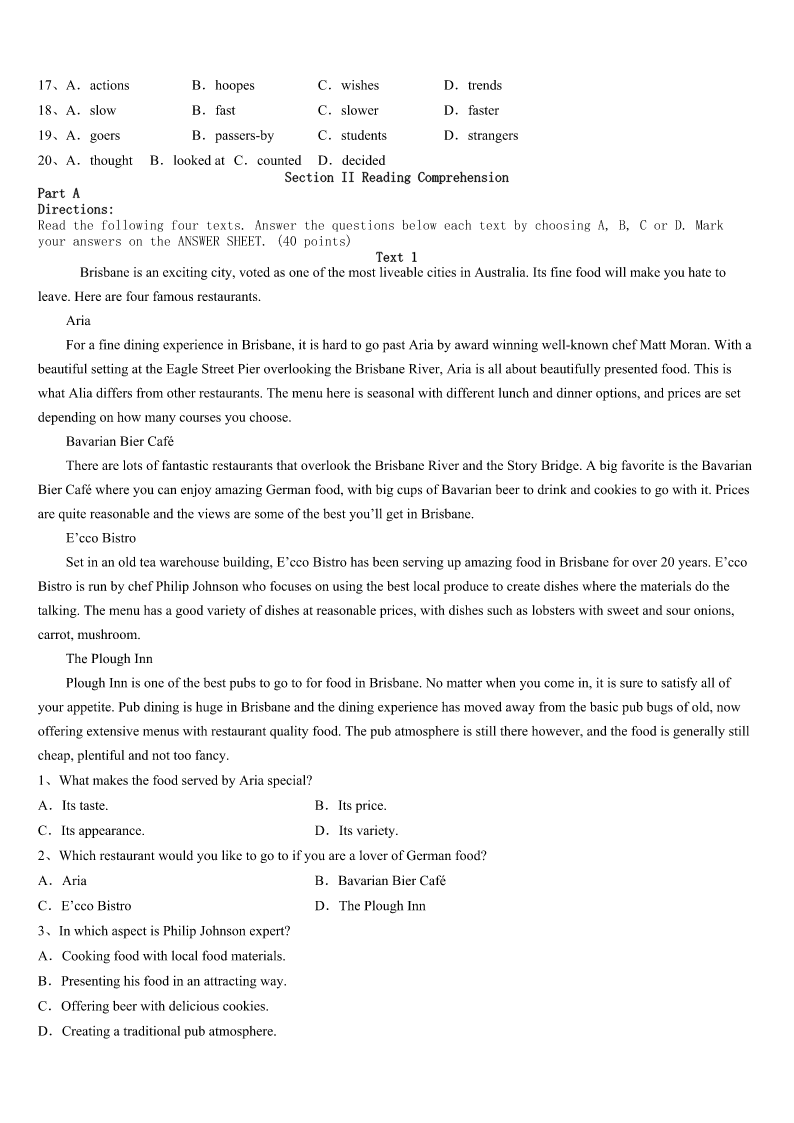 考研《英语一》广西壮族南宁市宾阳县2023年临考冲刺试卷 SectionIUseofEnglish Directions: Readthefollowingtext.Choosethebestword(s)foreachnumberedblankandmarkA,B,CorDonthe ANSWERSHEET.(10points) 完型填空(共20小题;每小题1.5分,满分30分) 阅读下面短文,掌握其大意,然后从36—55各题所给的四个选项(A、B、C和D)中,选出最佳选项,并在答题 卡上将该项涂黑。 LASTweekend,IhelpedmyfriendAlexgetmoneyforpoorchildrenatCrossroadsMallHe36neededvolunteers, especiallyofthefemale.Idecidedthatthiswasaprettygood37,sothenextdayIgotreadytogo. IarrivedatCrossroadsaboutfiveminutes38,andhelpedAlexand39ofthevolunteers.Therewereonlythree40at first,andwefiguredwemightaswellgetstarted41justwaitingformoretoarrive.Iheldthe42,andsuddenlyfelt extremelyshy.Ididnot43askingpeoplefordonations.Infact,I’musuallyoneofthosepeoplewhotryto44thoseboring standsandaskyouforalittlecontribution.Forheaven’ssake,Icancontributetoafew,45Icannotalone46everysingle causeintheworld! Ireallydidn’tliketheideaofaskinganyonefordonationstoourcause.47,Iwatchedmyfriendsspeaktothestrangers, andnoticedthattheywereextrapolitetoeveryone—nomatterwhetherthey48.Irealizedthat49Iwasn’tpushy(强求的) ,itwouldbeokay,andmyconsciencecouldbe50. Ipastedonalargesmile,andstartedaskingpeoplepassingby.Mymouthtrippedoverwords,andIcontinuallysaid“um” whileIthoughtofthecorrectterms.51Italkedtomoreandmorepeople.Notonlyimproved,butalsostartednoticingsmall 52.Insteadofsaying“donate”,whichmademostpeoplewalkaway53.Istartedsuingtheword“contribute”.Iaddedthe phrase“everylittlebitcounts”,andpeoplestartedtodonatesmallamountsinlargerquantities.Asthedaywenton,Ilearned howtopullontheheartsofthe54,andIbecameasuccessfulfundraiser. Attheendoftheday,weallgatheredatAlex’shouseand55howmuchmoneyweraised.Iwassosurprised;Weraised over$300!Wecelebrated,andwenthometired,butsatisfiedthatwehelpedagreatcause. 1、A.everyB.muchC.desperatelyD.too 2、A.causeB.businessC.affairD.career 3、A.earlierB.earlyC.laterD.late 4、A.theotherB.othersC.anotherD.therest 5、A.passers—byB.teachersC.volunteersD.people 6、A.insteadofB.butC.inspiteofD.inplaceof 7、A.signalB.signatureC.singD.symbol 8、A.app