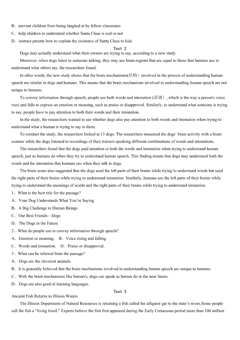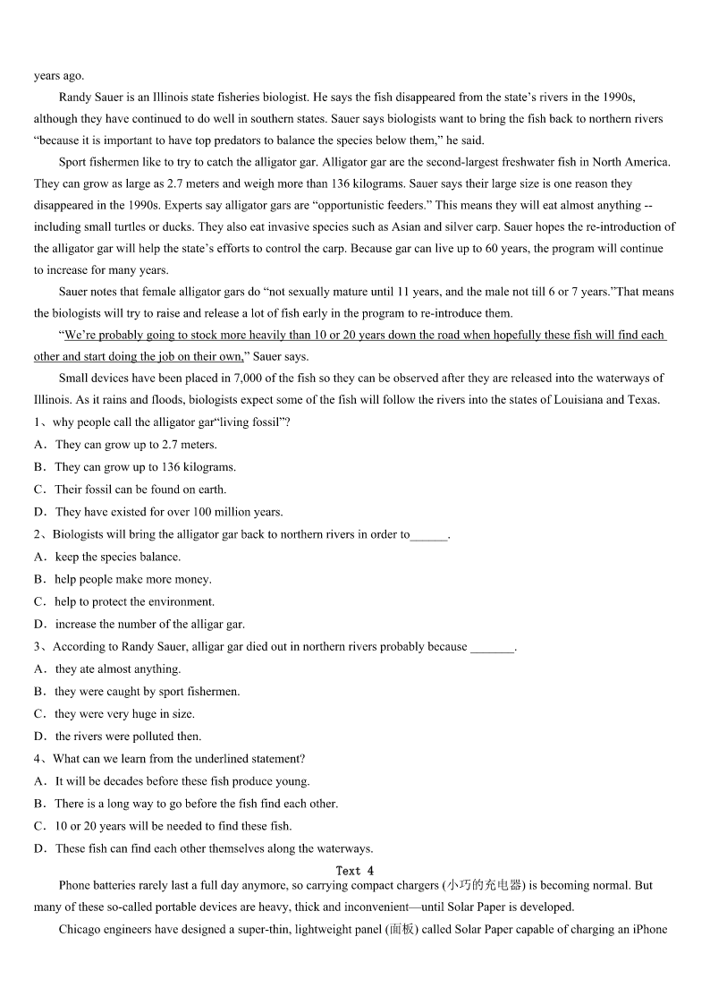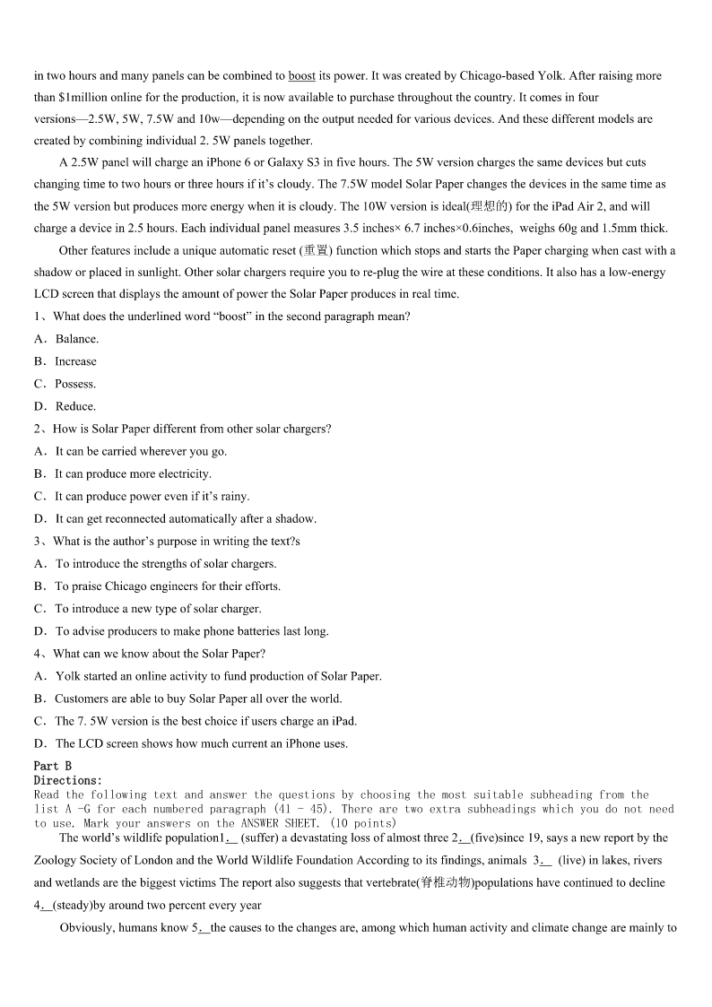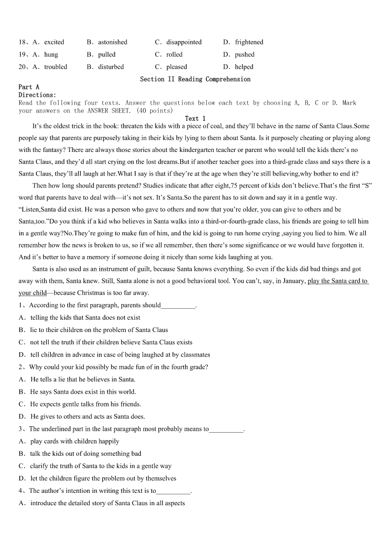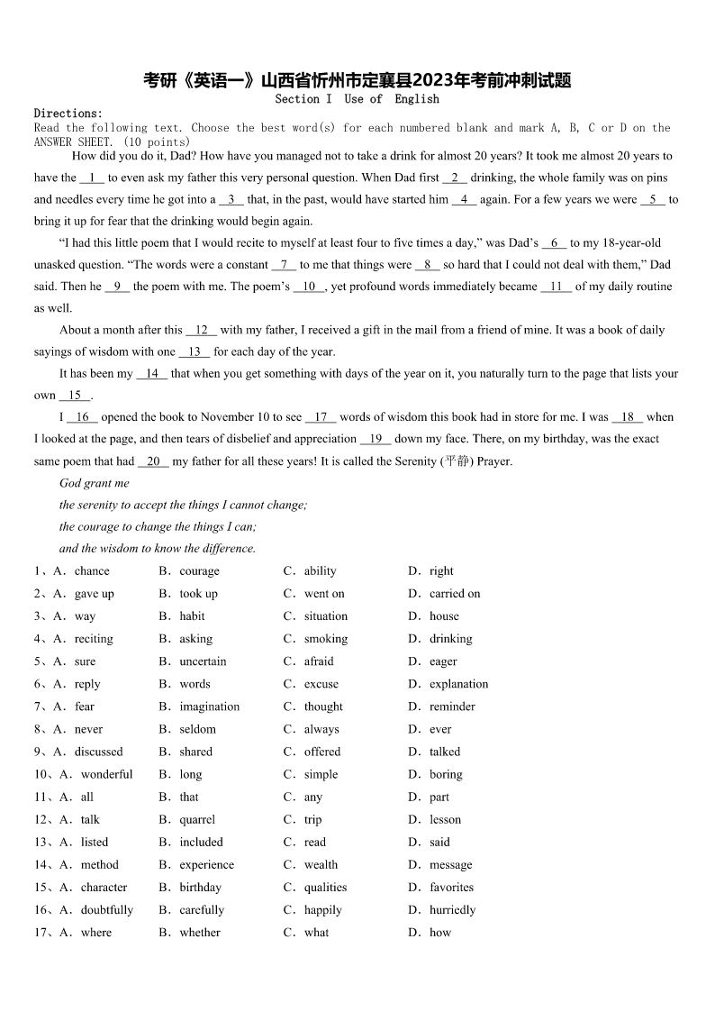 考研《英语一》山西省忻州市定襄县2023年考前冲刺试题 SectionIUseofEnglish Directions: Readthefollowingtext.Choosethebestword(s)foreachnumberedblankandmarkA,B,CorDonthe ANSWERSHEET.(10points) Howdidyoudoit,Dad?Howhaveyoumanagednottotakeadrinkforalmost20years?Ittookmealmost20yearsto havethe1toevenaskmyfatherthisverypersonalquestion.WhenDadfirst2drinking,thewholefamilywasonpins andneedleseverytimehegotintoa3that,inthepast,wouldhavestartedhim4again.Forafewyearswewere5to bringitupforfearthatthedrinkingwouldbeginagain. “IhadthislittlepoemthatIwouldrecitetomyselfatleastfourtofivetimesaday,”wasDad’s6tomy18-year-old unaskedquestion.“Thewordswereaconstant7tomethatthingswere8sohardthatIcouldnotdealwiththem,”Dad said.Thenhe9thepoemwithme.Thepoem’s10,yetprofoundwordsimmediatelybecame11ofmydailyroutine aswell. Aboutamonthafterthis12withmyfather,Ireceivedagiftinthemailfromafriendofmine.Itwasabookofdaily sayingsofwisdomwithone13foreachdayoftheyear. Ithasbeenmy14thatwhenyougetsomethingwithdaysoftheyearonit,younaturallyturntothepagethatlistsyour own15. I16openedthebooktoNovember10tosee17wordsofwisdomthisbookhadinstoreforme.Iwas18when Ilookedatthepage,andthentearsofdisbeliefandappreciation19downmyface.There,onmybirthday,wastheexact samepoemthathad20myfatherforalltheseyears!ItiscalledtheSerenity(平静)Prayer. Godgrantme theserenitytoacceptthethingsIcannotchange; thecouragetochangethethingsIcan; andthewisdomtoknowthedifference. 1、A.chanceB.courageC.abilityD.right 2、A.gaveupB.tookupC.wentonD.carriedon 3、A.wayB.habitC.situationD.house 4、A.recitingB.askingC.smokingD.drinking 5、A.sureB.uncertainC.afraidD.eager 6、A.replyB.wordsC.excuseD.explanation 7、A.fearB.imaginationC.thoughtD.reminder 8、A.neverB.seldomC.alwaysD.ever 9、A.discussedB.sharedC.offeredD.talked 10、A.wonderfulB.longC.simpleD.boring 11、A.allB.thatC.anyD.part 12、A.talkB.quarrelC.tripD.lesson 13、A.listedB.includedC.readD.said 14、A.methodB.experienceC.wealthD.message 15、A.characterB.birthdayC.qualitiesD.favorites 16、A.doubtfullyB.carefullyC.happilyD.hurriedly