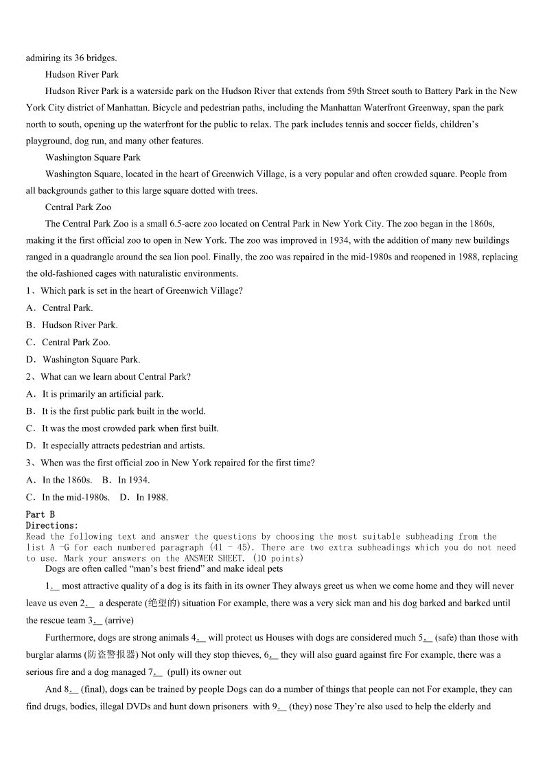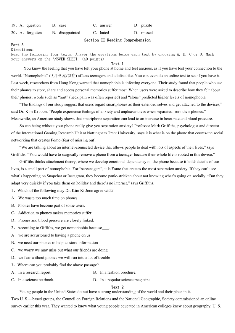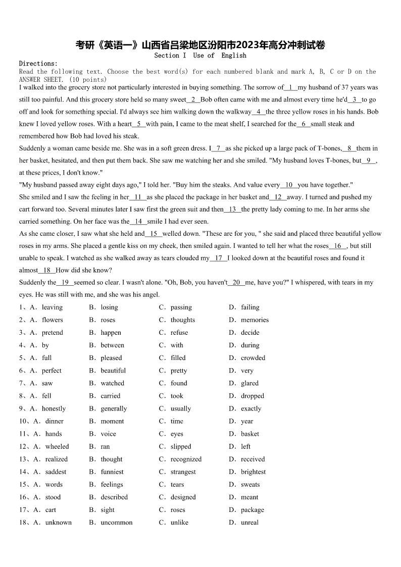 考研《英语一》山西省吕梁地区汾阳市2023年高分冲刺试卷 SectionIUseofEnglish Directions: Readthefollowingtext.Choosethebestword(s)foreachnumberedblankandmarkA,B,CorDonthe ANSWERSHEET.(10points) Iwalkedintothegrocerystorenotparticularlyinterestedinbuyingsomething.Thesorrowof1myhusbandof37yearswas stilltoopainful.Andthisgrocerystoreheldsomanysweet2Boboftencamewithmeandalmosteverytimehe'd3togo offandlookforsomethingspecial.I'dalwaysseehimwalkingdownthewalkway4thethreeyellowrosesinhishands.Bob knewIlovedyellowroses.Withaheart5withpain,Icametothemeatshelf,Isearchedforthe6smallsteakand rememberedhowBobhadlovedhissteak. Suddenlyawomancamebesideme.Shewasinasoftgreendress.I7asshepickedupalargepackofT-bones,8themin herbasket,hesitated,andthenputthemback.Shesawmewatchingherandshesmiled."MyhusbandlovesT-bones,but9, attheseprices,Idon'tknow." "Myhusbandpassedawayeightdaysago,"Itoldher."Buyhimthesteaks.Andvalueevery10youhavetogether." ShesmiledandIsawthefeelinginher11assheplacedthepackageinherbasketand12away.Iturnedandpushedmy cartforwardtoo.SeveralminuteslaterIsawfirstthegreensuitandthen13theprettyladycomingtome.Inherarmsshe carriedsomething.Onherfacewasthe14smileIhadeverseen. Asshecamecloser,Isawwhatsheheldand15welleddown."Theseareforyou,"shesaidandplacedthreebeautifulyellow rosesinmyarms.Sheplacedagentlekissonmycheek,thensmiledagain.Iwantedtotellherwhattheroses16,butstill unabletospeak.Iwatchedasshewalkedawayastearscloudedmy17Ilookeddownatthebeautifulrosesandfoundit almost18Howdidsheknow? Suddenlythe19seemedsoclear.Iwasn'talone."Oh,Bob,youhaven't20me,haveyou?"Iwhispered,withtearsinmy eyes.Hewasstillwithme,andshewashisangel. 1、A.leavingB.losingC.passingD.failing 2、A.flowersB.rosesC.thoughtsD.memories 3、A.pretendB.happenC.refuseD.decide 4、A.byB.betweenC.withD.during 5、A.fullB.pleasedC.filledD.crowded 6、A.perfectB.beautifulC.prettyD.very 7、A.sawB.watchedC.foundD.glared 8、A.fellB.carriedC.tookD.dropped 9、A.honestlyB.generallyC.usuallyD.exactly 10、A.dinnerB.momentC.timeD.year 11、A.handsB.voiceC.eyesD.basket