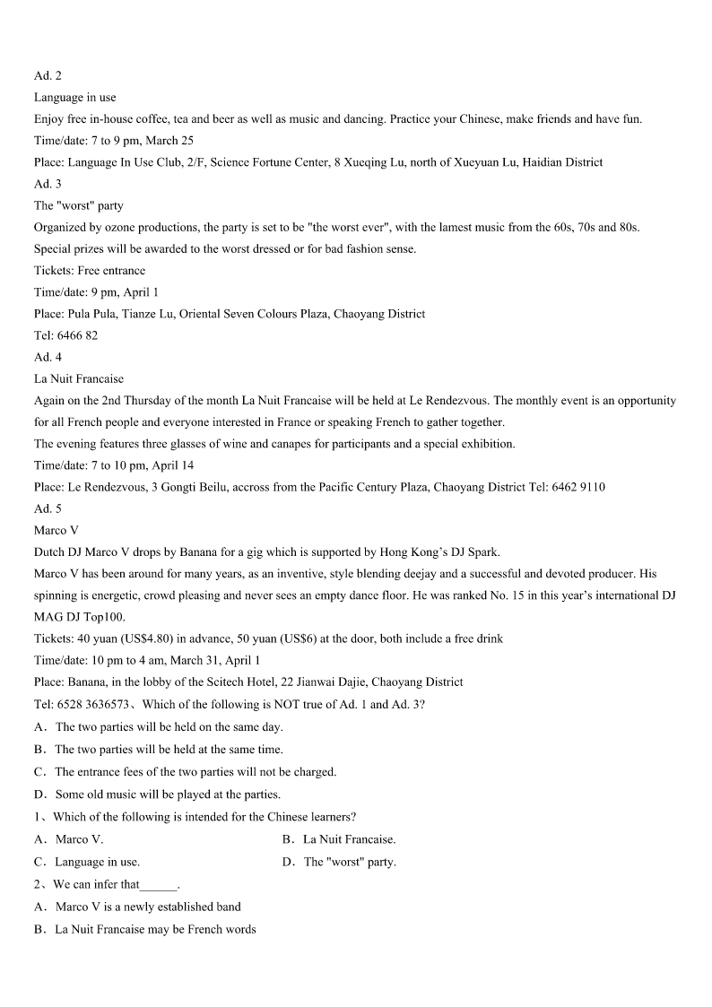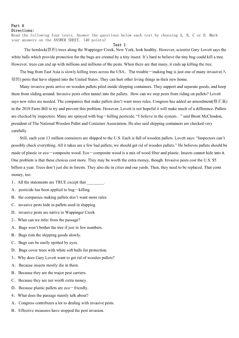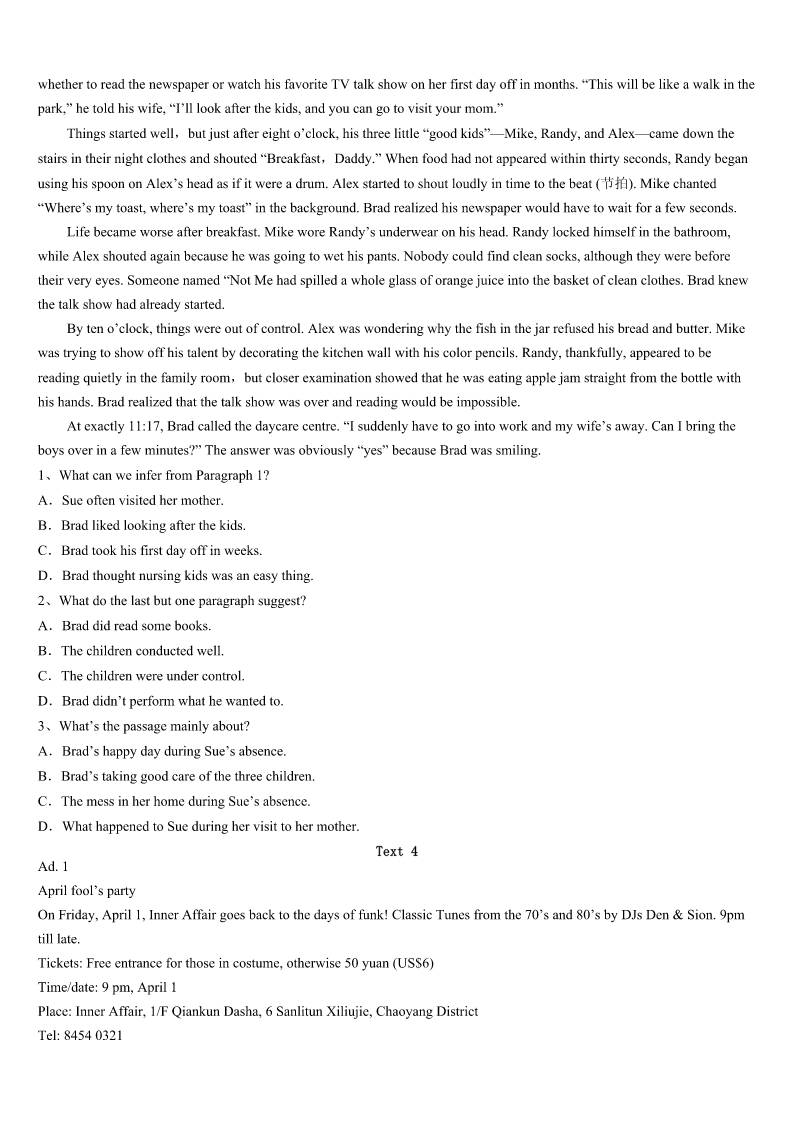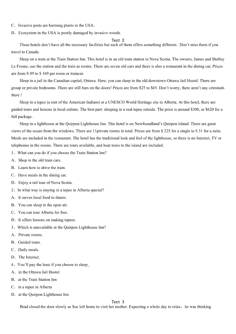 2023年崇义县考研《英语一》深度预测试卷 SectionIUseofEnglish Directions: Readthefollowingtext.Choosethebestword(s)foreachnumberedblankandmarkA,B,CorDonthe ANSWERSHEET.(10points) Anaccidentalinjurytaughtmehowtodealwithmysiblings(兄弟姐妹). Onatypicalautumn1,theeightpeopleofourafterschoolcarpool(拼车)2intoacarbuiltforseven.Mybrother teasedmetheentirewayhome.Hearingthe3inthebackofthecar,mymotherdroppedusofffirst. Aswe4thecar,Iranaftermylittlebrother,planningongettingbackathim.Becauseofmy5backpack, uncomfortableshoes,andterriblesenseofbalance.Ifellonthehardpavement.6,wholecarpoolrushedtomyaid.They liftedmyweightybackpack,7myfallenitems,andhelpedmestandup.Withtearsinmyeyes,Idraggedmyselfintothe 8. “YourealizeIwill9youforchasingyourbrotherafterthis,”mymomsaidtomeinhermost10voice.She obviouslydidn’tknowhowmuchIwas11,orshewouldhavebeenmore12.IcomplainedtoherthepainIwasfeeling inmyright13.ThebonedoctorconcludedthatIhada14breakinmyrightelbow. Igot15atschoolthenextdaybecausefriendssurroundedmecarefully.Butbreakingmyarmhadmore16that benefits.Iwas17towritewithmylefthand.Ihadtowrapmyarmingarbagebagbefore18,andIhadtogotohealth insteadofPE. 19itwasanawfulweek,IthinkIdeservedit20plottingrevenge(报复)againstmybrother.Sincethen,there hasn’tbeenanythingdisharmoniousamongoursiblings. 1、A.morningB.afternoonC.eveningD.night 2、A.dashedB.steppedC.piledD.looked 3、A.fightB.jokeC.cryD.noise 4、A.stoppedB.fixedC.exitedD.returned 5、A.hugeB.fullC.newD.heavy 6、A.SwiftlyB.SuddenlyC.FortunatelyD.Eventually 7、A.countedB.collectedC.cleanedD.stored 8、A.schoolB.carC.clinicD.house 9、A.punishB.lookintoC.comfortD.worryabout 10、A.peacefulB.carefulC.severeD.familiar 11、A.astonishedB.movedC.inspiredD.hurt 12、A.sensitiveB.concernedC.anxiousD.disappointed 13、A.legB.armC.footD.hand 14、A.seriousB.slightC.commonD.special 15、A.rewardB.respectC.attentionD.privilege 16、A.troubleB.painC.loseD.business 17、A.expectedB.advisedC.instructedD.forced 18、A.swimmingB.showeringC.treatingD.sleeping 19、A.SinceB.IfC.AlthoughD.When 20、A.forB.onC.withD.as Sec