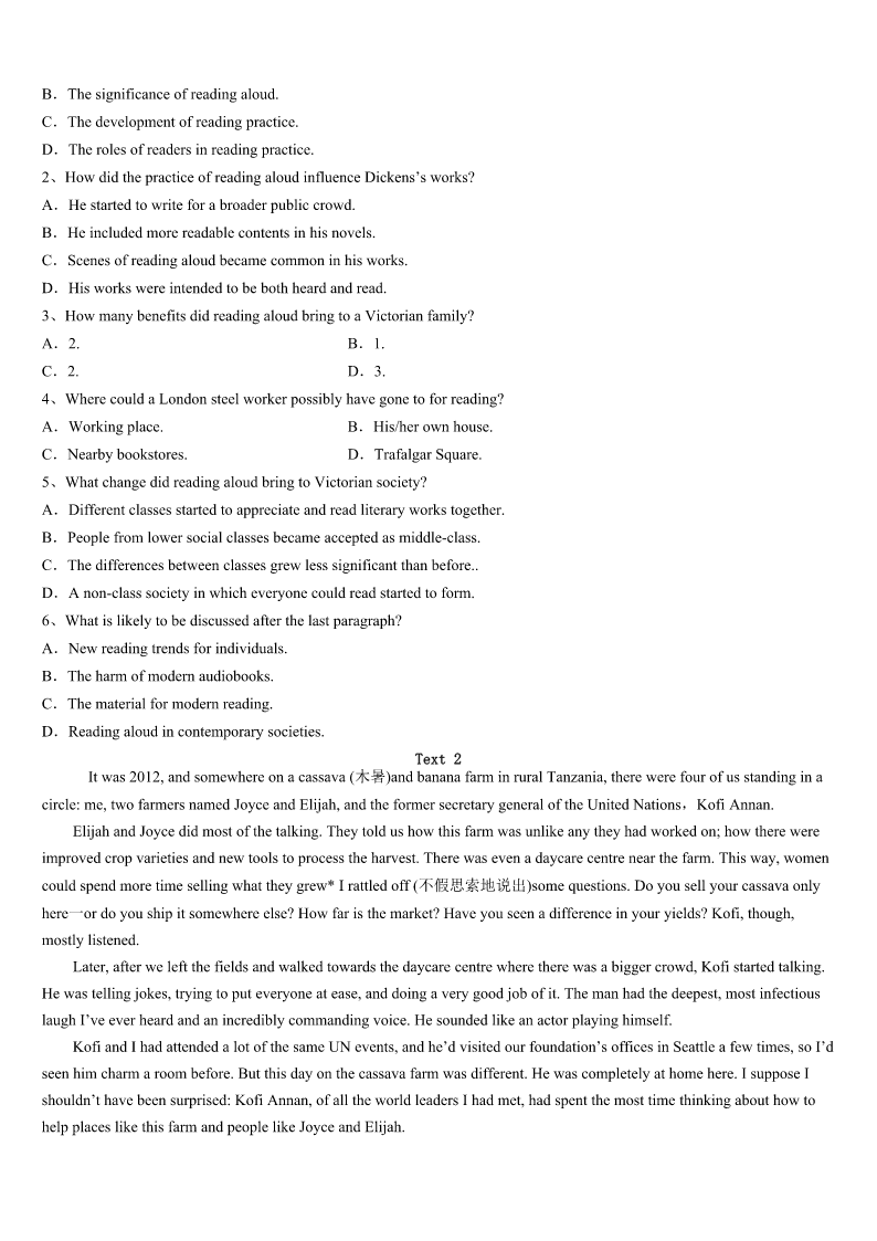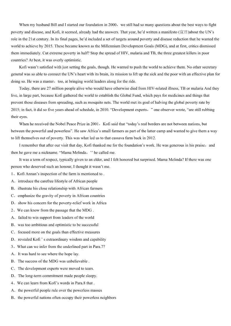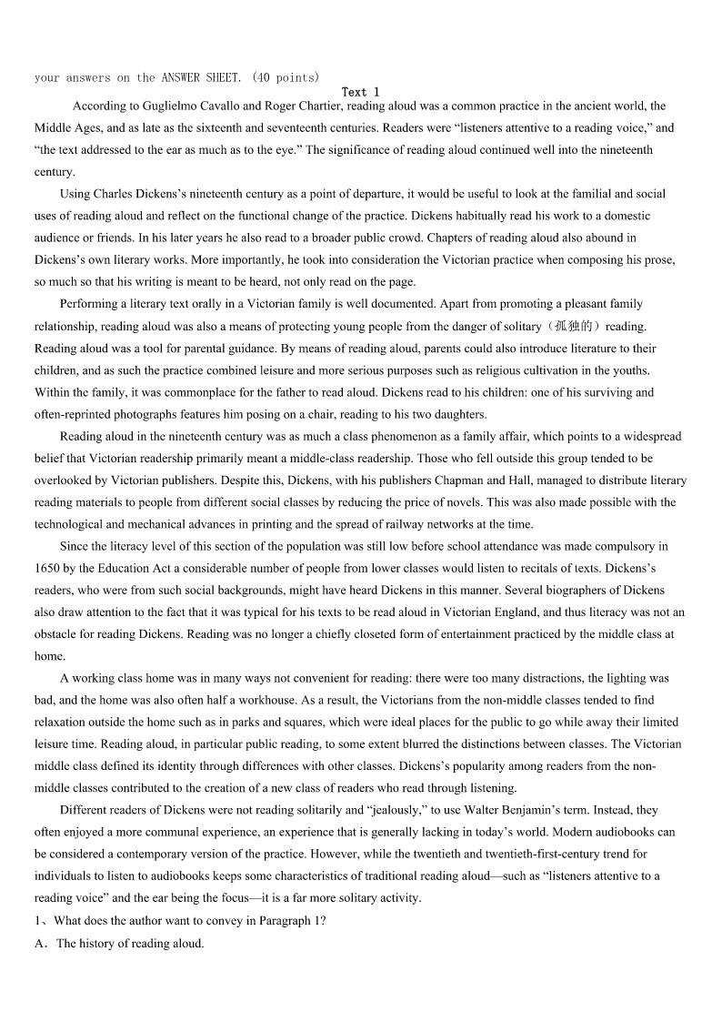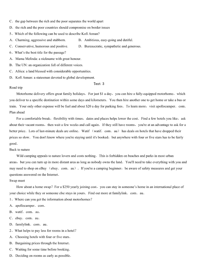 考研《英语一》工布江达县2023年统考试题 SectionIUseofEnglish Directions: Readthefollowingtext.Choosethebestword(s)foreachnumberedblankandmarkA,B,CorDonthe ANSWERSHEET.(10points) ItookanairplanetoBeijinginFebruary,onanAirCanadaBoeing777.1allwereseated,Iusedmycomputerfora while.Aheadofmetomyright,akidwas2. IwentuptoaChinesewoman.Shehadinherarmsakidthat3crying.Itoldthemotherthatthekidneededtobe walkedandthenshewould4andsleep.Iknewthisbecauseiamafatheroffour5children.Thewoman,whowasfrom NorthYork,saidshewastootiredasshehadbeen6thewholenightbefore.I7towalkthekidsoshecouldgetsome sleep. AsItookthekidinmyarms,I8herforthekid’snameandage.Ithenstarted9walkinguptothefrontofthe economysection.Thekidimmediatelyfelltosleep.WhenIgotbacktothemother’s10,Ifoundherfastasleep.Ikept walkingforoversixhoursandwalkedslowly11.Sinceitwasa13hourflight,IwalkedhalfwaytoChina12akid. Womenonboardwould13meduringmylongwalk,wantingtoseethekid.Onewomanaskmesomequestionslike “Howmany14doyouhave?”“Four,”Isaid.Shelooked15atmywrinkled(有皱纹的)faceandwhitehair(Iwas almost60)andsaid,“Well,Ihopethisisyour16one.”ShethoughtIwasMary’s17.Ijust18andwalkedon. WhenIwasbacktothemother,themother19.IgaveMarybacktoher,who20soundasleep. 1、A.BeforeB.AfterC.ThoughD.Unless 2、A.singingB.talkingC.sleepingD.crying 3、A.keptB.startedC.practisedD.stopped 4、A.breakdownB.goaheadC.settledownD.setoff 5、A.grownB.energeticC.curiousD.slim 6、A.downB.backC.awayD.up 7、A.deservedB.offeredC.pretendedD.agreed 8、A.requestedB.commandedC.askedD.consulted 9、A.slowlyB.quicklyC.calmlyD.strongly 10、A.homeB.seatC.calmlyD.strongly 11、A.upsidedownB.insideoutC.dayandnightD.upanddown 12、A.watchingB.carryingC.trickingD.seeking 13、A.spotB.remindC.stopD.award 14、A.customersB.passengersC.membersD.children 15、A.obviouslyB.confidentlyC.closelyD.firmly 16、A.lastB.activeC.naughtyD.troubled 17、A.motherB.teacherC.fatherD.nurse 18、A.refusedB.smiledC.apologizedD.sighed 19、A.wokeB.leftC.wanderedD.shouted 20、A.turnedB.fellC.remainedD.looked SectionIIReadingComprehension PartA Directio