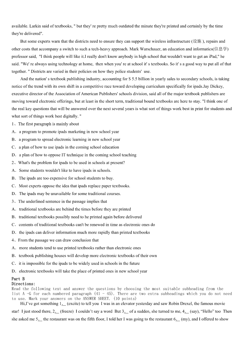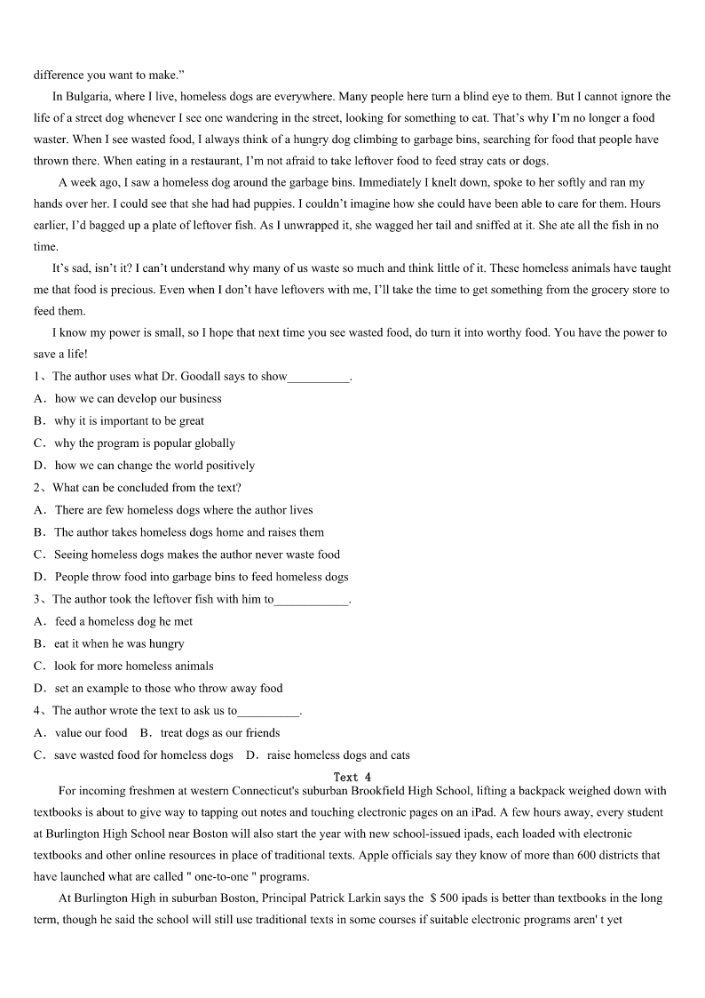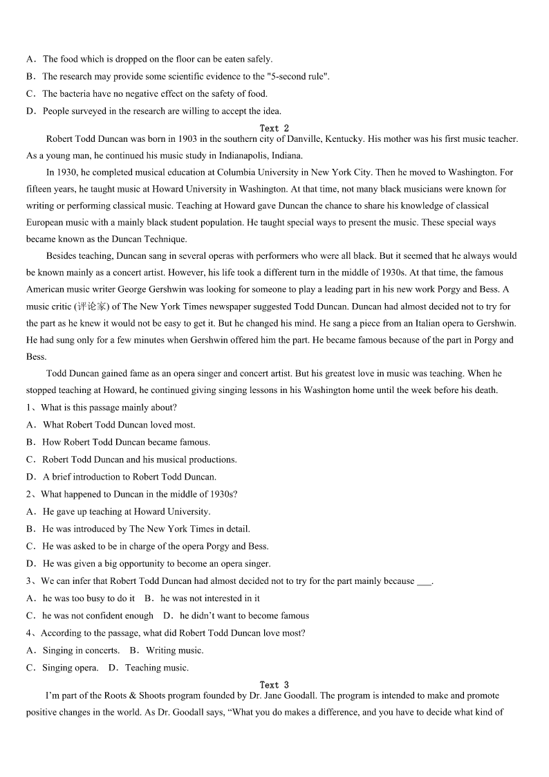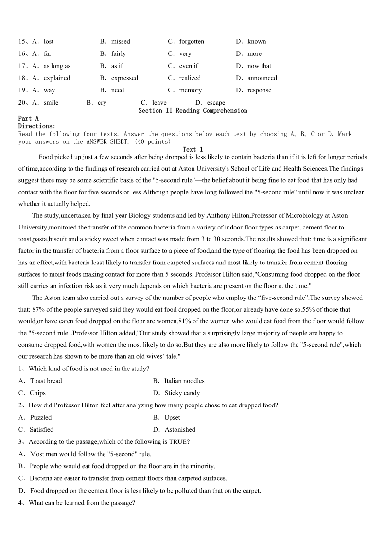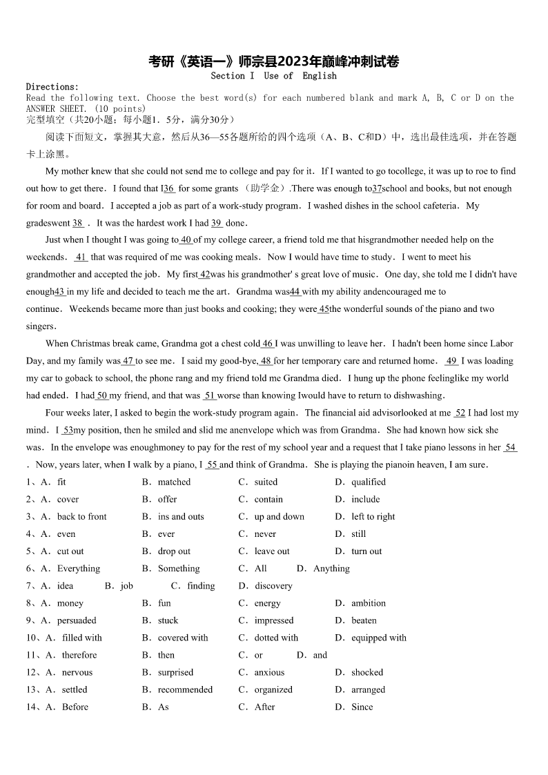 考研《英语一》师宗县2023年巅峰冲刺试卷 SectionIUseofEnglish Directions: Readthefollowingtext.Choosethebestword(s)foreachnumberedblankandmarkA,B,CorDonthe ANSWERSHEET.(10points) 完型填空(共20小题;每小题1.5分,满分30分) 阅读下面短文,掌握其大意,然后从36—55各题所给的四个选项(A、B、C和D)中,选出最佳选项,并在答题 卡上涂黑。 Mymotherknewthatshecouldnotsendmetocollegeandpayforit.IfIwantedtogotocollege,itwasuptoroetofind outhowtogetthere.IfoundthatI36forsomegrants(助学金).Therewasenoughto37schoolandbooks,butnotenough forroomandboard.Iacceptedajobaspartofawork-studyprogram.Iwasheddishesintheschoolcafeteria.My gradeswent38.ItwasthehardestworkIhad39done. JustwhenIthoughtIwasgoingto40ofmycollegecareer,afriendtoldmethathisgrandmotherneededhelponthe weekends.41thatwasrequiredofmewascookingmeals.NowIwouldhavetimetostudy.Iwenttomeethis grandmotherandacceptedthejob.Myfirst42washisgrandmother'sgreatloveofmusic.Oneday,shetoldmeIdidn'thave enough43inmylifeanddecidedtoteachmetheart.Grandmawas44withmyabilityandencouragedmeto continue.Weekendsbecamemorethanjustbooksandcooking;theywere45thewonderfulsoundsofthepianoandtwo singers. WhenChristmasbreakcame,Grandmagotachestcold46Iwasunwillingtoleaveher.Ihadn'tbeenhomesinceLabor Day,andmyfamilywas47toseeme.Isaidmygood-bye,48forhertemporarycareandreturnedhome.49Iwasloading mycartogobacktoschool,thephonerangandmyfriendtoldmeGrandmadied.Ihungupthephonefeelinglikemyworld hadended.Ihad50myfriend,andthatwas51worsethanknowingIwouldhavetoreturntodishwashing. Fourweekslater,Iaskedtobeginthework-studyprogramagain.Thefinancialaidadvisorlookedatme52Ihadlostmy mind.I53myposition,thenhesmiledandslidmeanenvelopewhichwasfromGrandma.Shehadknownhowsickshe was.IntheenvelopewasenoughmoneytopayfortherestofmyschoolyearandarequestthatItakepianolessonsinher54 .Now,yearslater,whenIwalkbyapiano,I55andthinkofGrandma.Sheisplayingthepianoinheaven,Iamsure. 1、A.fitB.matchedC.suitedD.qualified 2、A.coverB.offerC.containD.include 3、A.backtofrontB.insandoutsC.upanddownD.lefttoright 4、A.evenB.everC.neverD.still 5、A.cutoutB.dropoutC.leaveoutD.turnout 6、A.Ever