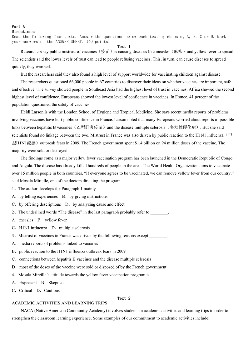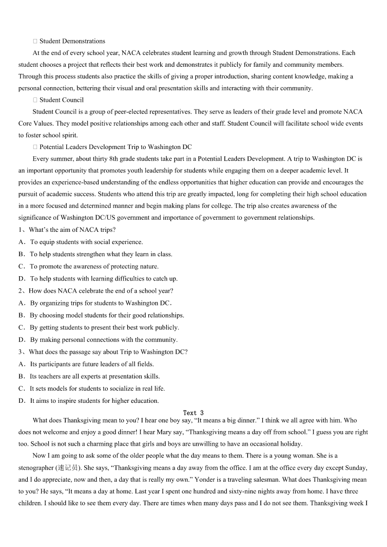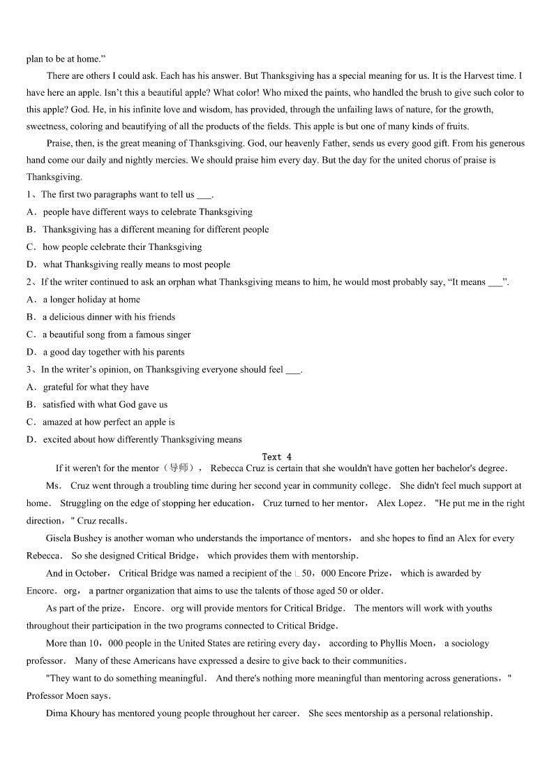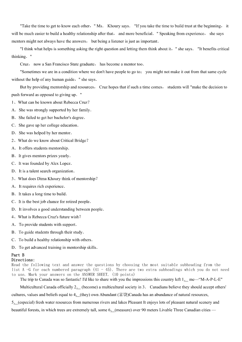 考研《英语一》广西壮族钦州市2023年巅峰冲刺试卷 SectionIUseofEnglish Directions: Readthefollowingtext.Choosethebestword(s)foreachnumberedblankandmarkA,B,CorDonthe ANSWERSHEET.(10points) Iteachatauniversityandrecentlyhadaninterestinginteractionwithastudentwhoapproachedmydeskwithan assignment.Iwatchedashe1itfromhispocketandheldthecrumpled(皱的)sheetouttome. “What’sthat?”Iasked.His2:“Mywork.” Iwasshocked.AllIcoulddowasstareatitlongenoughto3myvoice.ThenItoldhimtoredothe4andhandit backtomeasaclean,5andspotlesscopy.Asthestudent6,Ipickedupthemerestanger. IfIhavesome7asateacher,thenthisisit:quality.Inthelong8ofmyteachingcareer,Ihavegivenmystudents greatcreativefreedomand9manyextensionsofdeadlines.Butmy10ofqualityremainsanchoredinconcrete.Ihave alwaysfeltthatshouldI11onthisoneessentialissue,thenallislost. Sowhatbecameofmy12withthecrumpledpaper?Hegavemethepaperlikeasoldierpresentingsomethingtoa king13acat,whichiswhyI14him.Icalledhimback.Wesatdowntogether,andI15hisdraft,whichwas disorganized.Iexplained,16andclearly,thatone’sfirsteffortisexactlythat:astart.Andwetookitfromthere,movinga paragraph,deletingthe17wordorsentence,and18grammar. Oncethosebasicthingswere19,mystudentasked,“Arewedone?”“Notyet,”Ismiled.“Onelaststep.”Itoldhimto readhisworkoutloudandlistentohiswords.Afterhe20,heloweredthepaperandlookedatme,withhisexpression filledwithhope. 1、A.ruinedB.pulledC.blockedD.harvested 2、A.beliefB.solutionC.noticeD.response 3、A.repairB.recoverC.raiseD.recognize 4、A.arrangementB.preparationC.adaptationD.assignment 5、A.explicitB.flatC.longD.sharp 6、A.twistedB.registeredC.withdrewD.deposited 7、A.complaintB.celebrationC.appreciationD.attraction 8、A.lessonB.distanceC.courseD.silence 9、A.excusedB.prohibitedC.requiredD.allowed 10、A.expectationB.assumptionC.comprehensionD.judgement 11、A.burstoutB.cutdownC.giveinD.keepup 12、A.careerB.teacherC.draftD.student 13、A.ratherthanB.orratherC.otherthanD.aswellas 14、A.forgaveB.scoldedC.troubledD.influenced 15、A.tornB.introducedC.examinedD.selected 16、A.hopefullyB.speciallyC.st