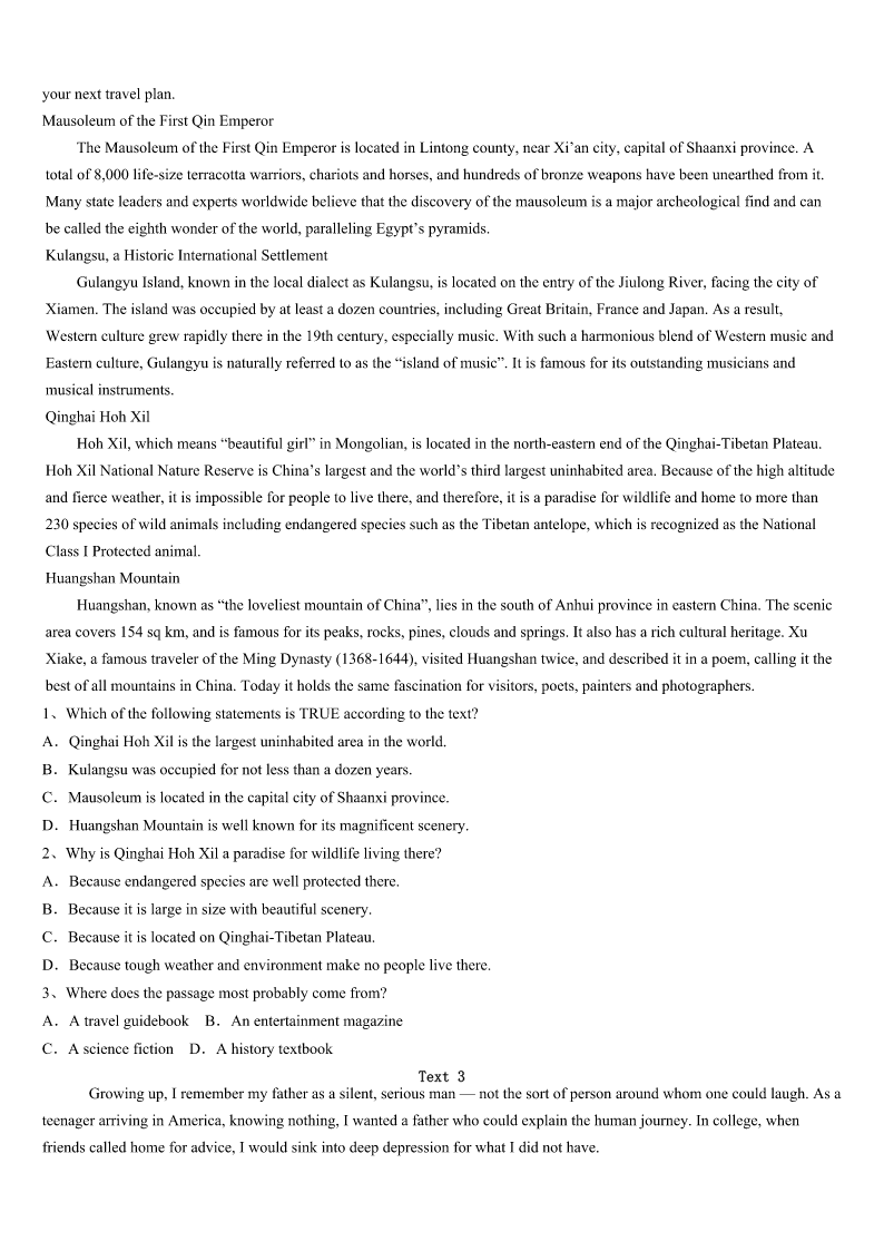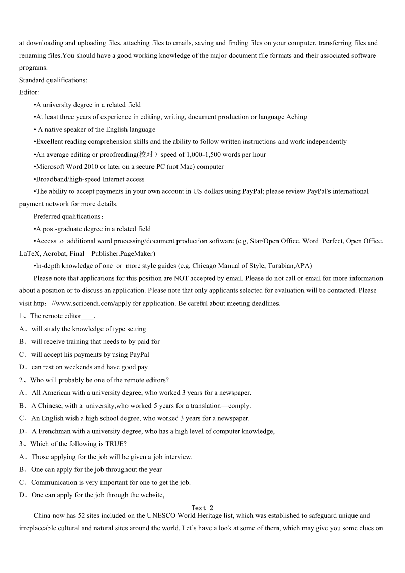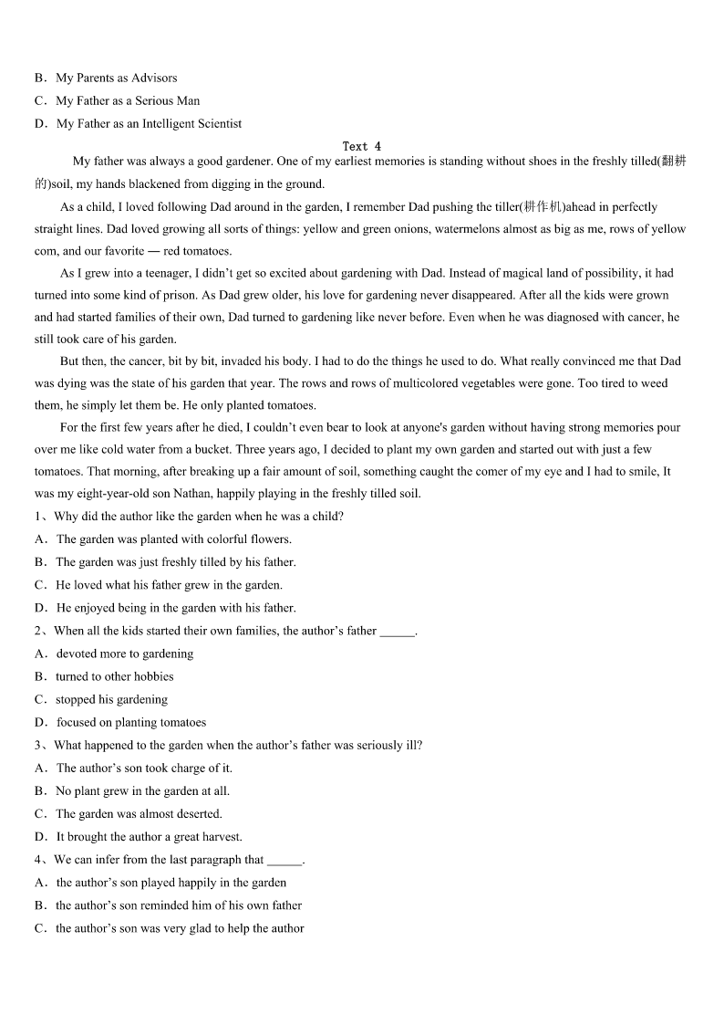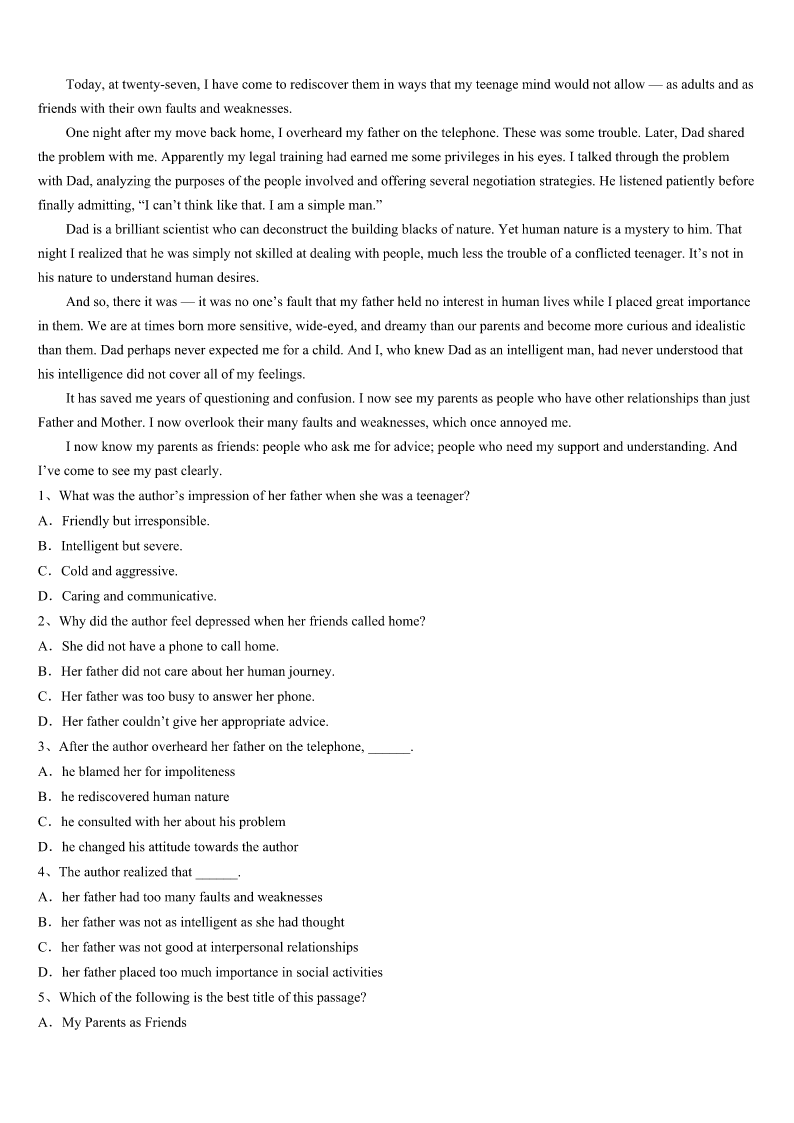 考研《英语一》广西壮族防城港市上思县2023年高分冲刺试卷 SectionIUseofEnglish Directions: Readthefollowingtext.Choosethebestword(s)foreachnumberedblankandmarkA,B,CorDonthe ANSWERSHEET.(10points) Directions:Foreachblankinthefollowingpassagetherearefourwordsorphrasesmarked A,B,CandD.Fillineachblankwithawordorphrasethatbestfitsthecontext. WhenIwasinhighschool,Ididn’tknowanythingaboutengineering.Atthattime,whenthecarIdroveneededrepairing,I wasafraidtotakeittothe1Becausehonestly,themechaniccouldhave2meanelectriccanopenerandsaid,“Thisispart ofyourcarandit’s3-----paymetofixit.”ThenIwouldn’thaveknownanybetter. Attheendofmyjunioryearofhighschool,Iheardaboutasummerprogram4tointerestgirlsinengineering.Thesix-week programwasfree,andstudentswere5collegecreditsandadormroomattheUniversityofMaryland.Iappliedtothe program,notbecauseIwantedtobeanengineer,butbecauseIwaslookingforwardto6andwantedtostayawayfrommy parentsforsixweeks. IwasacceptedtotheprogramandIearnedsixengineeringcredits.ThenextyearIenteredtheuniversityasanengineering student.FiveyearslaterIhadadegreeandthreegoodjoboffers. Ican’thelpshaking7Ihearaboutstudiesthatshowwomenare8whenitcomestomath.TheyimplythatIamalittle stupid.I’mnot,butI9knowthatifIhadn’tmetwiththatsummerprogram,Iwouldn’tbeanengineer. WhenIwasgrowingup,Iwastold,asmanystudentswere,todowhatIwasbestat.ButIdidn’tknowwhatthatwas.Most peoplethinkthatwhenyouare10something,itcomeseasilytoyou.ButthisiswhatIdiscovered:justbecauseasubjectis 11tolearn,itdoesnotmeanyouarenotgoodatit.Youjusthavetogrityourteethandworkhardtogetgoodatit.Onceyou do,there’sgood12thatyouwillenjoyitmorethananythingelse. 1、A.engineerB.salesmanC.factoryD.mechanic 2、A.shownB.givenC.broughtD.taken 3、A.oldB.brokenC.fixedD.dirtied 4、A.designedB.performedC.controlledD.described 5、A.sentB.affordedC.offeredD.awarded 6、A.independenceB.successC.happinessD.beauty 7、A.untilB.whenC.sinceD.before 8、A.atadisadvantageB.atalossC.inatrapD.inashock 9、A.neverB.doC.hardlyD.nearly 10、A.goodatB.badatC.interestedinD.devotedto 11、A.easyB.funnyC.d