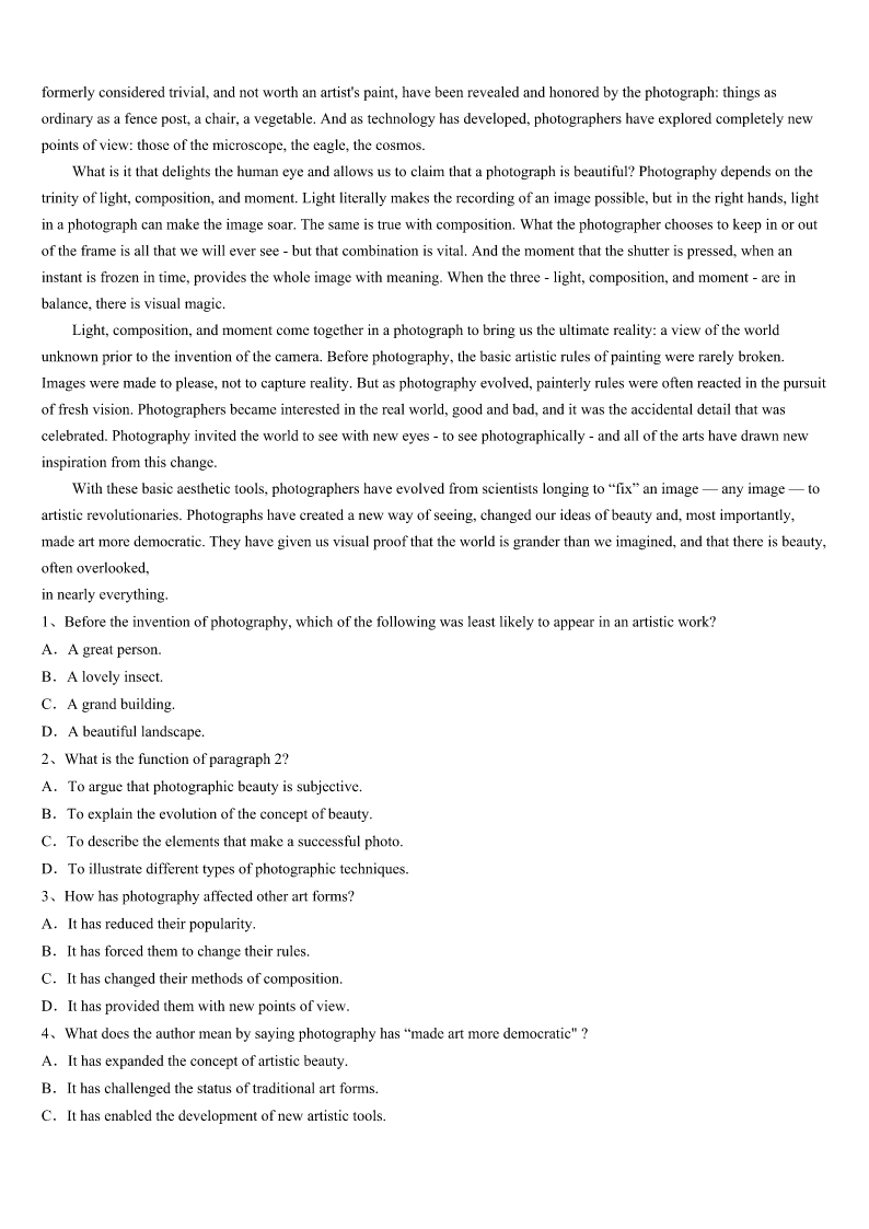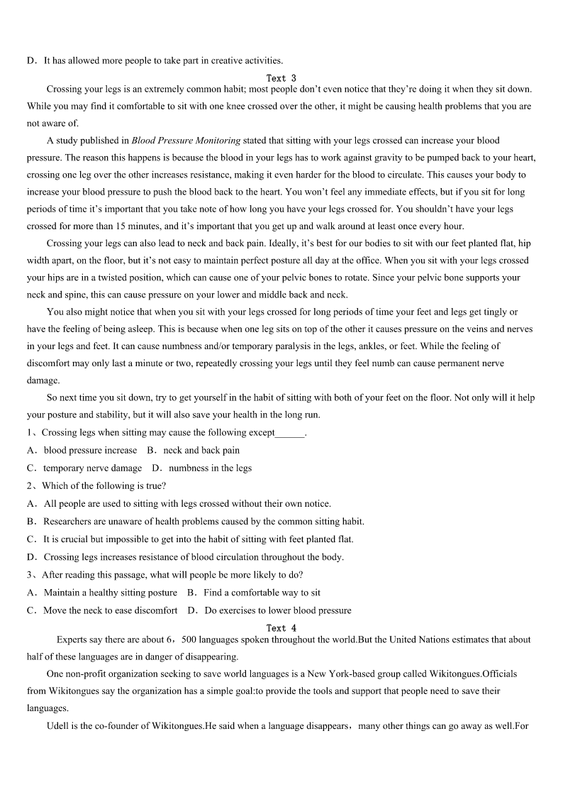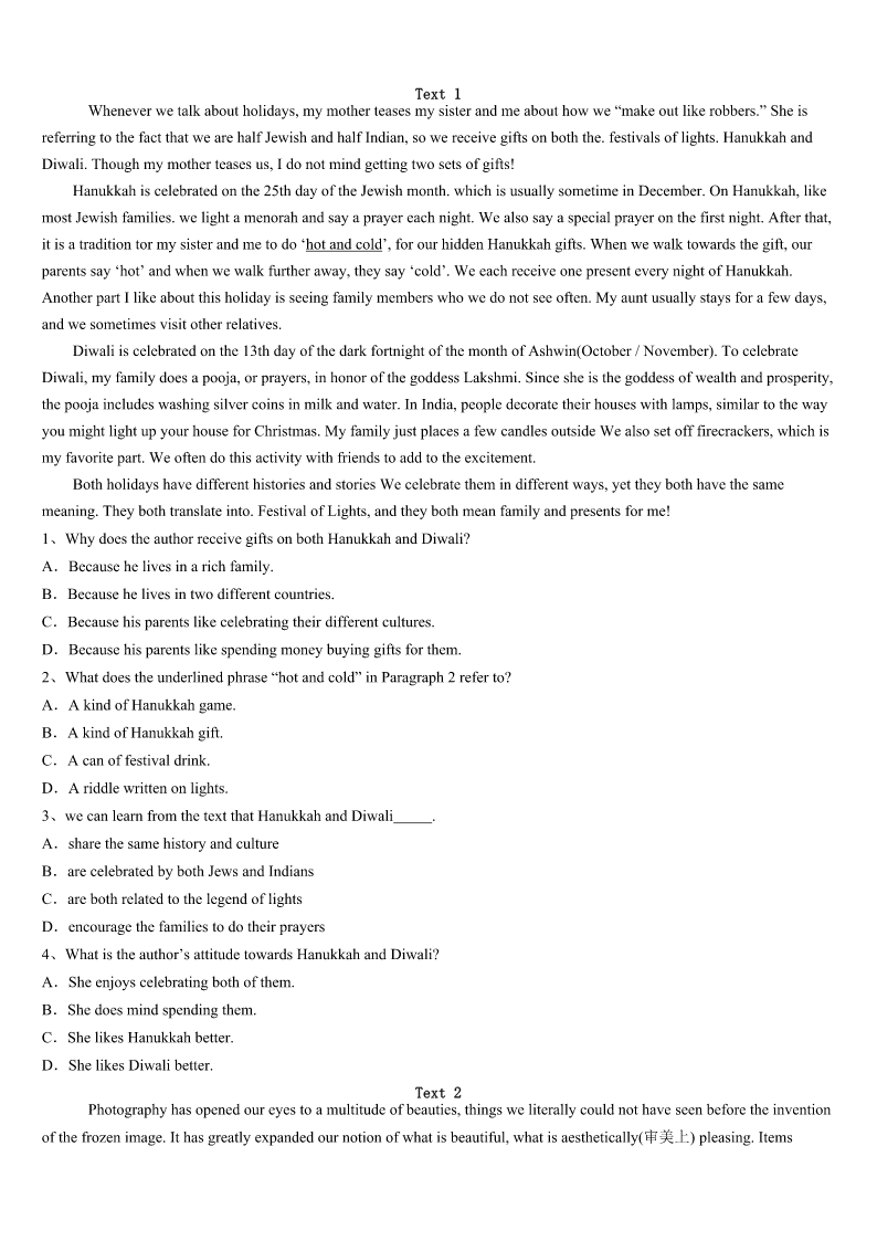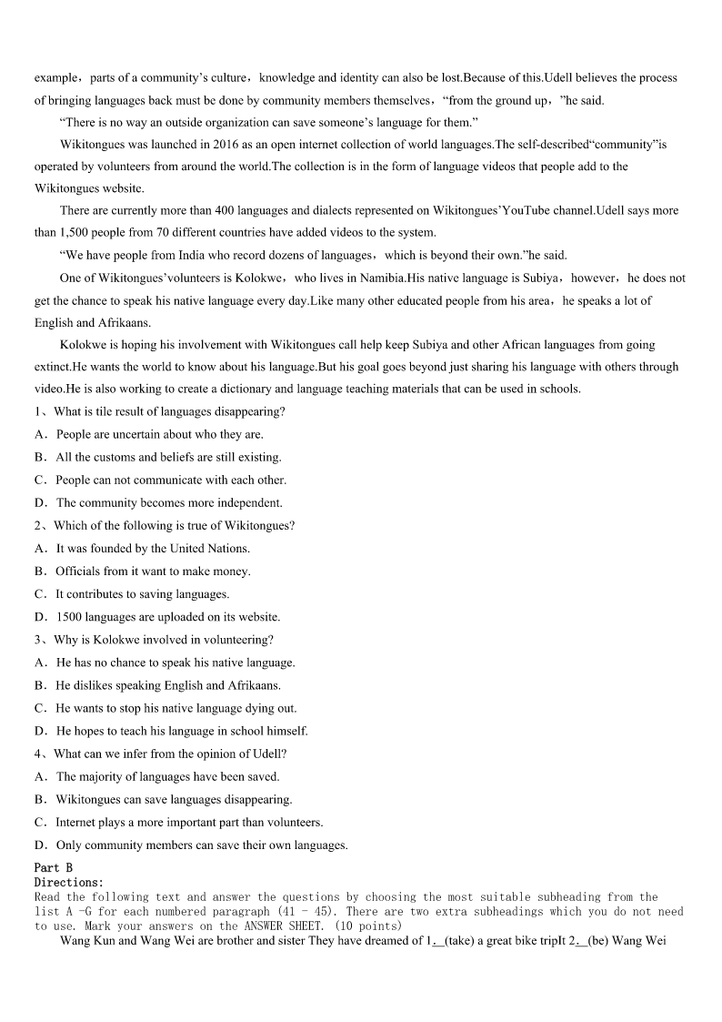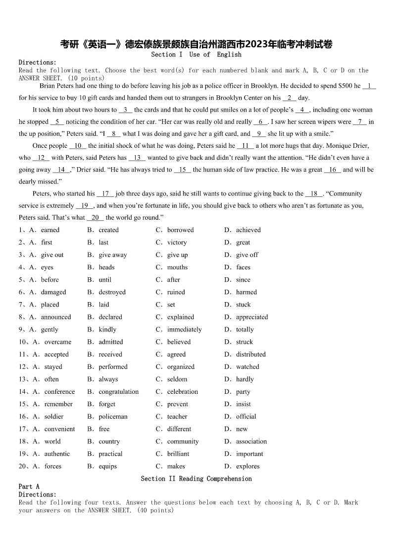 考研《英语一》德宏傣族景颇族自治州潞西市2023年临考冲刺试卷 SectionIUseofEnglish Directions: Readthefollowingtext.Choosethebestword(s)foreachnumberedblankandmarkA,B,CorDonthe ANSWERSHEET.(10points) BrianPetershadonethingtodobeforeleavinghisjobasapoliceofficerinBrooklyn.Hedecidedtospend$500he1 forhisservicetobuy10giftcardsandhandedthemouttostrangersinBrooklynCenteronhis2day. Ittookhimabouttwohoursto3thecardsandthathecouldputsmilesonalotofpeople’s4,includingonewoman hestopped5noticingtheconditionofhercar.“Hercarwasreallyoldandreally6.Isawherscreenwiperswere7in theupposition,”Peterssaid.“I8whatIwasdoingandgaveheragiftcard,and9shelitupwithasmile.” Oncepeople10theinitialshockofwhathewasdoing,Peterssaidhe11alotmorehugsthatday.MoniqueDrier, who12withPeters,saidPetershas13wantedtogivebackanddidn’treallywanttheattention.“Hedidn’tevenhavea goingaway14,”Driersaid.“Hehasalwaystriedto15thehumansideoflawpractice.Hewasagreat16andwillbe dearlymissed.” Peters,whostartedhis17jobthreedaysago,saidhestillwantstocontinuegivingbacktothe18.“Community serviceisextremely19,andwhenyou’refortunateinlife,youshouldgivebacktootherswhoaren’tasfortunateasyou, Peterssaid.That’swhat20theworldgoround.” 1、A.earnedB.createdC.borrowedD.achieved 2、A.firstB.lastC.victoryD.great 3、A.giveoutB.giveawayC.giveupD.giveoff 4、A.eyesB.headsC.mouthsD.faces 5、A.beforeB.untilC.afterD.since 6、A.damagedB.destroyedC.ruinedD.harmed 7、A.placedB.laidC.setD.stuck 8、A.announcedB.declaredC.explainedD.appreciated 9、A.gentlyB.kindlyC.immediatelyD.totally 10、A.overcameB.admittedC.believedD.struck 11、A.acceptedB.receivedC.agreedD.distributed 12、A.stayedB.performedC.organizedD.watched 13、A.oftenB.alwaysC.seldomD.hardly 14、A.conferenceB.congratulationC.celebrationD.party 15、A.rememberB.forgetC.preventD.insist 16、A.soldierB.policemanC.teacherD.official 17、A.convenientB.freeC.differentD.new 18、A.worldB.countryC.communityD.association 19、A.authenticB.practicalC.brilliantD.important 20、A.forcesB.equipsC.makesD.explores SectionIIReadingComprehension PartA Direction
