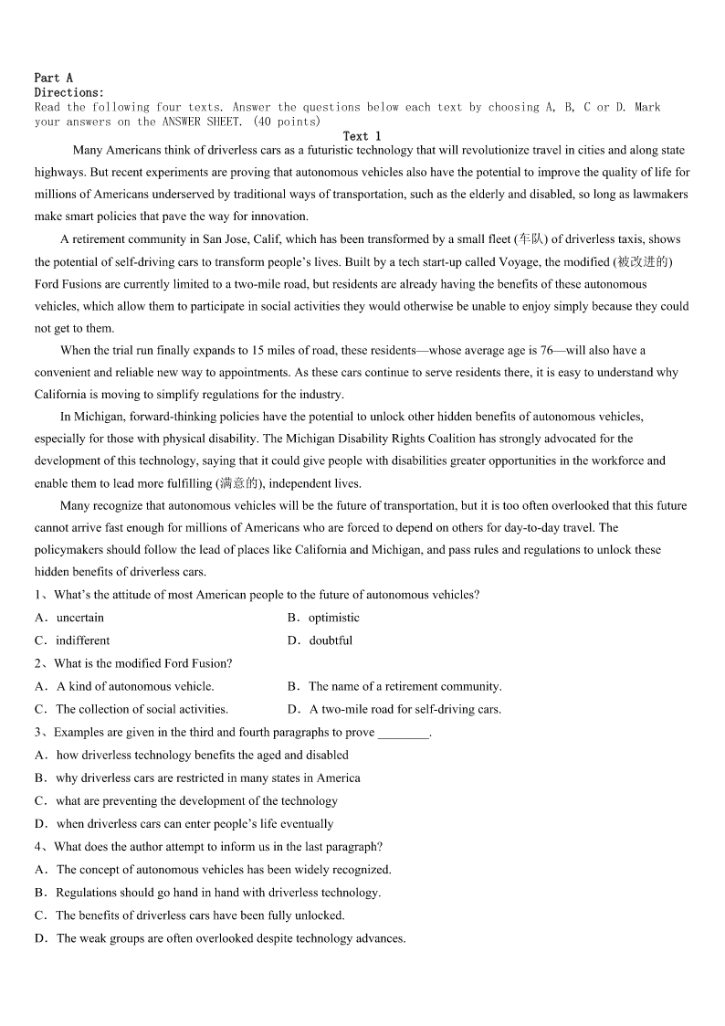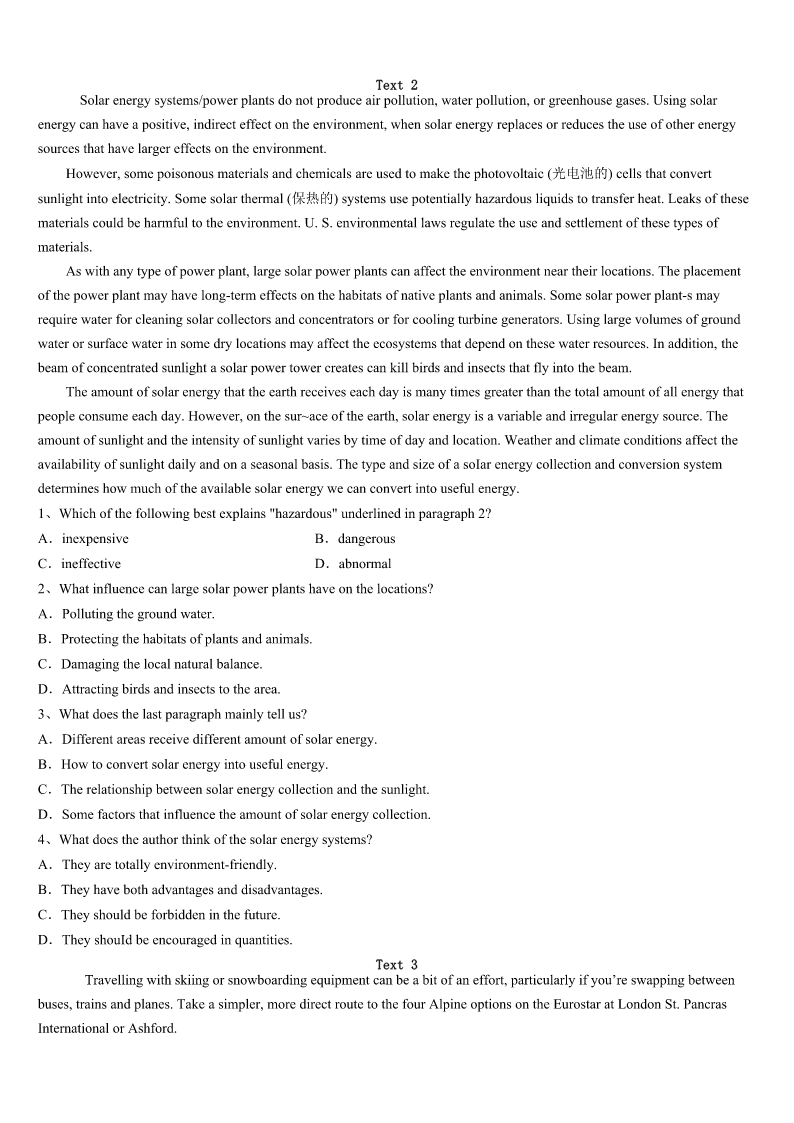 考研《英语一》怀化市麻阳苗族自治县2023年最后冲刺试题 SectionIUseofEnglish Directions: Readthefollowingtext.Choosethebestword(s)foreachnumberedblankandmarkA,B,CorDonthe ANSWERSHEET.(10points) Tworunnersstandsidebysideatthestartinglineofarace.36lookverystrongandfast.37onerunnerspeedsaheadand winstherace.Theother__38__. Someathletescanreachgreat39suchaswinninganOlympicgoldmedal.Othersneverliveuptotheir40.Whatkindof preparationbeforearaceorbeforeotherkindsofeventsmakesthe41? Everyoneknowsthatathletestryto42theirbodies.Butresearchshowsthatstrengtheningthemindmaybejustas43 .Carefulstudyindicatesthatthebestathleteswin44becausetheythinktheycanwin. Positivethoughtsseemtoprovidetheedgefor45insports.Peoplewhosay"IknowIcandothis"tothemselvesoverand over46findthattheyhavetheadvantagetowin.Ontheotherhand,peoplewhothink"Ican'twin"often47. Oneprocedurethathelpsmanyathletesiscreating48intheirmind.Theyaretoldtothinkofeachjumptheymustmaketo 49.Someusepicturesthataremorefanciful.Oneskaterlikedtothinkaboutastarburstinginsideher,50herwith energy.Anotherathletewhowantedtofeel51picturedhimselfasabirdfloatingintheair. Nexttimeyouwanttodosomethingwell.trytrainingyour52tohelpyou.Perhapsateacherorotherinstructorscan53 youplanyourtraining.Ifyouimagineyourselfdoingbetter,youmaysoonseeimprovementsin54youreallycan do.Positivethinkingandpictures55inyourmindcanhelpyouwin! 1、A.NeitherB.AllC.EachD.Both 2、A.ButB.SoC.OrD.And. 3、A.fallsdownB.leavesbehindC.leavesaloneD.fallsbehind 4、A.prizesB.goalsC.medalsD.places 5、A.promiseB.nameC.levelD.ability 6、A.progressB.mistakeC.achievementD.difference 7、A.determineB.expandC.strengthenD.extend 8、A.possibleB.interestingC.difficultD.important 9、A.partlyB.entirelyC.completelyD.mostly 10、A.failureB.luckC.successD.competition 11、A.oftenB.neverC.hardlyD.rarely 12、A.failB.succeedC.understandD.expect 13、A.ideasB.thoughtsC.wondersD.pictures 14、A.failB.runC.winD.go 15、A.givingB.helpingC.takingD.tiring 16、A.encouragedB.calmC.excitedD.anxious 17、A.mindB.bodyC.brainD.imagination 18、A.helpB.adviseC.al