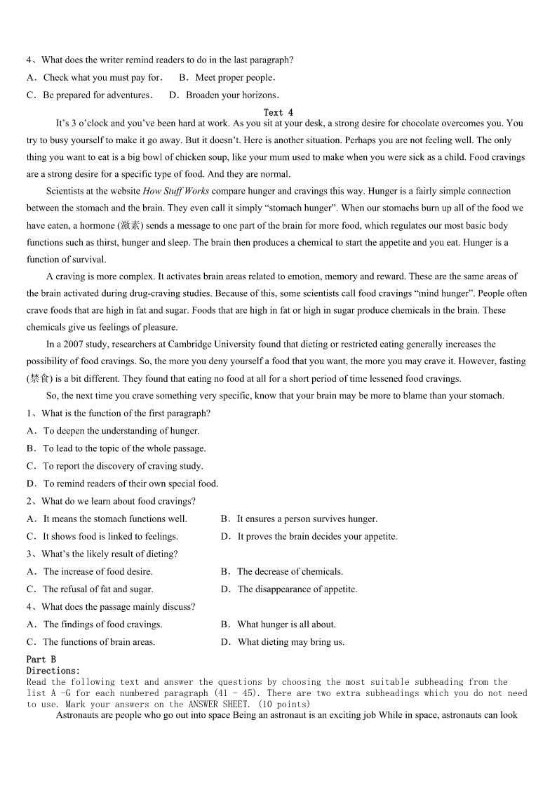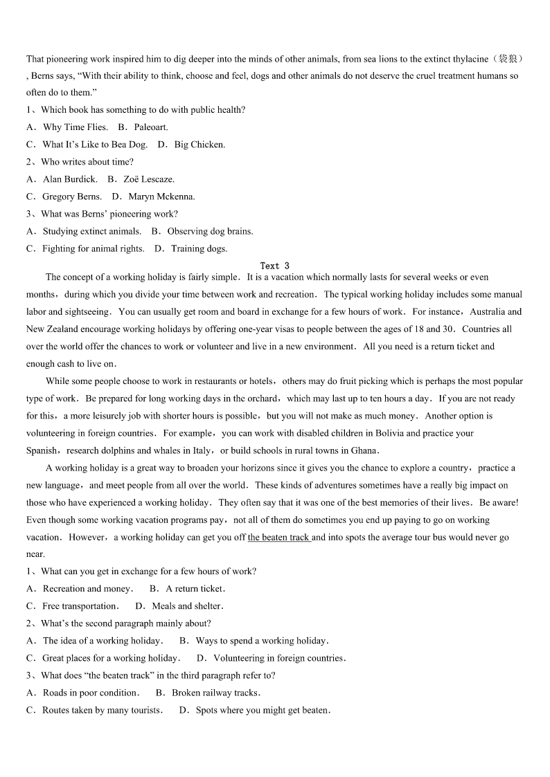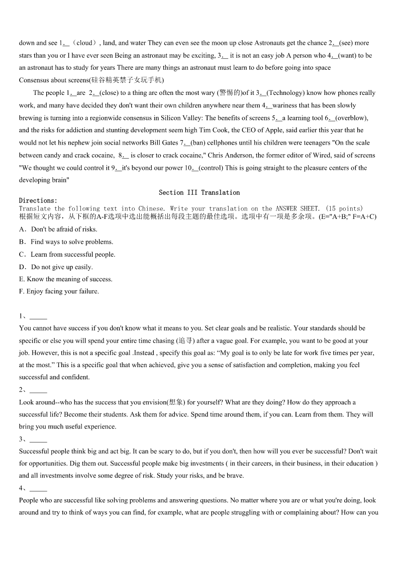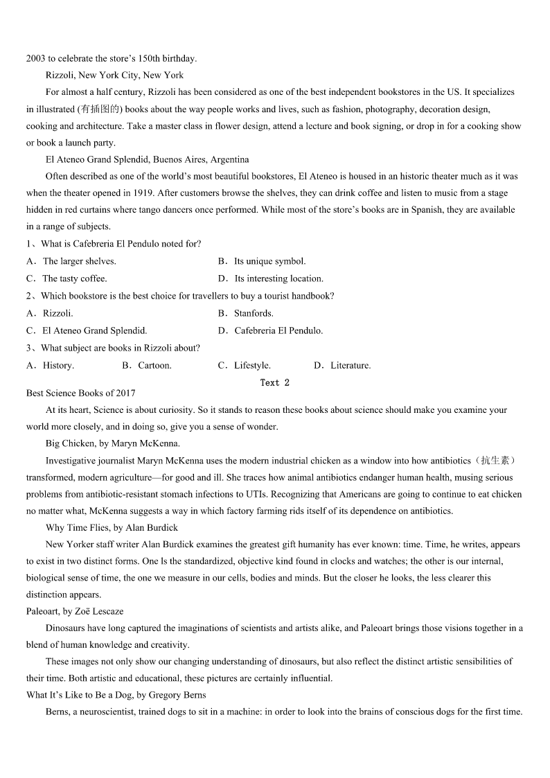 考研《英语一》康平县2023年预测密卷 SectionIUseofEnglish Directions: Readthefollowingtext.Choosethebestword(s)foreachnumberedblankandmarkA,B,CorDonthe ANSWERSHEET.(10points) 阅读下面短文,掌握其大意,然后从各题所给的A、B、C、D四个选项中,选出可以填入空白处的最佳选项。 IwassixwhenIjoinedmyfather'sfieldsinOkla.BythetimeIwaseight,IwashelpingDad1oldfurniture.Hegavemea centforeverynailI2outofoldboards.Igotmyfirstrealjob,atJM'sRestaurantwhenIwas12.Mymainresponsibilities were3tables.Atthatage,itwas4goingtoworkandglimpsedatmyfriendsrunofftoswimorplay.Ididn'tnecessarily likework,butIlovedwhatworking5metohave.Becauseofmyjob,Iwasalwaysthefirstonetobuysomethingdelicious. Thismademe6. WordthatIwastrustworthyandhard-working7aroundtown.Alocalclothingstoreofferedmecreditdespitemyyoungage. Iimmediatelyboughtanexpensivecoatandshoesoncredit.Iwas8only65centsanhour,andIalreadyowedthestore keeper$90! SoIlearned9thedangerofeasycredit.IpaiditoffassoonasIcould.Myfirstjobtaughtme10andbroughtmealevelof personalsatisfactionfewofmyfriendshad11Asmyfather,whoworkedthreejobs,oncetoldme,“Ifyouunderstand sacrificeand12,therearenotmanythingsinlifeyoucan'thave.”Howrighthewas. 1、A.makeB.paintC.sellD.repair 2、A.pulledB.putC.pickedD.pressed 3、A.sweepingB.packingC.clearingD.emptying 4、A.easyB.heavyC.difficultD.pleasant 5、A.allowedB.preferredC.taughtD.managed 6、A.proudB.richC.gratefulD.hopeful 7、A.showedB.gotC.flewD.carried 8、A.raisingB.spendingC.countingD.making 9、A.greatlyB.actuallyC.hardlyD.really 10、A.self-developmentB.self-controlC.self-criticismD.self-confidence 11、A.lostB.improvedC.developedD.experienced 12、A.responsibilityB.promiseC.independenceD.ambition SectionIIReadingComprehension PartA Directions: Readthefollowingfourtexts.AnswerthequestionsbeloweachtextbychoosingA,B,CorD.Mark youranswersontheANSWERSHEET.(40points) Text1 TheWorld’sGreatestBookstores CafebreriaElPéndulo,MexicoCity,Mexico Partcafe,partcoffeehouse,partbarandpartbookstore,CafebreriaElPénduloislocatedinMexicoCity.Bookslinethe shelvesfromtheceilingtothefloor,andliveplantsaddlotsofgreen.Thesto