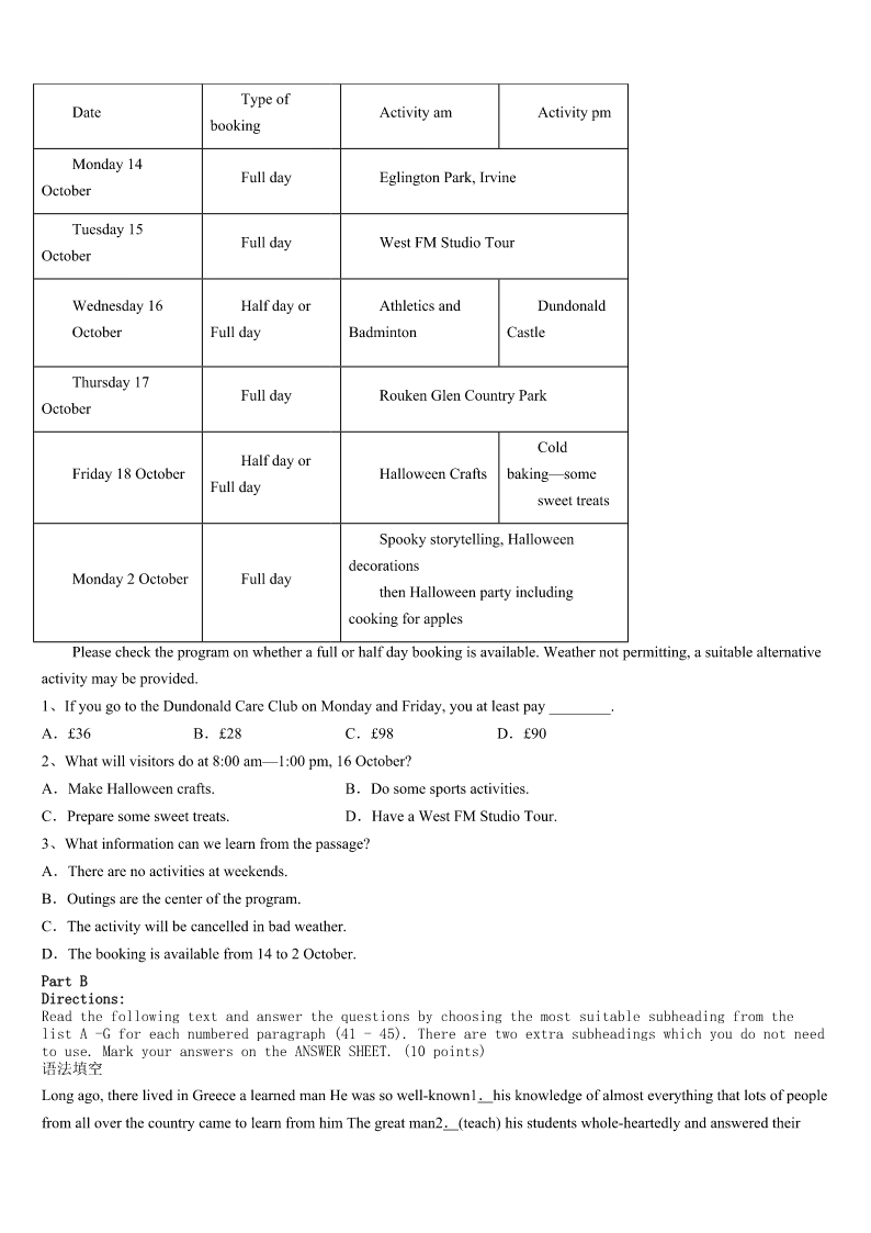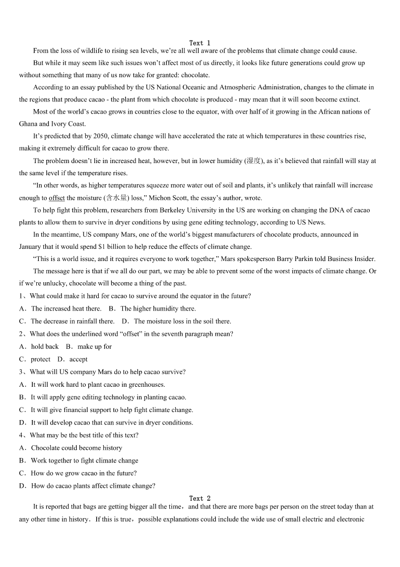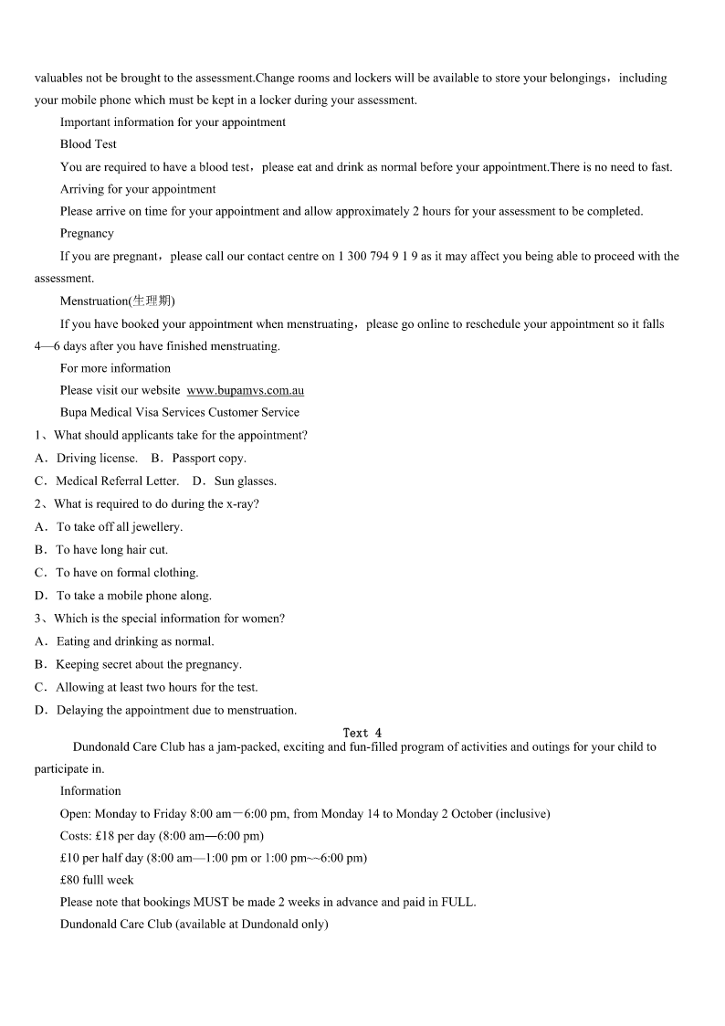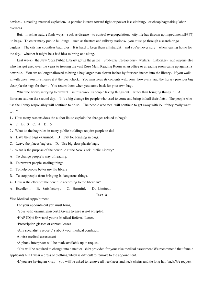 考研《英语一》惠州市博罗县2023年预测试题 SectionIUseofEnglish Directions: Readthefollowingtext.Choosethebestword(s)foreachnumberedblankandmarkA,B,CorDonthe ANSWERSHEET.(10points) Itwasacoldnight.AsIwaswalkingpasta1shop,ahomelessguycameuptomeandaskedmeforsome2.Ihave alwaysbeen3ofgivingoutmoneyto4peopleforacoupleofreasons.First,Idon'tknow5theywilldowithit.Thereis thepossibility(可能性)thattheywilluseitto6themselvesordosomethinggood.7,thereisthepossibilitythatthey willuseitforalcohol(酒精).IfI8handthemmoney,Iwillnever9.Second,Ibelievethatgivingmoney—thistypeof actkeepsthemmastateof10.Idon'twantto11themtoalwaysaskformoneywithouttryingto12itinadifferentway thatbringshappiness.Therearepeopleouttherewhodoneedahelpinghand,butyouneverknowwhattheyusethemoneyfor 13youask. Idecidedtoaskhimwhatheneededmoneyfor.Hesaidhejustwantedsomecoffee.Ididsmellalcoholcomingoutof him,soIwasalittle14.Ifallhewantedwascoffeeandwewereinfrontofacoffeeshop,Ithought,just15the intermediary(中间媒介)—money.SoIboughtacupofcoffeeforhim.Hewalkedawayhappilyandwas16tome. Icontinuethis17everytimeImeetwithhomelesspeople.18givingmoneyawayand19forthebest,gettingthem whatthey20willhaveagoodeffect(影响)foralongtime. 1、A.foodB.toyC.bookD.coffee 2、A.clothesB.moneyC.drinksD.medicine 3、A.unsureB.supportiveC.proudD.fond 4、A.carelessB.differentC.homelessD.worried 5、A.whyB.whenC.howD.what 6、A.congratulateB.betterC.devoteD.appreciate 7、A.ThereforeB.AboveallC.HoweverD.Forsure 8、A.stillB.alreadyC.justD.ever 9、A.judgeB.realizeC.seeD.know 10、A.lazinessB.uselessnessC.gloryD.calmness 11、A.persuadeB.encourageC.requestD.command 12、A.earnB.useC.findD.pay 13、A.thoughB.unlessC.becauseD.once 14、A.carefulB.sadC.patientD.excited 15、A.doubtB.saveC.skipD.serve 16、A.gratefulB.kindC.politeD.generous 17、A.customB.practiceC.trainingD.tradition 18、A.LessthanB.MorethanC.RatherthanD.Otherthan 19、A.lookingB.askingC.waitingD.hoping 20、A.wantB.thinkC.valueD.insist SectionIIReadingComprehension PartA Directions: Readthefollowingfourtexts.Answerthequestionsbeloweachtextbychoo