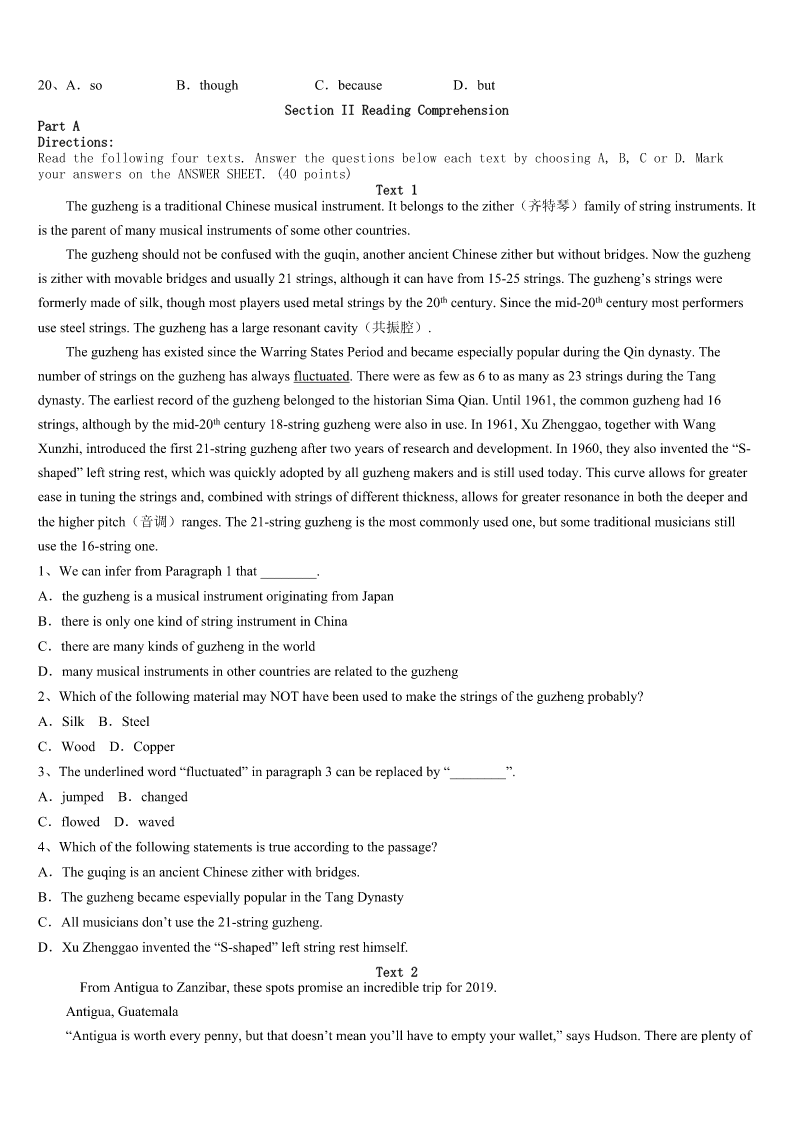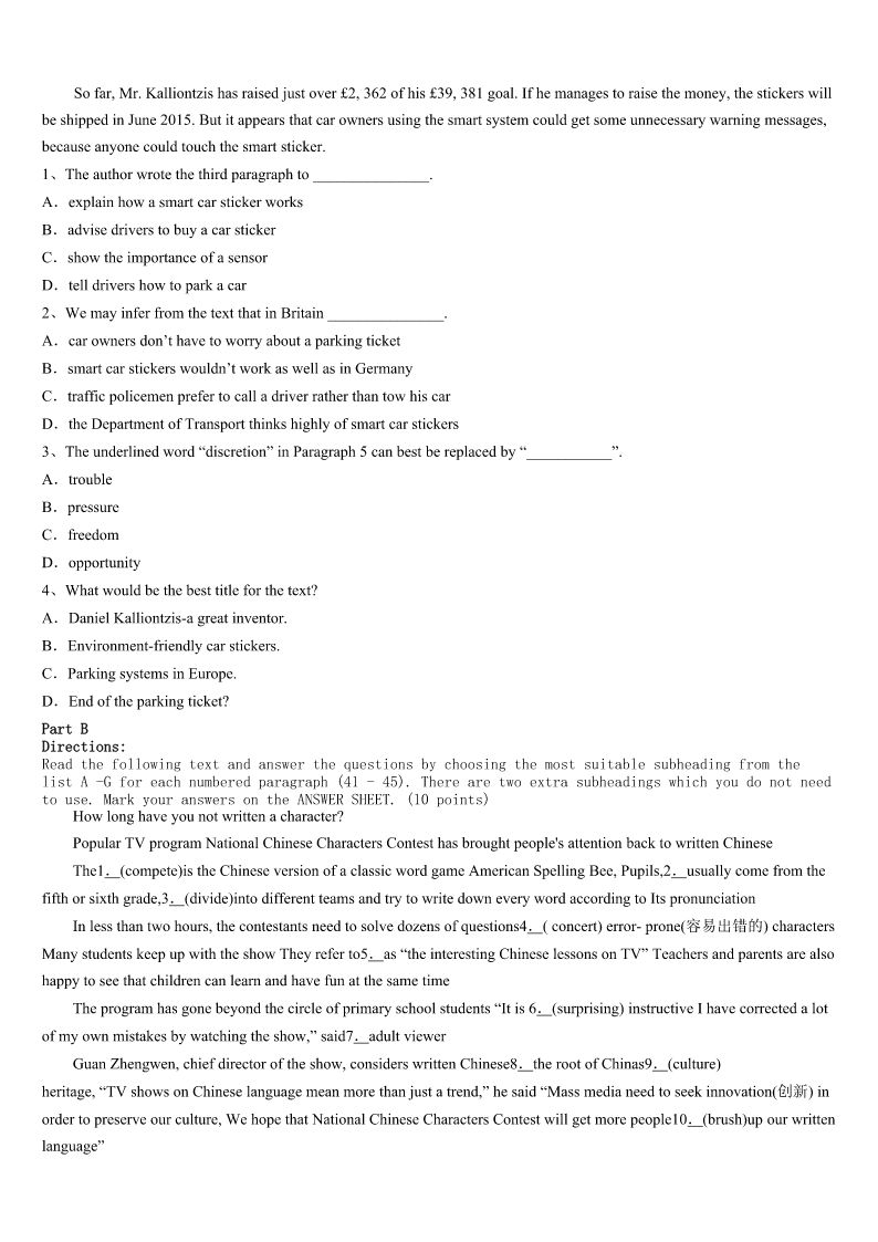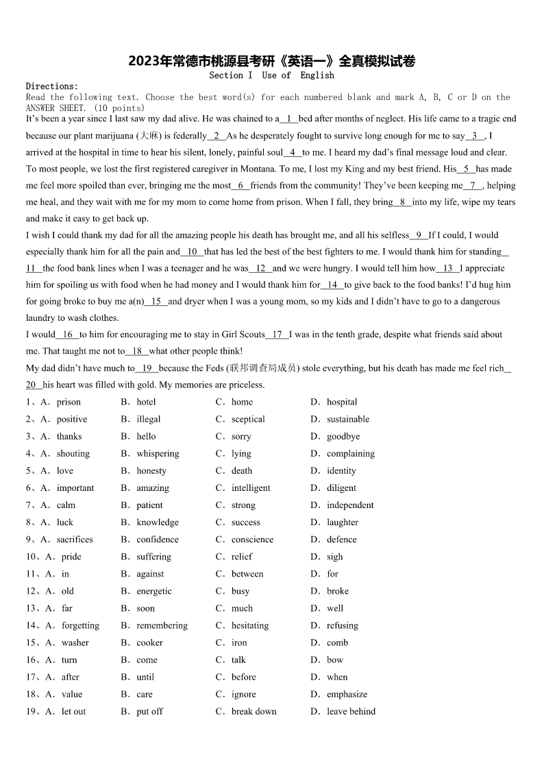 2023年常德市桃源县考研《英语一》全真模拟试卷 SectionIUseofEnglish Directions: Readthefollowingtext.Choosethebestword(s)foreachnumberedblankandmarkA,B,CorDonthe ANSWERSHEET.(10points) It’sbeenayearsinceIlastsawmydadalive.Hewaschainedtoa1bedaftermonthsofneglect.Hislifecametoatragicend becauseourplantmarijuana(大麻)isfederally2Ashedesperatelyfoughttosurvivelongenoughformetosay3,I arrivedatthehospitalintimetohearhissilent,lonely,painfulsoul4tome.Iheardmydad’sfinalmessageloudandclear. Tomostpeople,welostthefirstregisteredcaregiverinMontana.Tome,IlostmyKingandmybestfriend.His5hasmade mefeelmorespoiledthanever,bringingmethemost6friendsfromthecommunity!They’vebeenkeepingme7,helping meheal,andtheywaitwithmeformymomtocomehomefromprison.WhenIfall,theybring8intomylife,wipemytears andmakeiteasytogetbackup. IwishIcouldthankmydadforalltheamazingpeoplehisdeathhasbroughtme,andallhisselfless9IfIcould,Iwould especiallythankhimforallthepainand10thathasledthebestofthebestfighterstome.Iwouldthankhimforstanding 11thefoodbanklineswhenIwasateenagerandhewas12andwewerehungry.Iwouldtellhimhow13Iappreciate himforspoilinguswithfoodwhenhehadmoneyandIwouldthankhimfor14togivebacktothefoodbanks!I’dhughim forgoingbroketobuymea(n)15anddryerwhenIwasayoungmom,somykidsandIdidn’thavetogotoadangerous laundrytowashclothes. Iwould16tohimforencouragingmetostayinGirlScouts17Iwasinthetenthgrade,despitewhatfriendssaidabout me.Thattaughtmenotto18whatotherpeoplethink! Mydaddidn’thavemuchto19becausetheFeds(联邦调查局成员)stoleeverything,buthisdeathhasmademefeelrich 20hisheartwasfilledwithgold.Mymemoriesarepriceless. 1、A.prisonB.hotelC.homeD.hospital 2、A.positiveB.illegalC.scepticalD.sustainable 3、A.thanksB.helloC.sorryD.goodbye 4、A.shoutingB.whisperingC.lyingD.complaining 5、A.loveB.honestyC.deathD.identity 6、A.importantB.amazingC.intelligentD.diligent 7、A.calmB.patientC.strongD.independent 8、A.luckB.knowledgeC.successD.laughter 9、A.sacrificesB.confidenceC.conscienceD.defence 10、A.prideB.sufferingC.reliefD.sigh 11、A.inB.againstC.betweenD.for 12