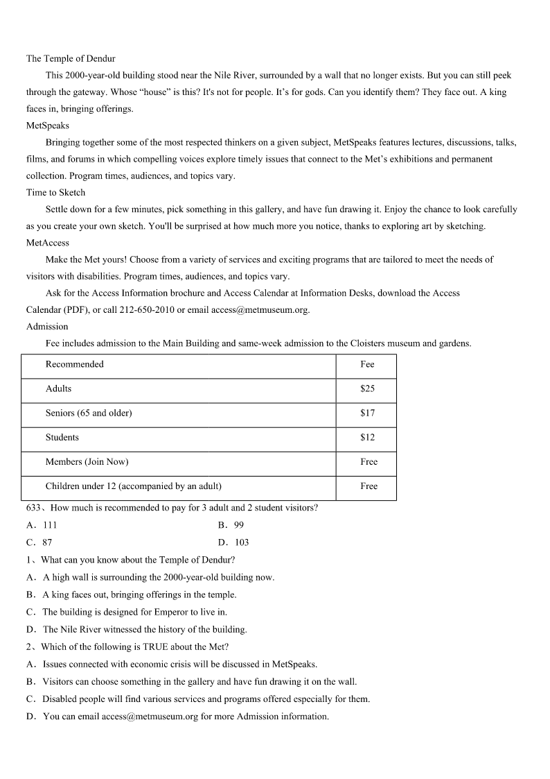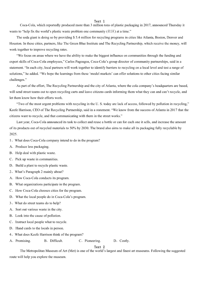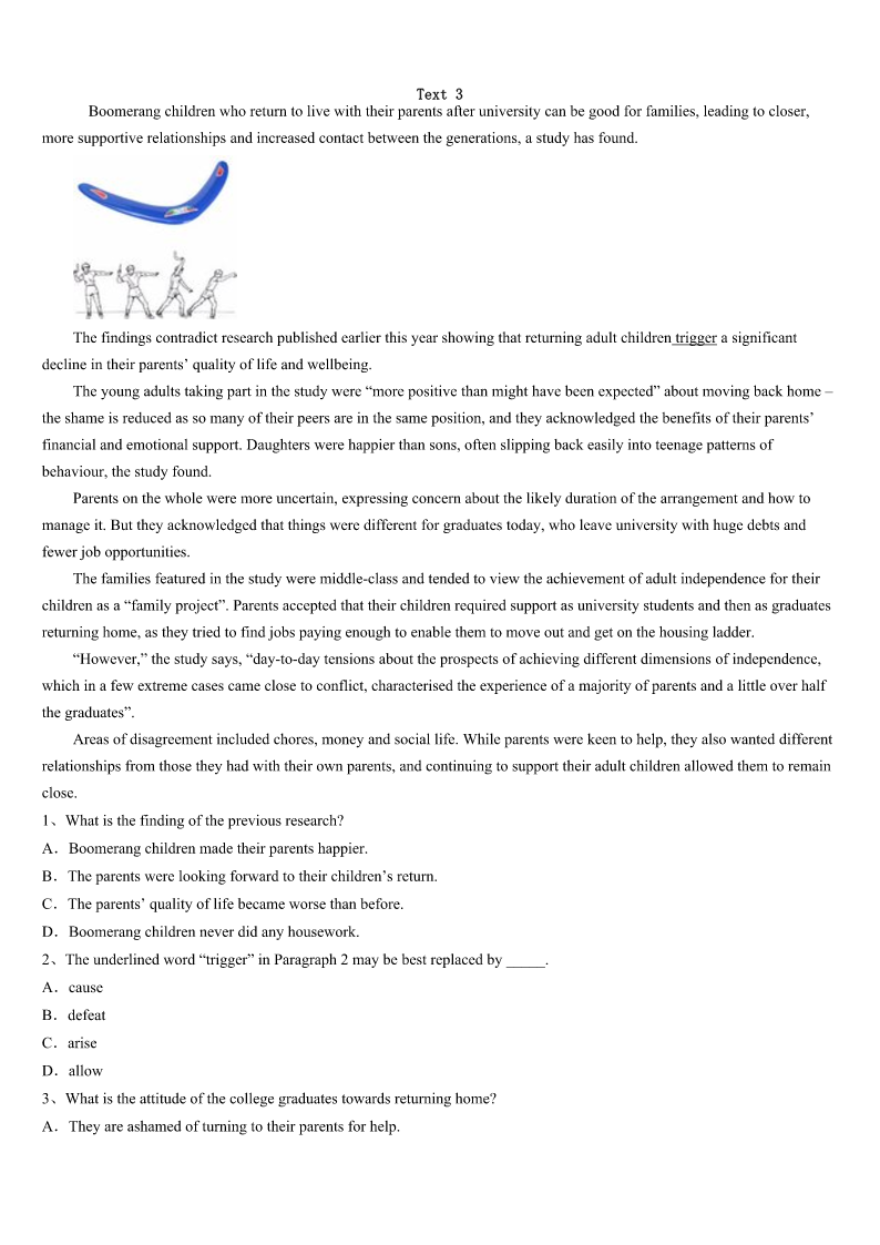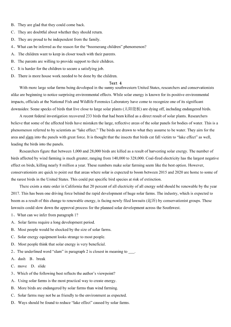 考研《英语一》抚顺市新抚区2023年临考冲刺试卷 SectionIUseofEnglish Directions: Readthefollowingtext.Choosethebestword(s)foreachnumberedblankandmarkA,B,CorDonthe ANSWERSHEET.(10points) TracyWongisawell-knownChinese-Americanwriter.Butherwriting1wassomethingshepickedupbyherself.Afterher first2,teachingdisabledchildren,shebecameapart-timewriterforIBM.3,writingstorieswassimplya4interest. Tracysentthreeofherstoriestoapublisher.5,theyimmediatelysuggestedthatsheputthemtogethertomakeasingleone long6andpaidTracya$15,000advance.“Aprettymoney,”saidthepublisher,“for7writer.” 8Tracy’scharactersareinteresting,herstoriessometimes9readersuneasy:thoseaboutthesupernatural.“Mymother believedIcould10theafterlifeworld,”shetoldaclosefriend.“Sheusedtohavemespeakwithmygrandmother,whodied manyyearsago.” “CanI?Idon’tthinkIcan,”Tracysaidwithalaugh.“ButIdohave11whenthingscometome12“Once,shewas wonderinghowtocompletea13setinancientChina.14thedoorbellrang.ItwasaFedExdeliveryman,withacopyofa bookonChinese15Itcamewithoutherhaving16it. Thoughshehaspublished45books,Tracyhasremained17byherfame.Shelivesinthesame18shelived27yearsago —althoughinamorecomfortablehome.There’smoreroomfor19inherlife—anditwasn’tjust20 1、A.practiceB.experienceC.skillD.method 2、A.jobB.effortC.dutyD.task 3、A.InsteadB.ThenC.CertainlyD.Normally 4、A.generalB.deepC.livelyD.personal 5、A.InterestedB.AnxiouslyC.SeriouslyD.Encouraged 6、A.storyB.filmC.programD.article 7、A.aforeignB.apopularC.anunknownD.anunusual 8、A.NowthatB.EventhoughC.JustbecauseD.Exceptthat 9、A.findB.turnC.holdD.leave 10、A.connectwithB.makeupC.controlD.explain 11、A.eventsB.momentsC.feelingsD.chances 12、A.asgiftsB.fromadistanceC.byaccidentD.fornoreason 13、A.descriptionB.conditionC.sceneD.talk 14、A.SurprisinglyB.FortunatelyC.ExpectedlyD.Suddenly 15、A.cookingB.medicineC.historyD.play 16、A.orderedB.sentC.realizedD.known 17、A.determinedB.excitedC.unchangedD.unmoved 18、A.lifeB.wayC.houseD.city 19、A.successB.joyC.workD.variety 20、A.reportingB.funC.luckD.writing SectionIIReadingComprehension PartA