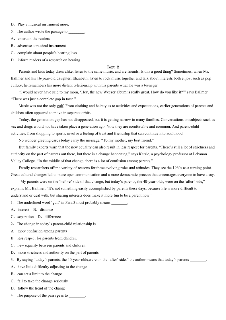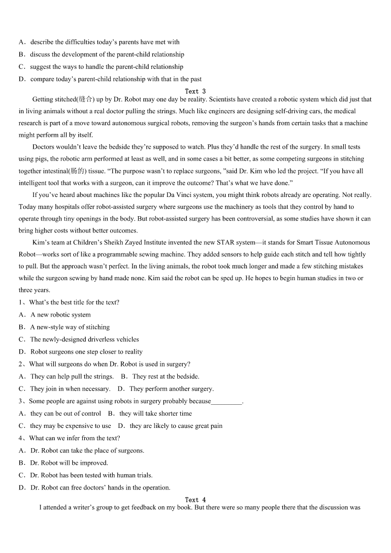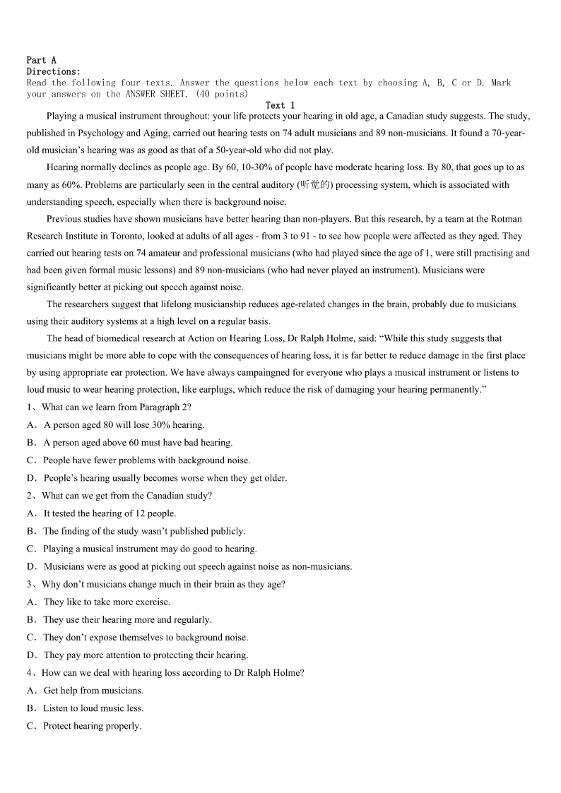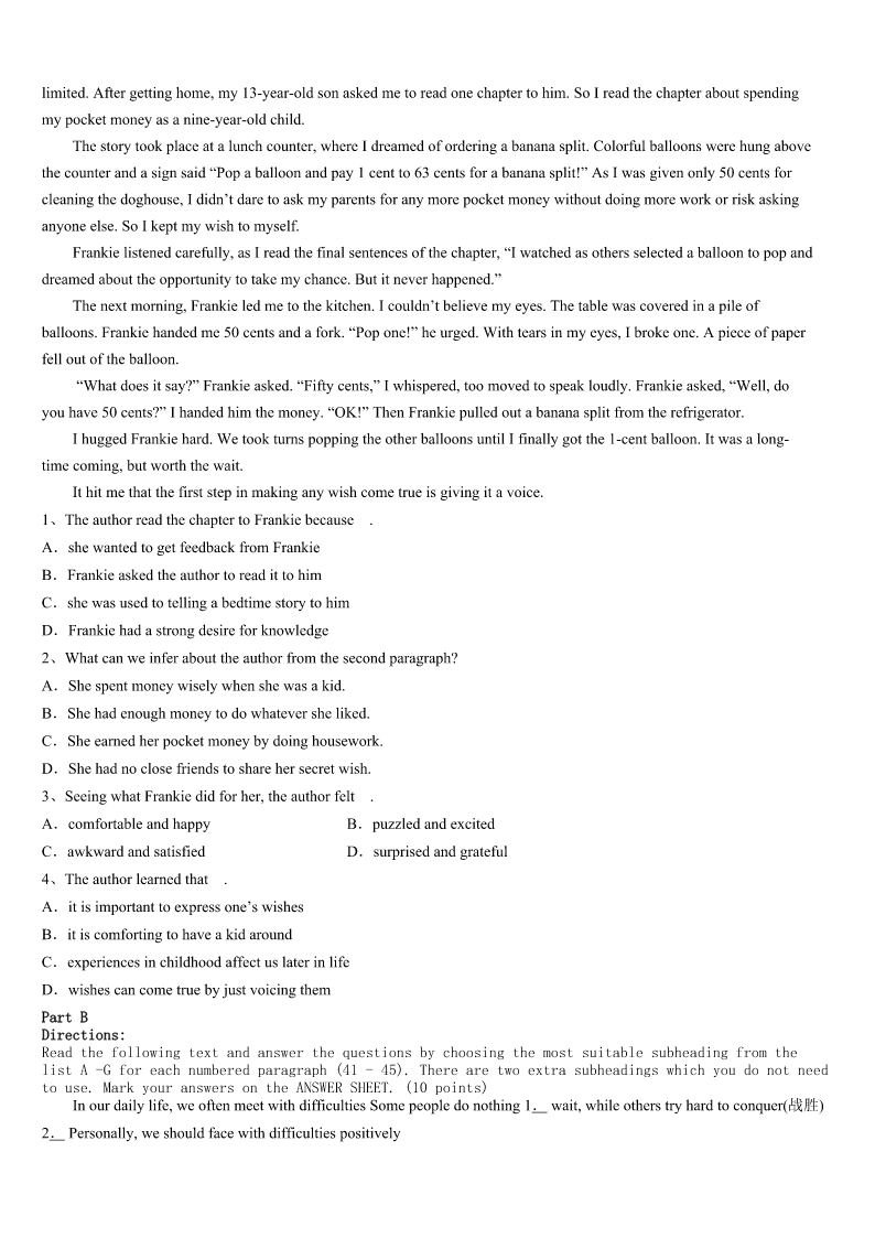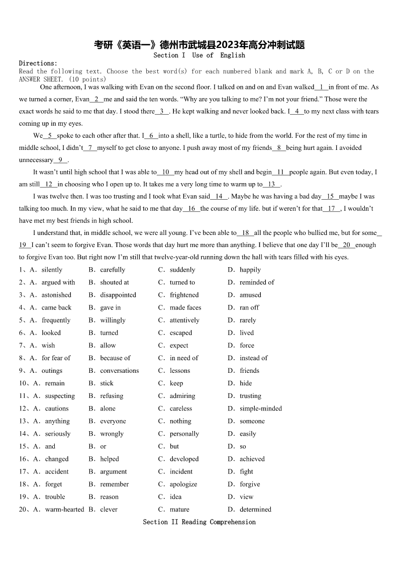 考研《英语一》德州市武城县2023年高分冲刺试题 SectionIUseofEnglish Directions: Readthefollowingtext.Choosethebestword(s)foreachnumberedblankandmarkA,B,CorDonthe ANSWERSHEET.(10points) Oneafternoon,IwaswalkingwithEvanonthesecondfloor.ItalkedonandonandEvanwalked1infrontofme.As weturnedacorner,Evan2meandsaidthetenwords.“Whyareyoutalkingtome?I’mnotyourfriend.”Thosewerethe exactwordshesaidtomethatday.Istoodthere3.Hekeptwalkingandneverlookedback.I4tomynextclasswithtears comingupinmyeyes. We5spoketoeachotherafterthat.I6intoashell,likeaturtle,tohidefromtheworld.Fortherestofmytimein middleschool,Ididn’t7myselftogetclosetoanyone.Ipushawaymostofmyfriends8beinghurtagain.Iavoided unnecessary9. Itwasn’tuntilhighschoolthatIwasableto10myheadoutofmyshellandbegin11peopleagain.Buteventoday,I amstill12inchoosingwhoIopenupto.Ittakesmeaverylongtimetowarmupto13. Iwastwelvethen.IwastootrustingandItookwhatEvansaid14.Maybehewashavingabadday15maybeIwas talkingtoomuch.Inmyview,whathesaidtomethatday16thecourseofmylife.butifweren’tforthat17,Iwouldn’t havemetmybestfriendsinhighschool. Iunderstandthat,inmiddleschool,wewereallyoung.I’vebeenableto18allthepeoplewhobulliedme,butforsome 19Ican’tseemtoforgiveEvan.Thosewordsthatdayhurtmemorethananything.IbelievethatonedayI’llbe20enough toforgiveEvantoo.ButrightnowI’mstillthattwelve-year-oldrunningdownthehallwithtearsfilledwithhiseyes. 1、A.silentlyB.carefullyC.suddenlyD.happily 2、A.arguedwithB.shoutedatC.turnedtoD.remindedof 3、A.astonishedB.disappointedC.frightenedD.amused 4、A.camebackB.gaveinC.madefacesD.ranoff 5、A.frequentlyB.willinglyC.attentivelyD.rarely 6、A.lookedB.turnedC.escapedD.lived 7、A.wishB.allowC.expectD.force 8、A.forfearofB.becauseofC.inneedofD.insteadof 9、A.outingsB.conversationsC.lessonsD.friends 10、A.remainB.stickC.keepD.hide 11、A.suspectingB.refusingC.admiringD.trusting 12、A.cautionsB.aloneC.carelessD.simple-minded 13、A.anythingB.everyoneC.nothingD.someone 14、A.seriouslyB.wronglyC.personallyD.easily 15、A.andB.orC.butD.so 16、A.changedB.helpedC.developedD.achi