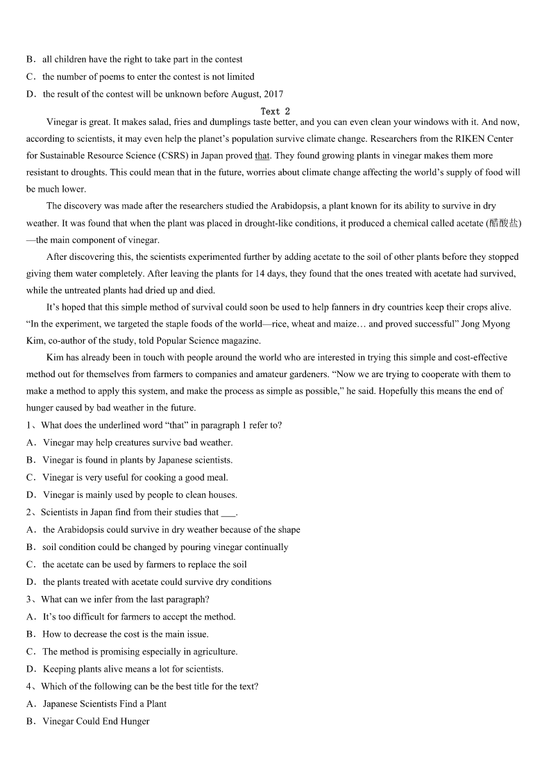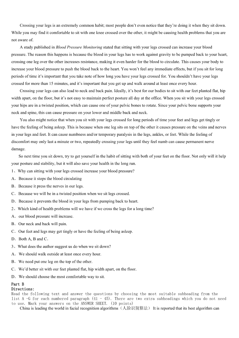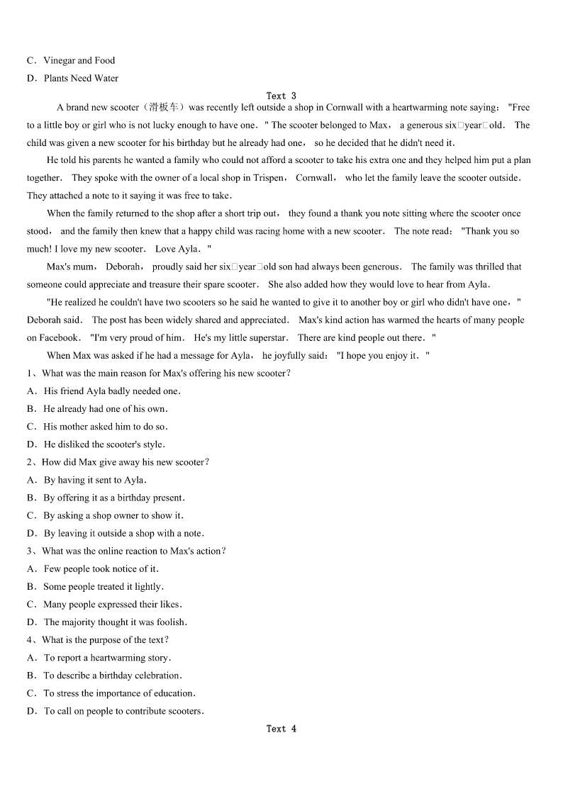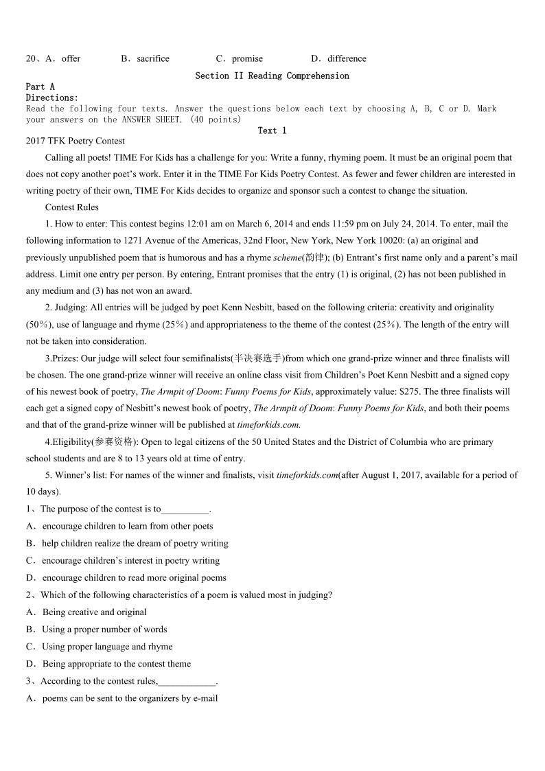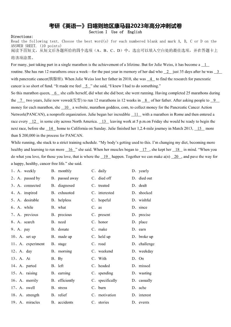 考研《英语一》日喀则地区康马县2023年高分冲刺试卷 SectionIUseofEnglish Directions: Readthefollowingtext.Choosethebestword(s)foreachnumberedblankandmarkA,B,CorDonthe ANSWERSHEET.(10points) 阅读下面短文,从短文后各题所给的四个选项(A、B、C、D)中,选出可以填入空白处的最佳选项,并在答题卡上 将该项涂黑。 Formany,justtakingpartinasinglemarathonistheachievementofalifetime.ButforJulieWeiss,ithasbecomea1 routine.Shehasrun12marathonsonceaweek—forthepastyearinmemoryofherdadwho2just35daysafterhewas3 withpancreaticcancer(胰腺癌).WhenJulieWeisslostherfatherin2010,shewas4tofindtheresearchforpancreatic cancerissoshortoffund.“Itmademefeel5”shesaid,“IknewIhadtodosomething.” Sothismarathonqueen,6shecallsherself,didwhatshedidbest;shewentrunning.Havingcompleted25marathonsduring the7twoyears,Julienowvowed(发誓)torun12marathonsin12weeksin8ofherfather.Afteraskingpeopleto9 moneyforeachmarathon,she10awebsite,marathongoddess,com,tocollectmoneyforthePancreaticCancerAction Network(PANCAN),anonprofitorganization.Juliebeganherincredible11withamarathoninRomeandthenentereda raceevery12insomecityacrossNorthAmerica.13leavingworkat5p.m.onFridayshewouldbereadytobeginthe nextrace,beforeshe14hometoCaliforniaonSunday.Juliefinishedher1,2.4-milejourneyinMarch2013,15more than$200,000intheprocessforPANCAN. Whilerunning,shestucktoastricttrainingschedule.“Mybody’sgettingusedtothis.I’mchangingmydiet,becomingmore healthyandlearningtorunmore16”shesaid.Whenhermusclesbeganto17,shekepther18inmind.“Whenyou dowhatyoulove,forthoseyoulove,thatiswherethe19happen.Togetherwecanmakea(n)20,andpavethewayfor ahappy,healthy,cancerfreelife.”shesaid. 1、A.weeklyB.monthlyC.dailyD.yearly 2、A.passedbyB.passedawayC.diedoffD.diedout 3、A.connectedB.diagnosedC.treatedD.dealt 4、A.inspiredB.exhaustedC.interestedD.shocked 5、A.desirableB.helplessC.hopefulD.wishful 6、A.whileB.whatC.asD.since 7、A.previousB.preciousC.presentD.precise 8、A.searchB.needC.honorD.place 9、A.payB.donateC.makeD.earn 10、A.setupB.madeupC.heldupD.brokeup 11、A.experimentB.stageC.roadD.challenge 12、A.dayB.morningC.weekendD.weekday 13、A.AtB.ByC.WithD.On 1