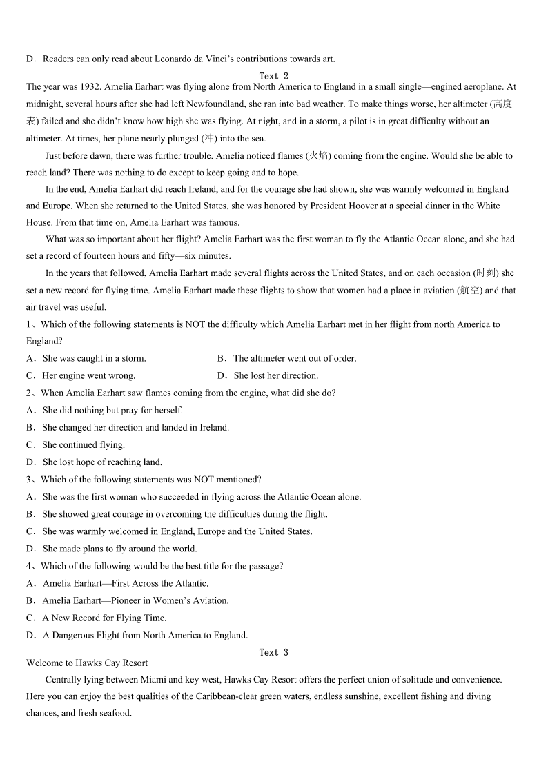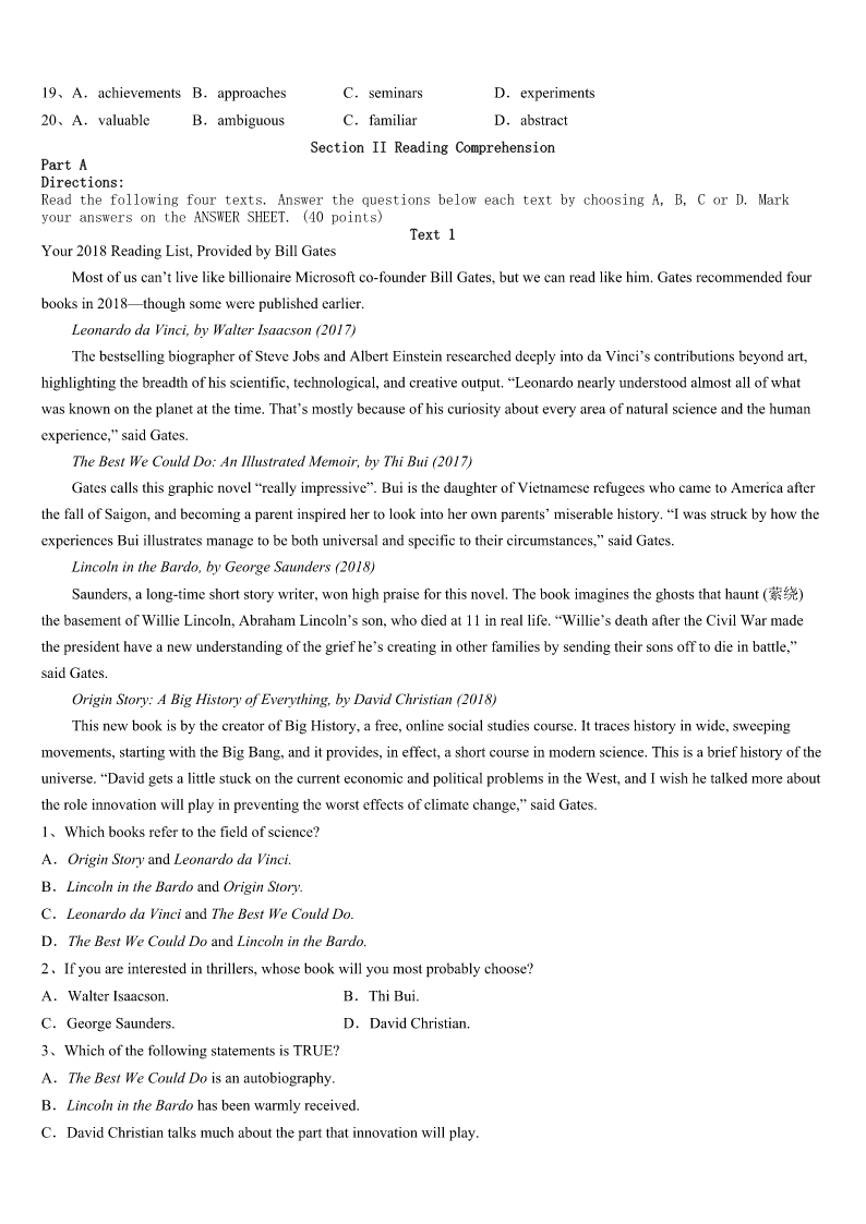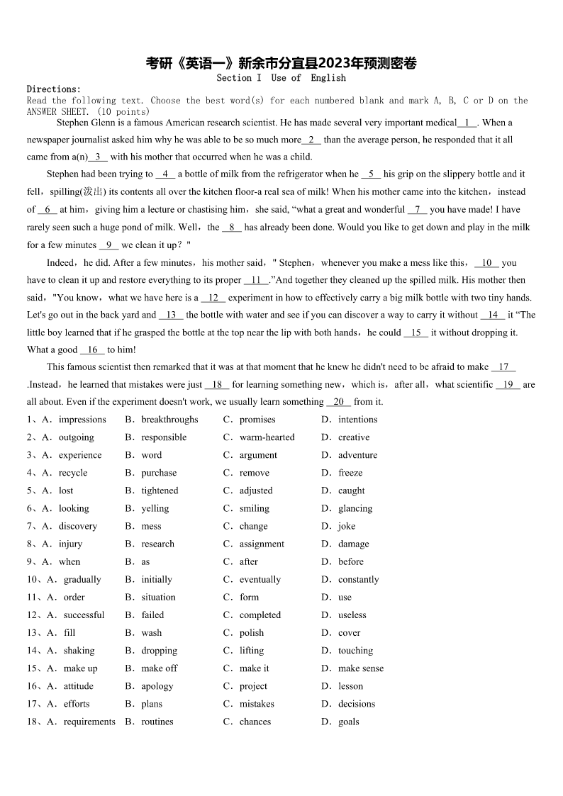 考研《英语一》新余市分宜县2023年预测密卷 SectionIUseofEnglish Directions: Readthefollowingtext.Choosethebestword(s)foreachnumberedblankandmarkA,B,CorDonthe ANSWERSHEET.(10points) StephenGlennisafamousAmericanresearchscientist.Hehasmadeseveralveryimportantmedical1.Whena newspaperjournalistaskedhimwhyhewasabletobesomuchmore2thantheaverageperson,herespondedthatitall camefroma(n)3withhismotherthatoccurredwhenhewasachild. Stephenhadbeentryingto4abottleofmilkfromtherefrigeratorwhenhe5hisgripontheslipperybottleandit fell,spilling(泼出)itscontentsalloverthekitchenfloorarealseaofmilk!Whenhismothercameintothekitchen,instead of6athim,givinghimalectureorchastisinghim,shesaid,“whatagreatandwonderful7youhavemade!Ihave rarelyseensuchahugepondofmilk.Well,the8hasalreadybeendone.Wouldyouliketogetdownandplayinthemilk forafewminutes9wecleanitup?" Indeed,hedid.Afterafewminutes,hismothersaid,"Stephen,wheneveryoumakeamesslikethis,10you havetocleanitupandrestoreeverythingtoitsproper11.”Andtogethertheycleanedupthespilledmilk.Hismotherthen said,"Youknow,whatwehavehereisa12experimentinhowtoeffectivelycarryabigmilkbottlewithtwotinyhands. Let'sgooutinthebackyardand13thebottlewithwaterandseeifyoucandiscoverawaytocarryitwithout14it“The littleboylearnedthatifhegraspedthebottleatthetopnearthelipwithbothhands,hecould15itwithoutdroppingit. Whatagood16tohim! Thisfamousscientistthenremarkedthatitwasatthatmomentthatheknewhedidn'tneedtobeafraidtomake17 .Instead,helearnedthatmistakeswerejust18forlearningsomethingnew,whichis,afterall,whatscientific19are allabout.Eveniftheexperimentdoesn'twork,weusuallylearnsomething20fromit. 1、A.impressionsB.breakthroughsC.promisesD.intentions 2、A.outgoingB.responsibleC.warmheartedD.creative 3、A.experienceB.wordC.argumentD.adventure 4、A.recycleB.purchaseC.removeD.freeze 5、A.lostB.tightenedC.adjustedD.caught 6、A.lookingB.yellingC.smilingD.glancing 7、A.discoveryB.messC.changeD.joke 8、A.injuryB.researchC.assignmentD.damage 9、A.whenB.asC.afterD.before 10、A.graduallyB.initiallyC.eventuallyD.cons