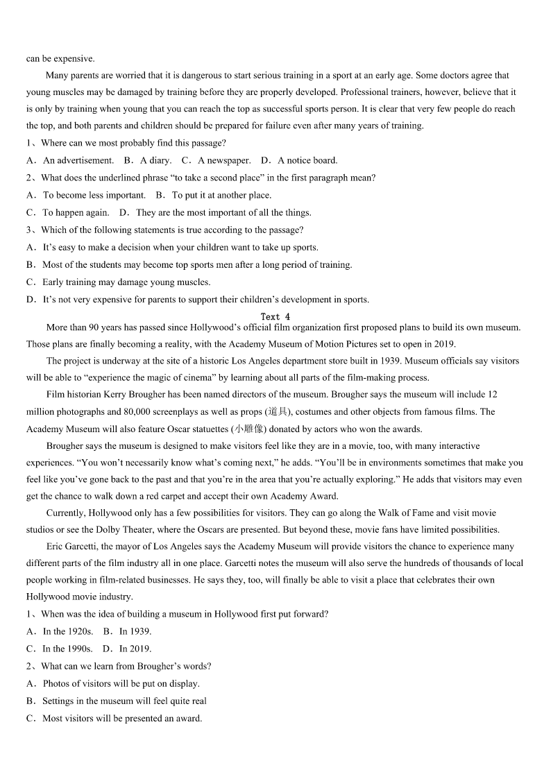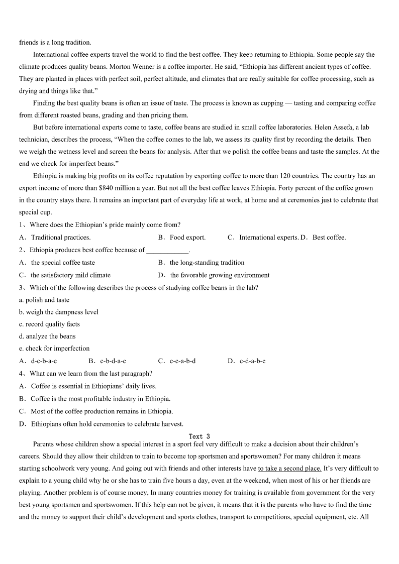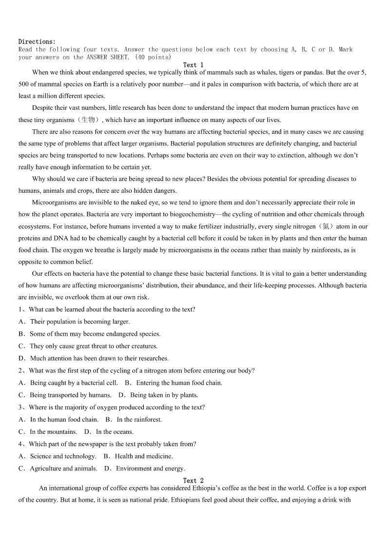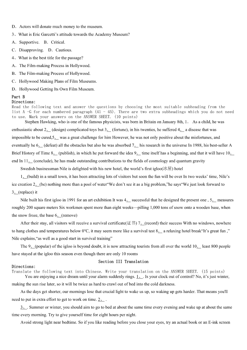 考研《英语一》朝阳市双塔区2023年临考冲刺试卷 SectionIUseofEnglish Directions: Readthefollowingtext.Choosethebestword(s)foreachnumberedblankandmarkA,B,CorDonthe ANSWERSHEET.(10points) Ihavealwaysbeenanindependentperson,butIhavecometoknowthatbeingindependentdoesnotmeanrefusing help.Iam1askingforhelp,andItrytoaccept.Furthermore,Iwilleven2helpandwhensomeoneisintrouble,I3 walkaway.Andallthesechangescamefromanaccidentonanisland. Sometimesaperson’sindependenceisa4ofpride,daring,stubbornnessandluck.Iusedtobetoo5sinceIwas little.Iwasonceatravelerwhoneveraskedfor6,choosinginsteadtostrugglewithmapsandsignsuntilIfoundmyway. ThenonedayontheislandofKohPhangan,inThailand,everything7.IwasswimmingintheoceanwithSean,my fiance,whenhewas8byaboxjellyfish(箱型水母).He9withinthreeminutes,25yearsold.Yetwhenonlookersand travelersaskedifIwanted10,stubbornprideandforceofhabit11meaccepting.ButtwoyoungIsraeliwomenstayed. 12myprotest(反对),theywerewithmeevenwhenthepolicetriedtocoverupthe13ofSean’sdeath.Itwaslistedas drunkdrowningtoavoidhurtingthe14industry.TheIsraeliwomen15havewalkedaway.16,withouteventelling me,they17theirscheduleratherthanleavemebehind. 18Ididn’trealizeitatthattime,Iwouldnothave19thedisasterwithoutthesegreatwomen.Actually,theperson whoneedshelpthemostisusuallythelastpersontoaskforit.Ihavelearned20isbetterthanrefusingbecauseitnotonly helpsyouwalkoutoftrouble,butalsohelpsyouknowtherealmeaningoflife. 1、A.strugglingB.dealingC.confusedD.satisfied 2、A.offerB.acceptC.seekD.desire 3、A.occasionallyB.frequentlyC.usuallyD.seldom 4、A.rangeB.symbolC.wayD.mix 5、A.adventurousB.braveC.independentD.creative 6、A.moneyB.equipmentC.directionsD.suggestions 7、A.happenedB.messedC.changedD.disappeared 8、A.attackedB.caughtC.followedD.impressed 9、A.sunkB.diedC.failedD.recovered 10、A.companyB.adviceC.comfortD.evidence 11、A.keptB.preventedC.deniedD.suggested 12、A.InspiteofB.IncaseofC.IntermsofD.Asaresult 13、A.proofB.newsC.factD.cause 14、A.medicineB.entertainmentC.fishingD.tourism 15、A.couldB.needC.shouldD.must 16、A.ThereforeB.Oth