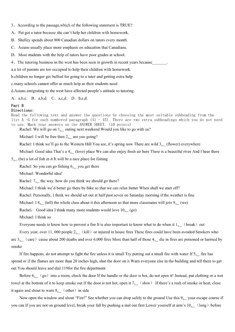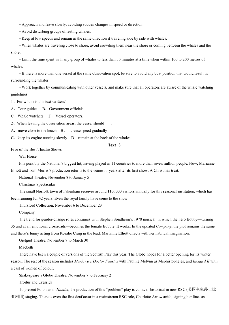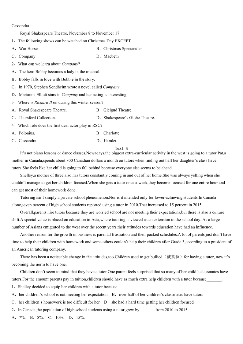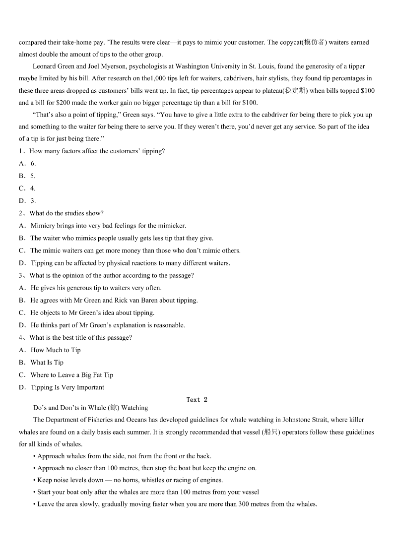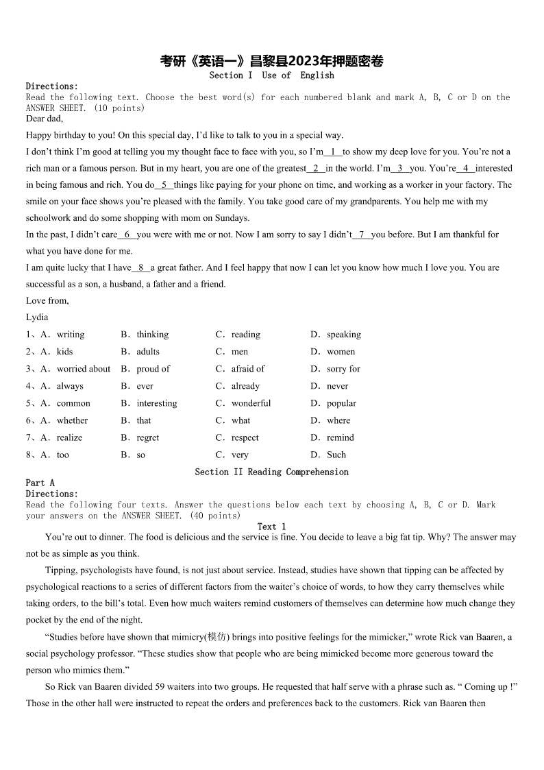 考研《英语一》昌黎县2023年押题密卷 SectionIUseofEnglish Directions: Readthefollowingtext.Choosethebestword(s)foreachnumberedblankandmarkA,B,CorDonthe ANSWERSHEET.(10points) Deardad, Happybirthdaytoyou!Onthisspecialday,I’dliketotalktoyouinaspecialway. Idon’tthinkI’mgoodattellingyoumythoughtfacetofacewithyou,soI’m1toshowmydeeploveforyou.You’renota richmanorafamousperson.Butinmyheart,youareoneofthegreatest2intheworld.I’m3you.You’re4interested inbeingfamousandrich.Youdo5thingslikepayingforyourphoneontime,andworkingasaworkerinyourfactory.The smileonyourfaceshowsyou’repleasedwiththefamily.Youtakegoodcareofmygrandparents.Youhelpmewithmy schoolworkanddosomeshoppingwithmomonSundays. Inthepast,Ididn’tcare6youwerewithmeornot.NowIamsorrytosayIdidn’t7youbefore.ButIamthankfulfor whatyouhavedoneforme. IamquiteluckythatIhave8agreatfather.AndIfeelhappythatnowIcanletyouknowhowmuchIloveyou.Youare successfulasason,ahusband,afatherandafriend. Lovefrom, Lydia 1、A.writingB.thinkingC.readingD.speaking 2、A.kidsB.adultsC.menD.women 3、A.worriedaboutB.proudofC.afraidofD.sorryfor 4、A.alwaysB.everC.alreadyD.never 5、A.commonB.interestingC.wonderfulD.popular 6、A.whetherB.thatC.whatD.where 7、A.realizeB.regretC.respectD.remind 8、A.tooB.soC.veryD.Such SectionIIReadingComprehension PartA Directions: Readthefollowingfourtexts.AnswerthequestionsbeloweachtextbychoosingA,B,CorD.Mark youranswersontheANSWERSHEET.(40points) Text1 You’reouttodinner.Thefoodisdeliciousandtheserviceisfine.Youdecidetoleaveabigfattip.Why?Theanswermay notbeassimpleasyouthink. Tipping,psychologistshavefound,isnotjustaboutservice.Instead,studieshaveshownthattippingcanbeaffectedby psychologicalreactionstoaseriesofdifferentfactorsfromthewaiter’schoiceofwords,tohowtheycarrythemselveswhile takingorders,tothebill’stotal.Evenhowmuchwaitersremindcustomersofthemselvescandeterminehowmuchchangethey pocketbytheendofthenight. “Studiesbeforehaveshownthatmimicry(模仿)bringsintopositivefeelingsforthemimicker,”wroteRickvanBaaren,a socialpsychologyprofessor.“Thesestu
