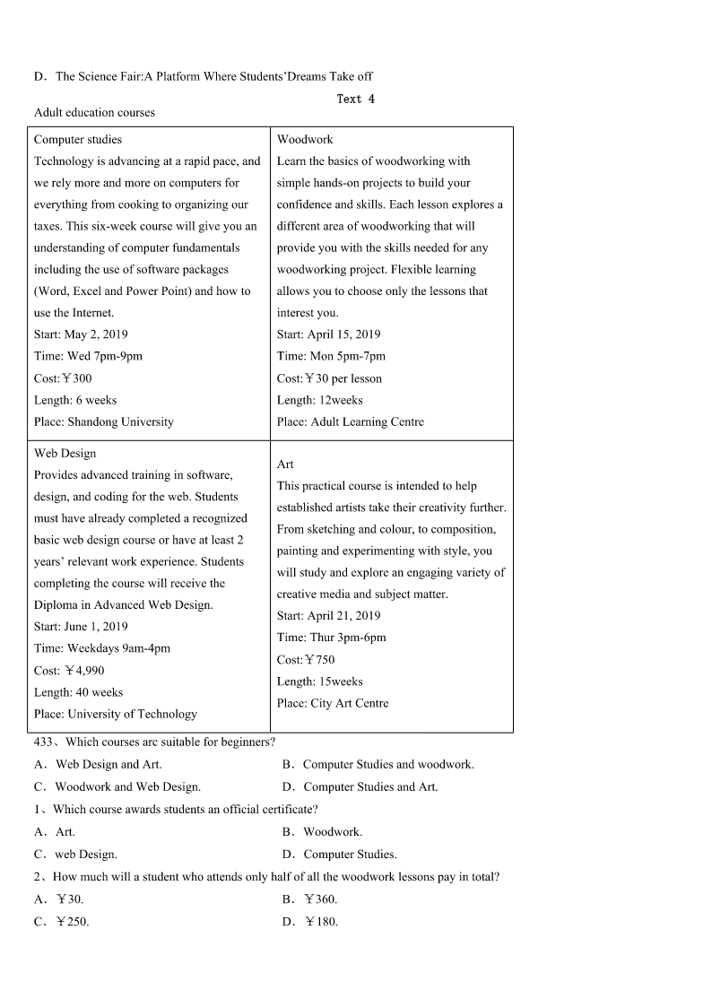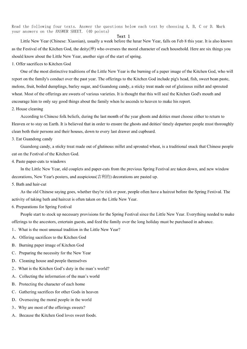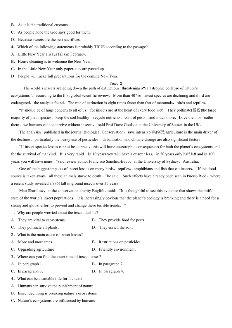 考研《英语一》松滋市2023年模拟试题 SectionIUseofEnglish Directions: Readthefollowingtext.Choosethebestword(s)foreachnumberedblankandmarkA,B,CorDonthe ANSWERSHEET.(10points) Communicationisanimportantpartofanyrelationship.Manyofusare1toshareourexperiencesoremotionswithour friends.Butwhenit'sourturntolenda(n)2,wesoonbecomeboredorareshortofideaonhowto3andofferadvice. That'sbecauseofwhatresearcherscall"listenerburnout(倦怠)”.Afriendmighttalktous4oftencomplainingaboutthe same5problems.Whenweofferquickadviceto6thesituation,wemaybeunconsciouslytryingto7urselvesfrom bumout.However,goodlisteners8theirnaturaltendencytosolvetheother'sproblemshurriedlyandtokeepthe conversationbrief. Tobeagood9,youneedtouse"activelistening".Itstartswiththereal10tohelpothersandthinkthroughtheir feelings.Don't11things.Youcanstartbyputtingyourphone12andsittingclosetoyourfriend.Letyourfacial expressions13一whatheorsheissaying14youareabletofullyunderstand,acknowledgetheotherperson's15by reflectingthemback:"Thatmustbereallyhardforyou.”Use16wordsorevensoundssuchas“yes”,"right”,and"hmm"”to 17theotherpersontocontinue. 0fcourse,a18canbeextremelyhardiftheotherpersonistoocritical.Butdon'tgetdefensive.Effectivelistenersdon't19 negativecriticism.Instead,theylistenandunderstandwhatthepersonlstryingtoconvey20responding. 1、A.afraidB.hesitantC.shyD.eager 2、A.shoulderB.handC.earD.eye 3、A.respondB.explainC.argueD.quit 4、A.aimlesslyB.endlesslyC.deliberatelyD.cautiously 5、A.difficultB.oldC.acuteD.sensitive 6、A.fixB.discussC.createD.describe 7、A.forgiveB.protectC.discourageD.prevent 8、A.followB.displayC.formD.overcome 9、A.readerB.partnerC.listenerD.speaker 10、A.demandB.habitC.desireD.ability 11、A.skipB.rushC.overlookD.postpone 12、A.awayB.offC.outD.up 13、A.recordB.restrictC.reflectD.replace 14、A.WhetherB.SinceC.WhileD.If 15、A.suggestionsB.purposesC.responsesD.feelings 16、A.bigB.toughC.strongD.shone 17、A.forceB.remindC.encourageD.convince 18、A.conversationB.suggestionC.problemD.lecture 19、A.giveupB.makeupC.leaveoutD.blockout 20、A.afterB.