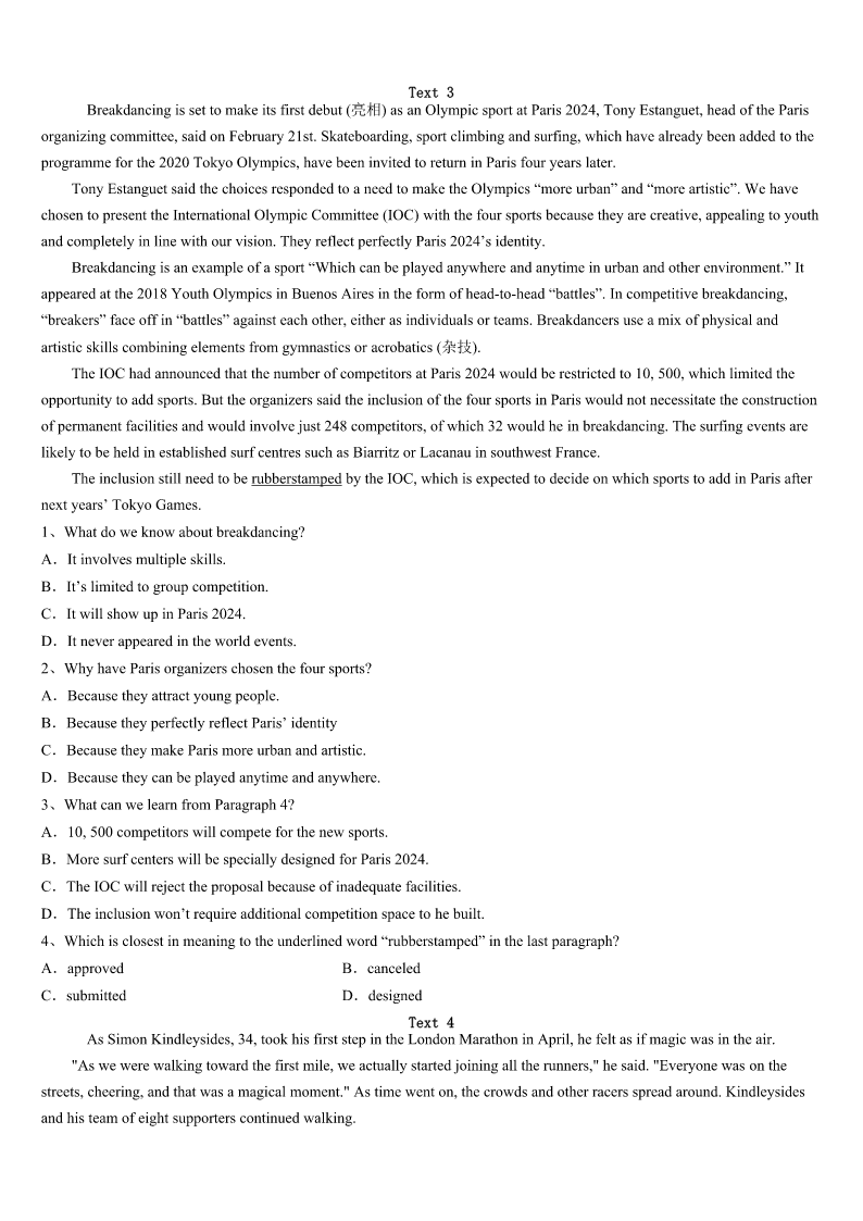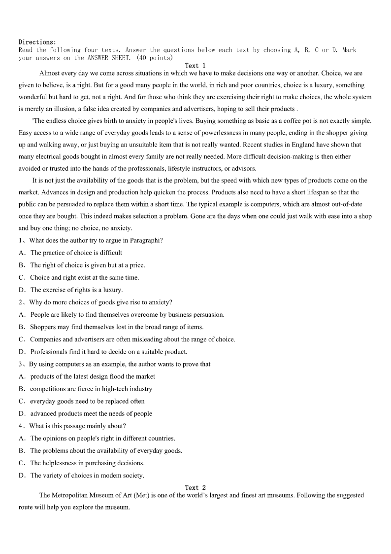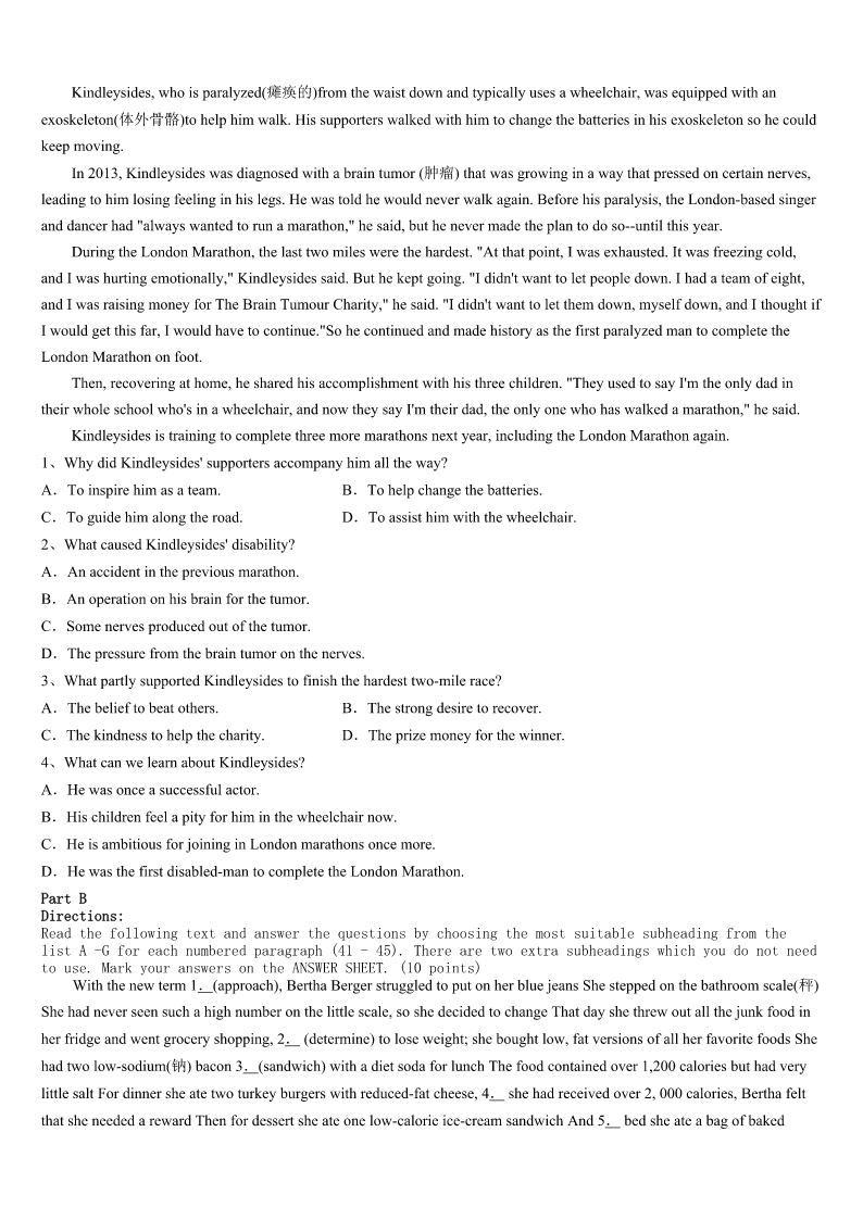 考研《英语一》曲靖市富源县2023年临考冲刺试卷 SectionIUseofEnglish Directions: Readthefollowingtext.Choosethebestword(s)foreachnumberedblankandmarkA,B,CorDonthe ANSWERSHEET.(10points) Ihavealwaysbeenanindependentperson,butIhavecometoknowthatbeingindependentdoesnotmeanrefusing help.Iam1askingforhelp,andItrytoaccept.Furthermore,Iwilleven2helpandwhensomeoneisintrouble,I3 walkaway.Andallthesechangescamefromanaccidentonanisland. Sometimesaperson’sindependenceisa4ofpride,daring,stubbornnessandluck.Iusedtobetoo5sinceIwas little.Iwasonceatravelerwhoneveraskedfor6,choosinginsteadtostrugglewithmapsandsignsuntilIfoundmyway. ThenonedayontheislandofKohPhangan,inThailand,everything7.IwasswimmingintheoceanwithSean,my fiance,whenhewas8byaboxjellyfish(箱型水母).He9withinthreeminutes,25yearsold.Yetwhenonlookersand travelersaskedifIwanted10,stubbornprideandforceofhabit11meaccepting.ButtwoyoungIsraeliwomenstayed. 12myprotest(反对),theywerewithmeevenwhenthepolicetriedtocoverupthe13ofSean’sdeath.Itwaslistedas drunkdrowningtoavoidhurtingthe14industry.TheIsraeliwomen15havewalkedaway.16,withouteventelling me,they17theirscheduleratherthanleavemebehind. 18Ididn’trealizeitatthattime,Iwouldnothave19thedisasterwithoutthesegreatwomen.Actually,theperson whoneedshelpthemostisusuallythelastpersontoaskforit.Ihavelearned20isbetterthanrefusingbecauseitnotonly helpsyouwalkoutoftrouble,butalsohelpsyouknowtherealmeaningoflife. 1、A.strugglingB.dealingC.confusedD.satisfied 2、A.offerB.acceptC.seekD.desire 3、A.occasionallyB.frequentlyC.usuallyD.seldom 4、A.rangeB.symbolC.wayD.mix 5、A.adventurousB.braveC.independentD.creative 6、A.moneyB.equipmentC.directionsD.suggestions 7、A.happenedB.messedC.changedD.disappeared 8、A.attackedB.caughtC.followedD.impressed 9、A.sunkB.diedC.failedD.recovered 10、A.companyB.adviceC.comfortD.evidence 11、A.keptB.preventedC.deniedD.suggested 12、A.InspiteofB.IncaseofC.IntermsofD.Asaresult 13、A.proofB.newsC.factD.cause 14、A.medicineB.entertainmentC.fishingD.tourism 15、A.couldB.needC.shouldD.must 16、A.ThereforeB.Oth