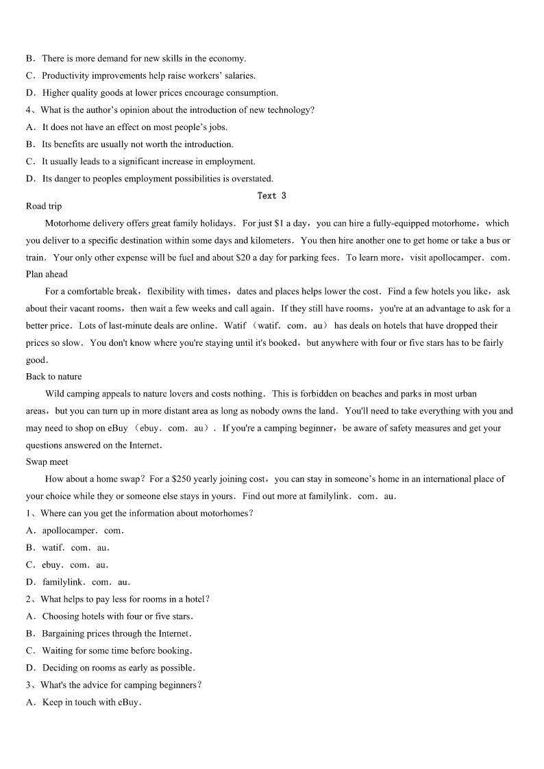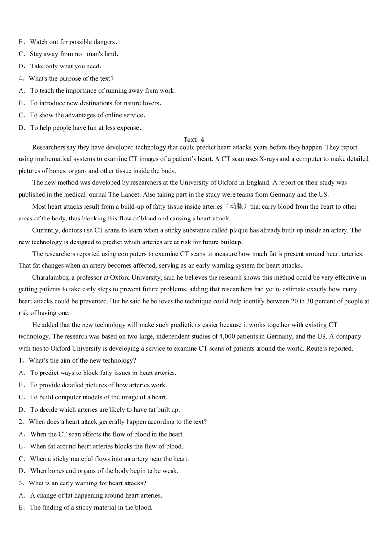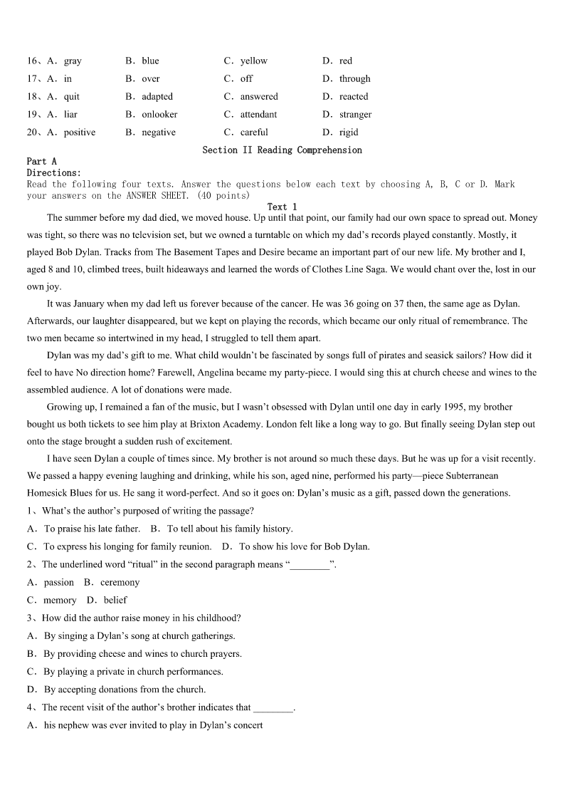 考研《英语一》昆明市嵩明县2023年临考冲刺试题 SectionIUseofEnglish Directions: Readthefollowingtext.Choosethebestword(s)foreachnumberedblankandmarkA,B,CorDonthe ANSWERSHEET.(10points) Optimismandpessimismarebothpowerfulforces.Eachofusmustchoosewhichwewantto1ourfutureandour expectations.Wecanchoosetolaughorcry,blessor2.It’sourdecision:fromwhichperspectivedowewanttoviewlife? Willwelookupin3ordownindesperation? Ibelieveintheupwardlook.Ichooseto4thepositiveandskiprightoverthenegative. Anoptimisticattitudeisnotaluxury(奢侈品);it’sa(n)5.Thewayyoulookatlifewilldeterminehowyoufeel,how youperform,andhowwellyouwillgetalongwithotherpeople.6,negativethoughts,attitudes,andexpectations7 themselves;theybecomeaself-fulfillingprophecy(预言).Pessimismcreatesadarkplacewherenoonewantstolive. Yearsago,Idroveintoaservicestationtogetsomegas.Itwasabeautifulday,andIwasfeelinggreat.AsIwalkedinto thestationtopayforthegas,theattendantsaidtome,“Howdoyoufeel?”Thatseemedlikea(n)8question,butIfeltfine andtoldhimso.“Youdon’tlookwell,”hereplied.This9mecompletelybysurprise.Alittle10confidently,Itoldhim thatIhad11feltbetter.Withouthesitation,hecontinuedtotellmehowbadIlookedandthatmyskinappearedyellow. BythetimeIlefttheservicestation,Iwasfeelingalittle12.Aboutablockaway,I13overtothesideoftheroad tolookatmyfaceinthemirror.HowdidIfeel?WasIaffectedwithjaundice(黄疸)?Waseveryallright?BythetimeIgot home,Iwasbeginningtofeelalittlenauseous(恶心).DidIhaveabadliver?HadI14someraredisease? Onanotherbeautifulday,whenIwentintothatgasstation,feeling15again,Ifiguredoutwhathadhappened.The placehadrecentlybeenpaintedabright,distasteful16,andthelightreflecting17thewallsmadeeveryoneinsidelookas thoughtheyhadhepatitis(肝炎)!Iwonderedhowmanyotherfolkshad18thewayIdid.Ihadletoneshortconversation withatotal19changemyattitudeforanentireday.HetoldmeIlookedsick,andbeforelong,I wasactuallyfeelingsick.Thatsingle20observationhadagreateffectonthewayIfeltandacted. Theonlythingmorepowerfulthannegativismisawordofoptimismandhope.Whenawholecultureadoptsanupward look,in