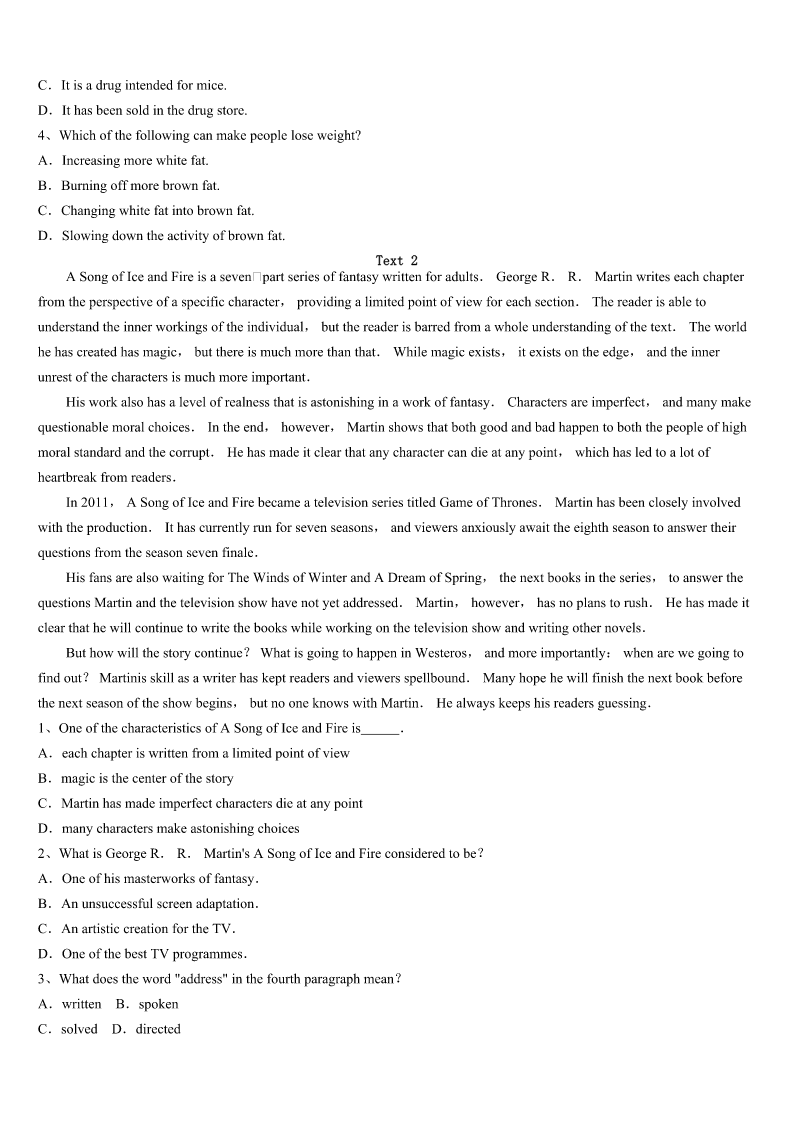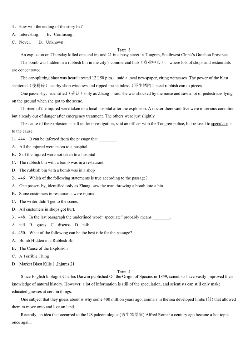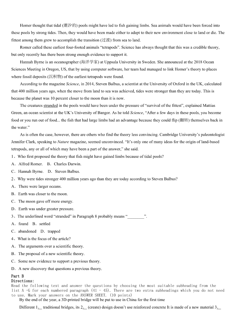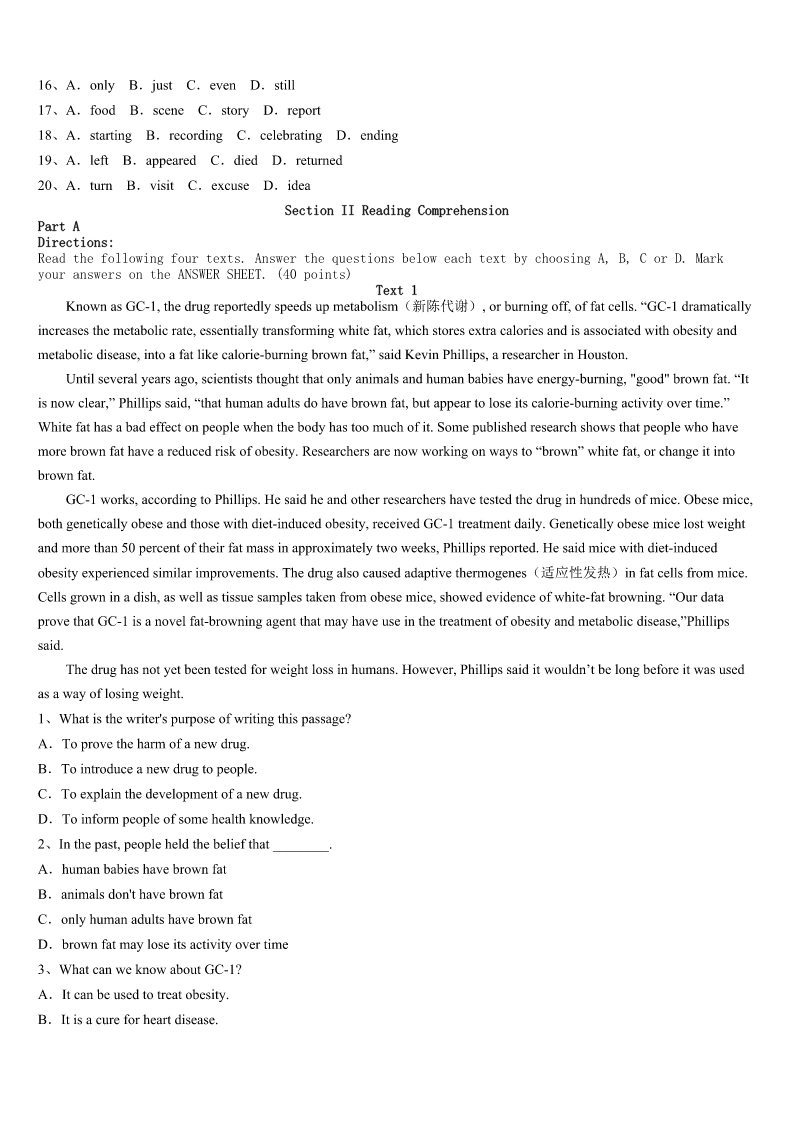 2023年平舆县考研《英语一》考前冲刺预测试卷 SectionIUseofEnglish Directions: Readthefollowingtext.Choosethebestword(s)foreachnumberedblankandmarkA,B,CorDonthe ANSWERSHEET.(10points) TheplanfortheannualChristmasDinnerforThoseAloneandHomelessstartedbetweentwochurchmemberswho happenedtoshareaplaneridebacktoSpringfield. SpringfieldphysicianF.T.“Hogan”H’DoublerJr.toldGaryEllisonhewas1aboutthosewhoheknewwere2 duringtheupcomingholidays.Hewantedtohelpthem. Hesaid,“Ifyoudon’thave3withyou,thefactthateverything,atChristmasis‘familythisandfamilythat’canbe4 Wouldn’titbegreat5ourchurchcouldhaveabigChristmasdinner-freeof6?” Iftheywantedthebigdinnerheldinthechurch,admissionofthepreacher(牧师)wasverynecessary.Therefore,H’ DoubleraskedEllisonifhecould7thepreachertoallowthedinner.H’Doublerwouldputupasizable8.“Heimagined aniceeventwithnostrings(附加条件)attached,”saidEllison. Withthephysician9themaincourse,otherchurchmembersofferedsidedishesanddesserts. Afterafewyears,thechurchpickeduptheexpenses.“Thefirst10mayhavedrawn200people,”Ellisonsaid,“but someyearsitmaydrawcloseto20.” Inorderthatthechurchcan11fortherightsizecrowd,peoplewhowantto12areaskedtocallananswering serviceandselectthetimetheywillcomeinadvance.Ellisonsaidchurchmemberswoulddotheirbesttomakeeveryonefeel 13.Overtheyearshe’senjoyedseeingstrangerssocialize. H’Doubleralwayssmiledwhenhereadorheardreportsoftheevent’s14,hisdaughterSarahMueggesaid.“Hewas very15withthewayitdeveloped,”saidEllison.“It’s16thewayH’Doublerexpectedit:nostringsattached.Justfun andgood17,”saidEllison. H’Doublerpreferredtokeepsecrethisrolein18theevent,buthe19recentlyattheageof85.EllisonaskedH’ Doubler’sdaughterifitwasOKtotellpeoplethatitwasH’Doubler’s20andmoneythatstartedthetradition.Andshesaid yes. 1、A.concernedB.confusedC.curiousD.doubtful 2、A.abnormalB.abroadC.aloneD.asleep 3、A.familyB.friendsC.neighborsD.children 4、A.excitingB.obviousC.interestingD.painful 5、A.unlessB.untilC.thoughD.if 6、A.costB.timeC.chargeD.game 7、A.forceB.warnC.convinceD.order 8、A.serviceB.buildingC.tableD.don