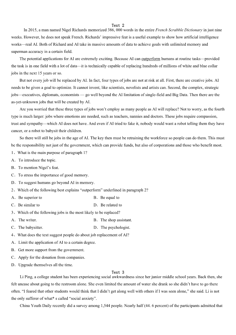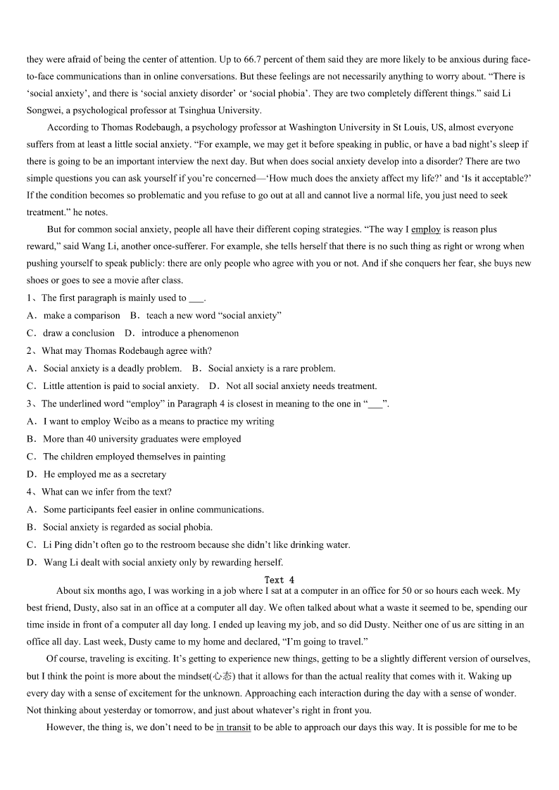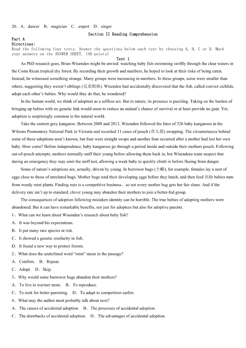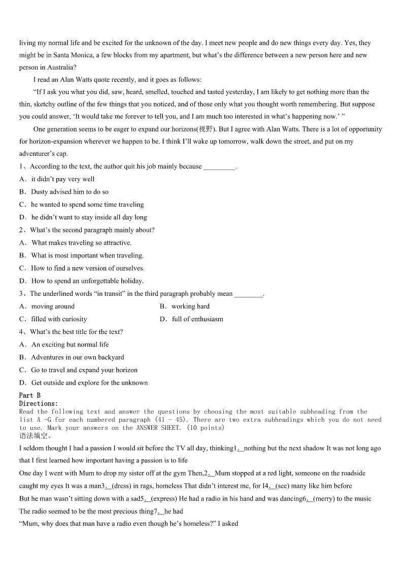 考研《英语一》永州市新田县2023年考前冲刺试题 SectionIUseofEnglish Directions: Readthefollowingtext.Choosethebestword(s)foreachnumberedblankandmarkA,B,CorDonthe ANSWERSHEET.(10points) Whenyouarelivingafully---scheduledlife,everyminutecounts.Nomatterhowmanywaysyoudivideyour1, there’sneverenoughtimeinadaytocatchup. Sixyearsago,Iwas2withacare-free,stop-and---smell-the-rosestypesof3.WhenIneededtorushout,shewas takinghersweet.4pickingoutapurseandashiningcrown.WhenIneededtohavea5lunch,she’dstopaspeaktothe elderlywomanwholookedlikehergrandma.Whenevermychildcausedmetodeviate(偏离)frommymain6,Ithoughtto myself,wedon’thavetimeforthis.7,thetwowordsImostcommonlyspoketomylittleloveroflifewere,“8!” Thenoneday,things9.We’djustpickedupmyolderdaughterfromkindergartenandweregettingoutofthecar. Seeingherlittlesisternotgoingfastenoughforherliking,myolderdaughtersaid,“youareso10.”Whentheolderone crossedherownarms,itdawnedonme(我渐渐明白)thatherannoyedlook11thatofmine.Isawthedamagemyhurried existencewasdoingno12ofmychildren. Thoughmy13toslowdownwasmadealmostthreeyearsago,Livingataslowerpacestilltakesgreateffort.My youngerdaughterismyliving14ofwhyImustkeeptrying.Infact,sheremindedmeonceagaintheotherday.WhenI thoughtmylittlechildwasgoingtoeatthelast15ofanicecream,sheheldoutaspoonfulofit."Isavedthelastforyou," shesaid.Atthatmoment,I16I'djustgotthedealofalifetime.Igavemychildalittletime,andunexpectedly,17,she remindedmethatthingstaste18andlovecomeseasierwhenyoustop19throughlife. Pausingtodelightinthesimplejoysofdailylifeistheonlywaytotrulylive.Trustme,Ilearnedfromtheworld'sborn 20injoyfulliving. 1、A.attentionB.memoryC.loveD.experience 2、A.boredB.blessedC.contentD.patient 3、A.sisterB.grandmaC.sonD.daughter 4、A.timeB.icecreamC.stepD.lunch 5、A.bigB.quickC.nutritiousD.joyful 6、A.goalB.responsibilityC.scheduleD.interest 7、A.ConsequentlyB.FranklyC.SurprisinglyD.Unusually 8、A.CheerupB.PullupC.ShutupD.Hurryup 9、A.improvedB.changedC.appearedD.worsened 10、A.sillyB.excitedC.carefulD.slow 11、A.silencedB.contradictedC.mirroredD.enc