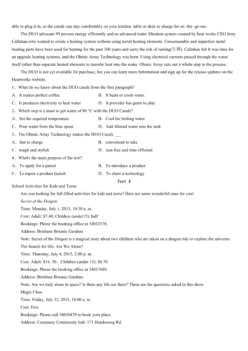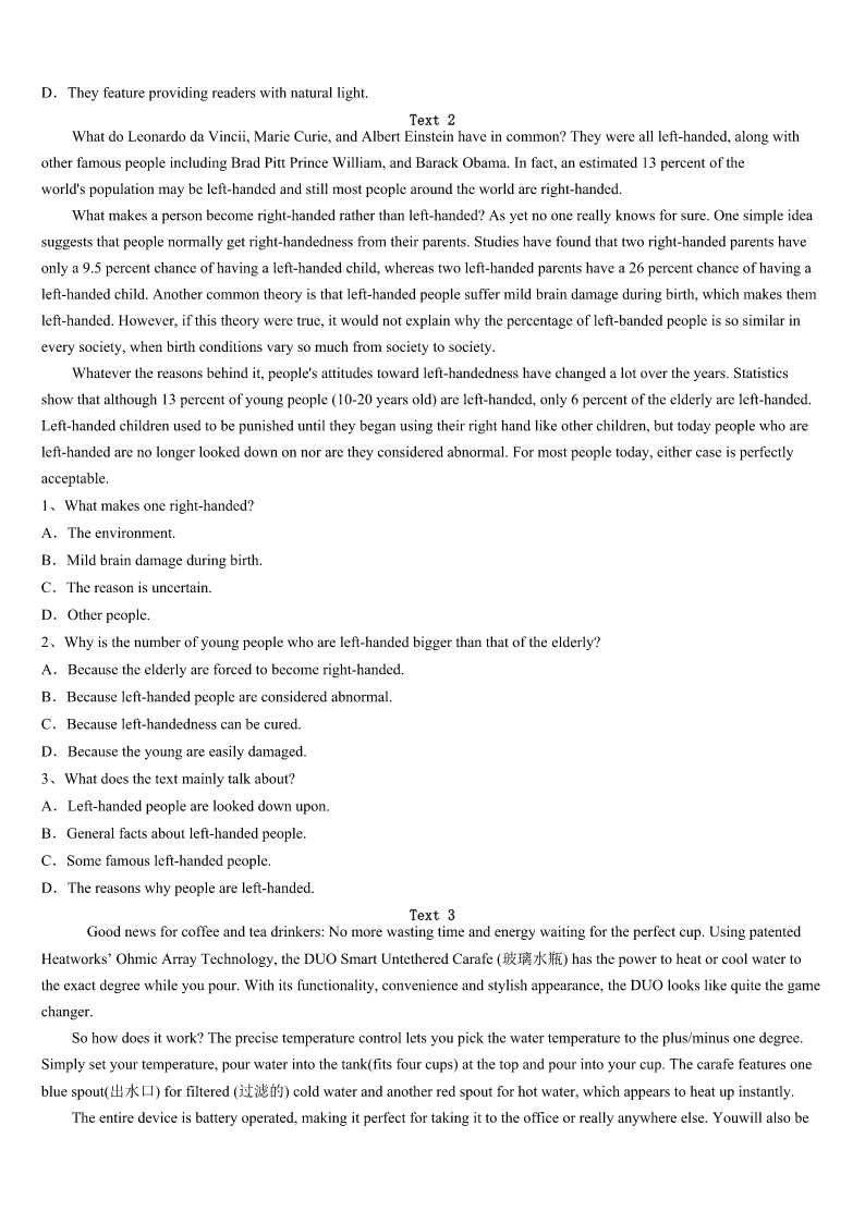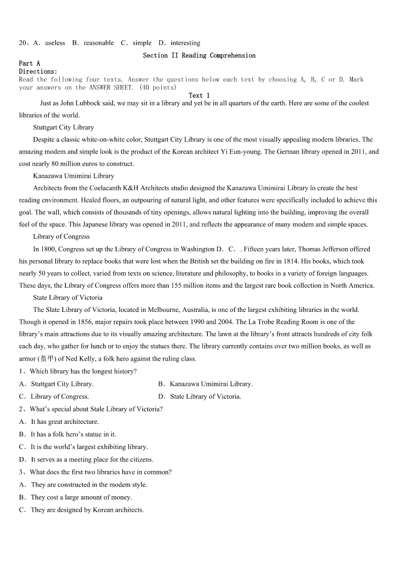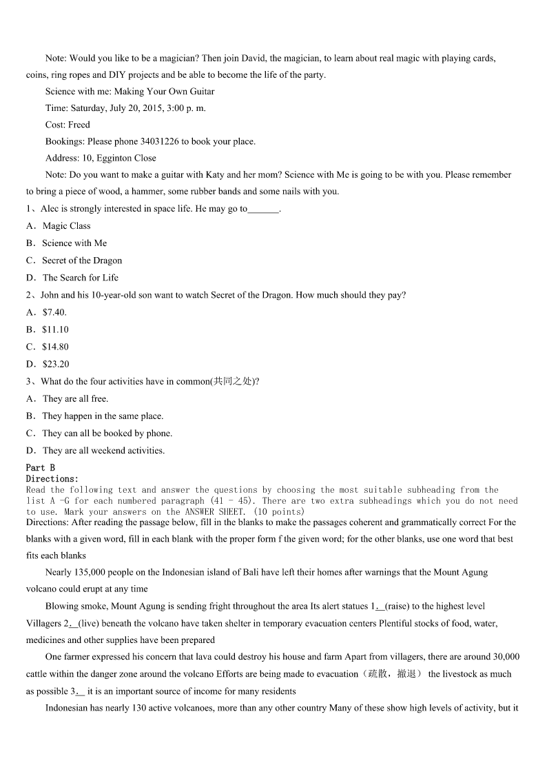 考研《英语一》汕头市龙湖区2023年统考试题 SectionIUseofEnglish Directions: Readthefollowingtext.Choosethebestword(s)foreachnumberedblankandmarkA,B,CorDonthe ANSWERSHEET.(10points) Speakingtwolanguagescanactuallyhelpreducesomeeffectsofagingonthebrain,anewstudyhasfound. Researcherstestedhowlongparticipantsneededto1fromonecognitive(认知)tasktoanother,somethingthat’s knownto2longerforolderadults,saidleadresearcher,BrainGold,anexpertattheUniversityofKentucky,“Ithasgreat effectsthesedaysbecauseourpopulationis3gradually,”Goldsaid.“Seniorsare4longer,andthat’sagoodthing,but it’sonlyagoodthing5acertaindegreethattheirbrainsare6.” Gold’steamcomparedtask-switchingofyoungerandolder7,knowingtheywouldfindslowerspeedsinthe8 populationbecauseofpreviousstudies.9,theyfoundthatolderadultswhospoketwolanguageswereabletoswitchmental gear(齿轮)10thanthosewhodidn’t. First,Goldandhisteam1130people,whowereeitherbilingual(双语的)12monolingual(单语的),tolookata seriesofcoloredshapesand13withthenameofeachshapebypushingabutton.Then,they14theparticipantswitha similarseriesofcoloredshapesandaskedthemtorespondwithwhat15theshapeswerebypushingabutton.Thebilingual peoplehadthe16torespondfastertotheshiftingprompts(提示). Researchersthengathered80morepeopleforasecond17;40bilingualsand40monolinguals.Thistime,researchers usedFMRImachinesto18brainactivityduringthesameshape-andcolor-identifying19.Goldandhisteamfoundthat bilingualpeoplehaddifferentbrainactivitythantheirmonolingualpeers. “Learningasecondlanguageinchildhoodwasthoughtofas20,”Goldsaid.“Actually,it’sbeneficial.” 1、A.switchB.performC.jumpD.transport 2、A.holdB.spendC.lastD.take 3、A.increasingB.agingC.growingD.exploding 4、A.survivingB.stayingC.livingD.expecting 5、A.withB.inC.atD.to 6、A.powerfulB.healthyC.sensitiveD.special 7、A.adultsB.researchersC.leadersD.seniors 8、A.randomB.ordinaryC.olderD.younger 9、A.ThusB.OtherwiseC.BesidesD.However 10、A.fasterB.slowerC.longerD.better 11、A.paidB.askedC.promisedD.forced 12、A.yetB.norC.orD.and 13、A.rememberB.realizeC.recallD.reply 14、A.presented