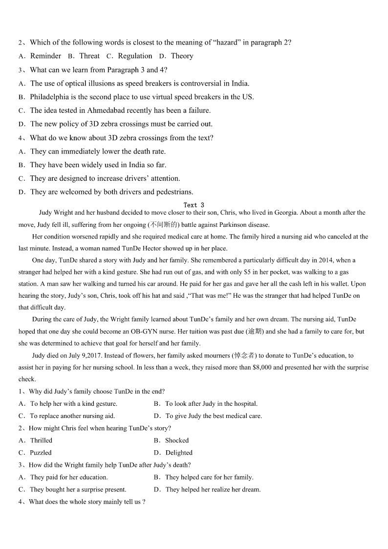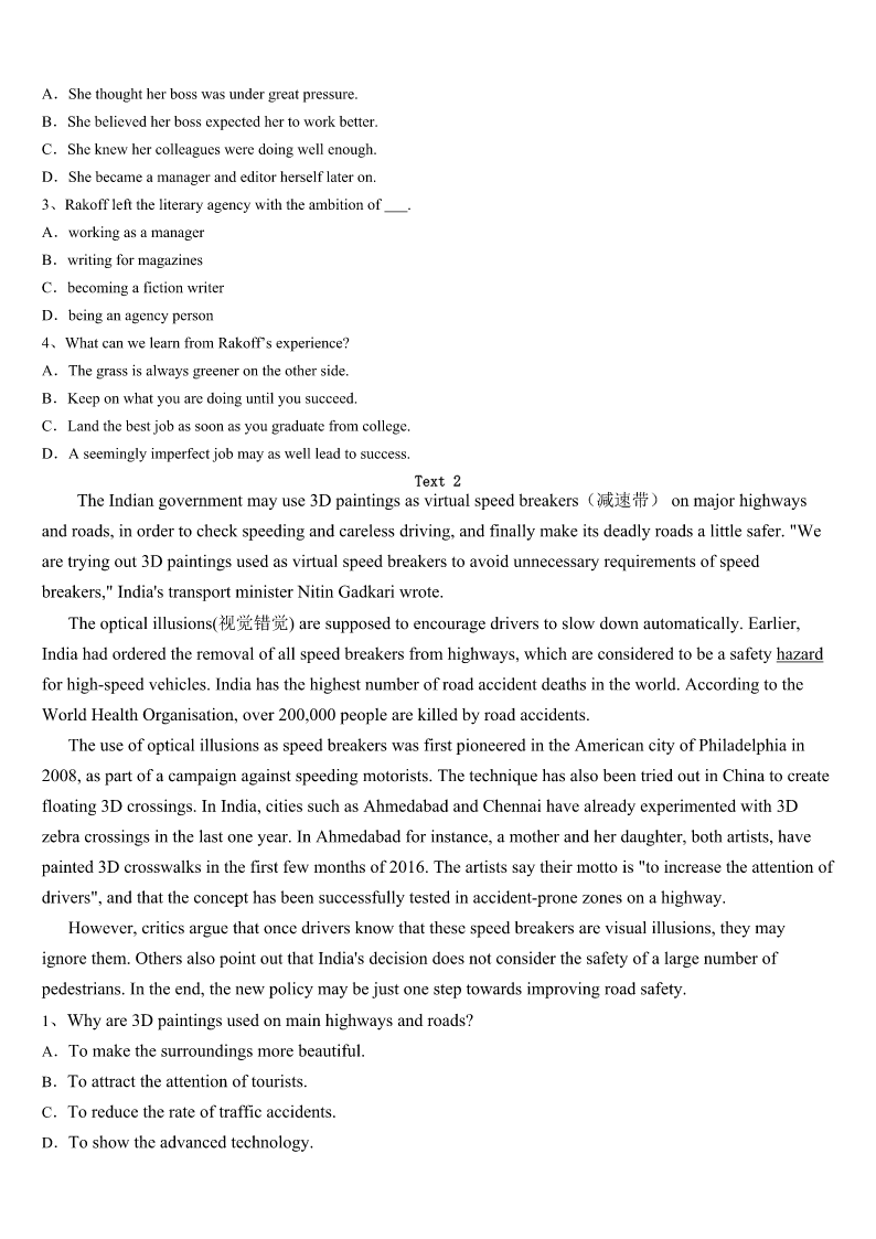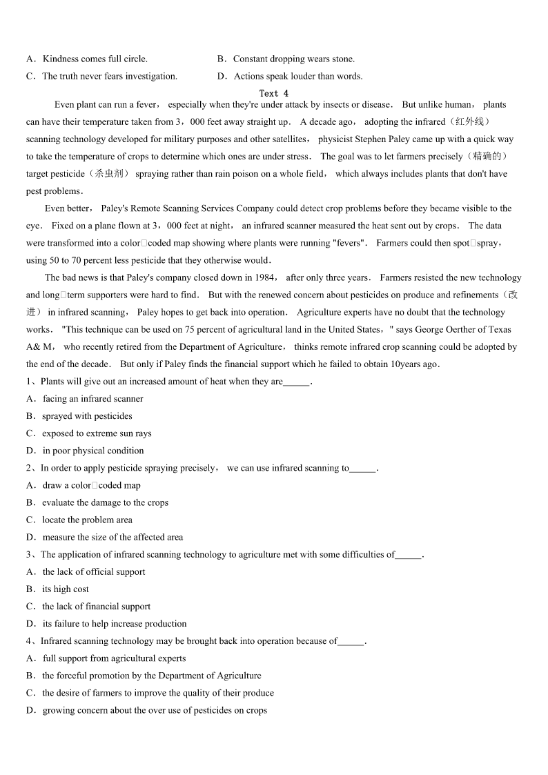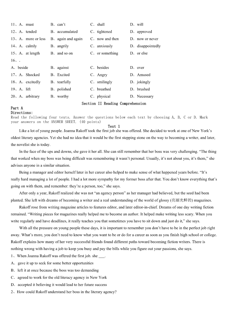 2023年广州市番禺区考研《英语一》预测试题 SectionIUseofEnglish Directions: Readthefollowingtext.Choosethebestword(s)foreachnumberedblankandmarkA,B,CorDonthe ANSWERSHEET.(10points) 完型填空(共20小题, 阅读下面短文,掌握其大意,然后从36—55各题所给的四个选项(A、B、C和D)中,选出最佳选项,并在答题卡上 涂黑。 MymotherattendedcollegeduringthedaywhilemysisterwasinschoolandIwasindaycare.OnedayatdaycareI1her daughter.Themotherrefusedherlittlegirl’srequesttogotoMcDonaldsfordinnerandthedaughterimmediately2overthe floor,kickingandscreaming,"IwanttogotoMcDonalds."3hermothertriedstoppedhercrying.Finallyhermothergave in,thegirlstoppedcryingandtheyleft.TosayIwasamazedwouldbe4,Iwasdelightedthat5Iwantedcouldbegotin thesameway. Thatdaymymotherpickedmeupearlyfromdaycare6wewerecollectingourChristmasshopping.Aswewalked throughthetoysection,Isawa7Ihadtohave.Itwasawhiteandredtelephonewhosebells8asitwaspulledalongona string. 9lovinglyatmymother,Iasked,"Mama,10Ihavethattelephone?"Shereplied,"Notnow,butifyouareagoodgirl maybeSantawillbringittoyou."AsIinsisted,hereyesnarrowedandherhand11onmine. Bynowwewerestandinginthelongline,andIfigureditwas12.Ilaydownonthegroundandbeganscreaming."Iwant thattelephone."TiredChristmasshopperslookedasmymother13said,"Becky,you’dbettergetupbythecountofthree 14." Nothinghappened.Sothenshelay15meonthefloor,andbegankickingandscreaming,"Iwantanewcar,Iwantanew house,Iwantsomejewelry,Iwant…"16,Istoodup. "Mama,stop.Mama,getup,"I17said. Shestood,and18herselfoff.Atfirstastonished,theotherswaitinginlinebegantoclap.Andastheywereleaving,they saidwithasmile,"Yourmomgotyourgood.Ibetyou’llnevertrythatagain." AndIdidn’t,becauseitleftalastingmentalpicturemoreeffectivethanany19mark. 1、A.lookedB.foundC.observedD.watched 2、. A.pickupB.holdupC.makeupD.hangup 3、. A.knockedB.fellC.cameD.took 4、. A.AnythingB.SomethingC.NothingD.Everything 5、A.enoughB.abruptC.impossibleD.inaccurate 6、A.howeverB.wheneverC.whateverD.whichever 7、A.whereB.becauseC.thoughD.after 8、A.toyB.bellC.ringD.doll 9、A.hungB.burstC.stayedD.rang 10、A.LookingupB.HoldingupC.CarryingonD.Goingthr